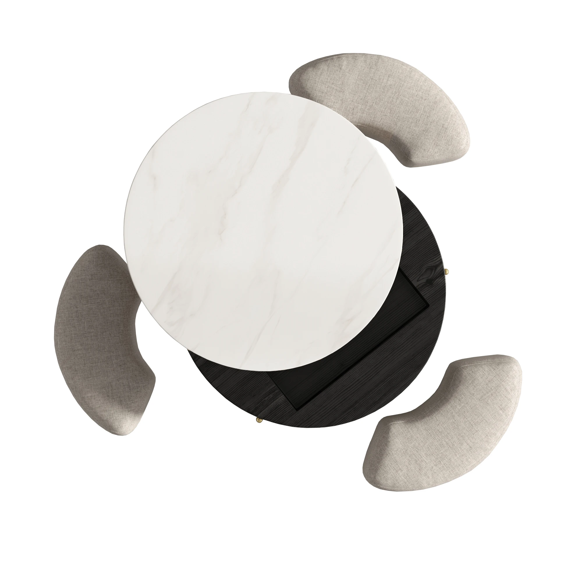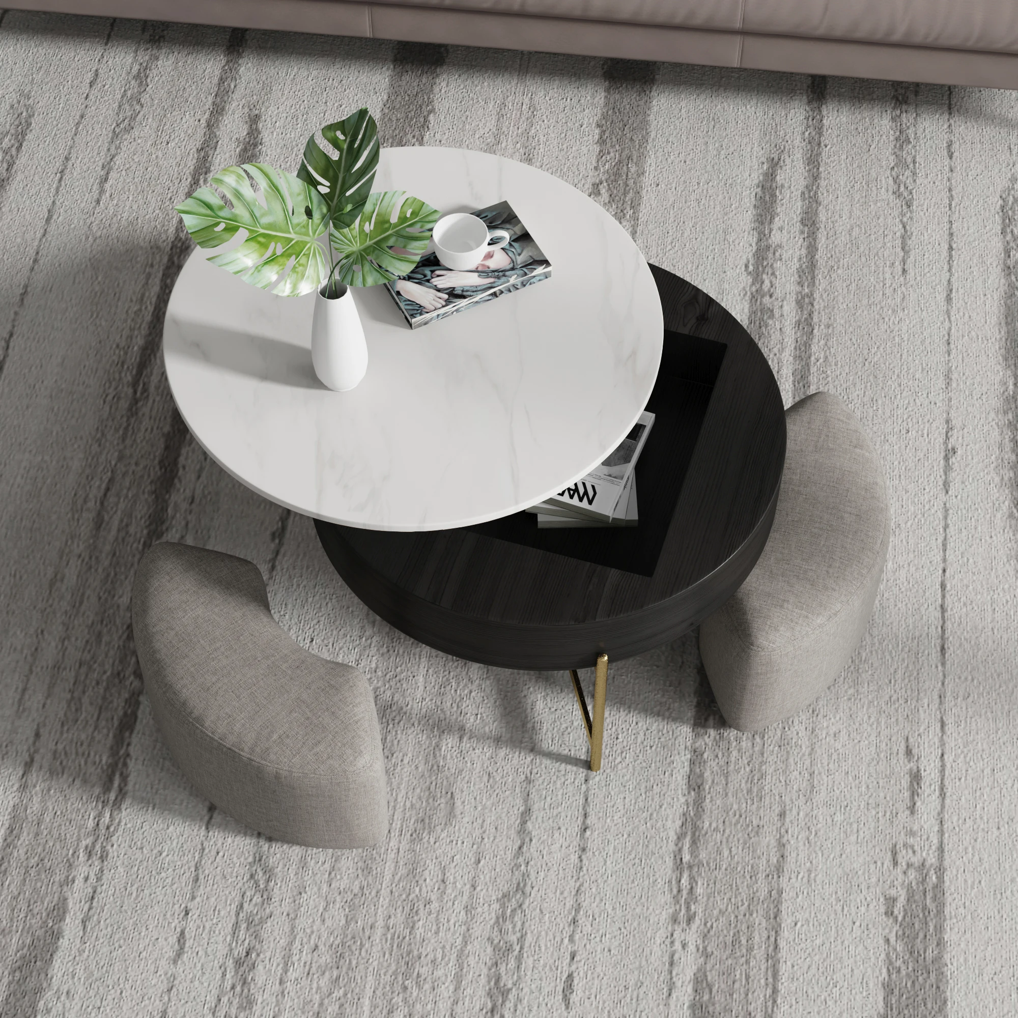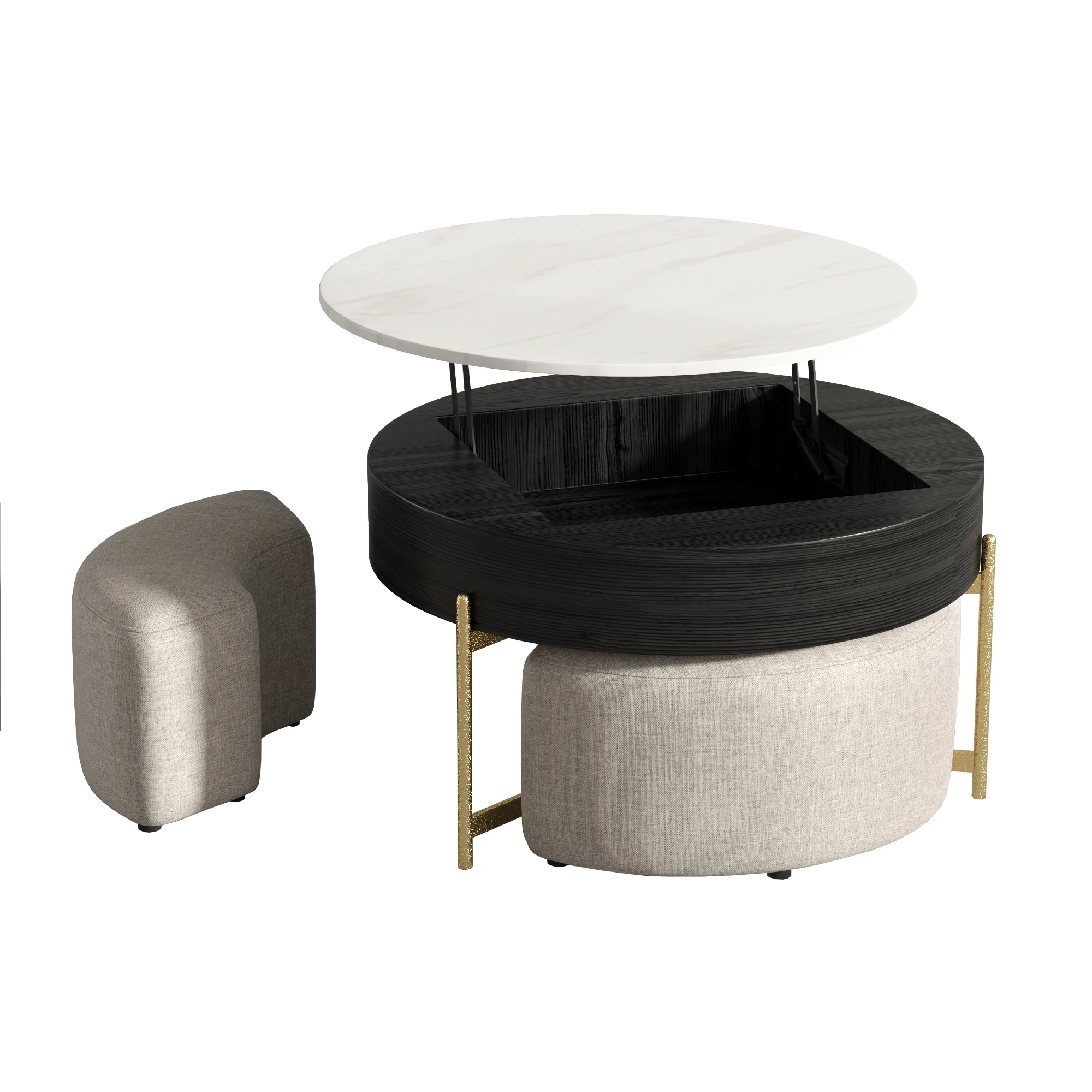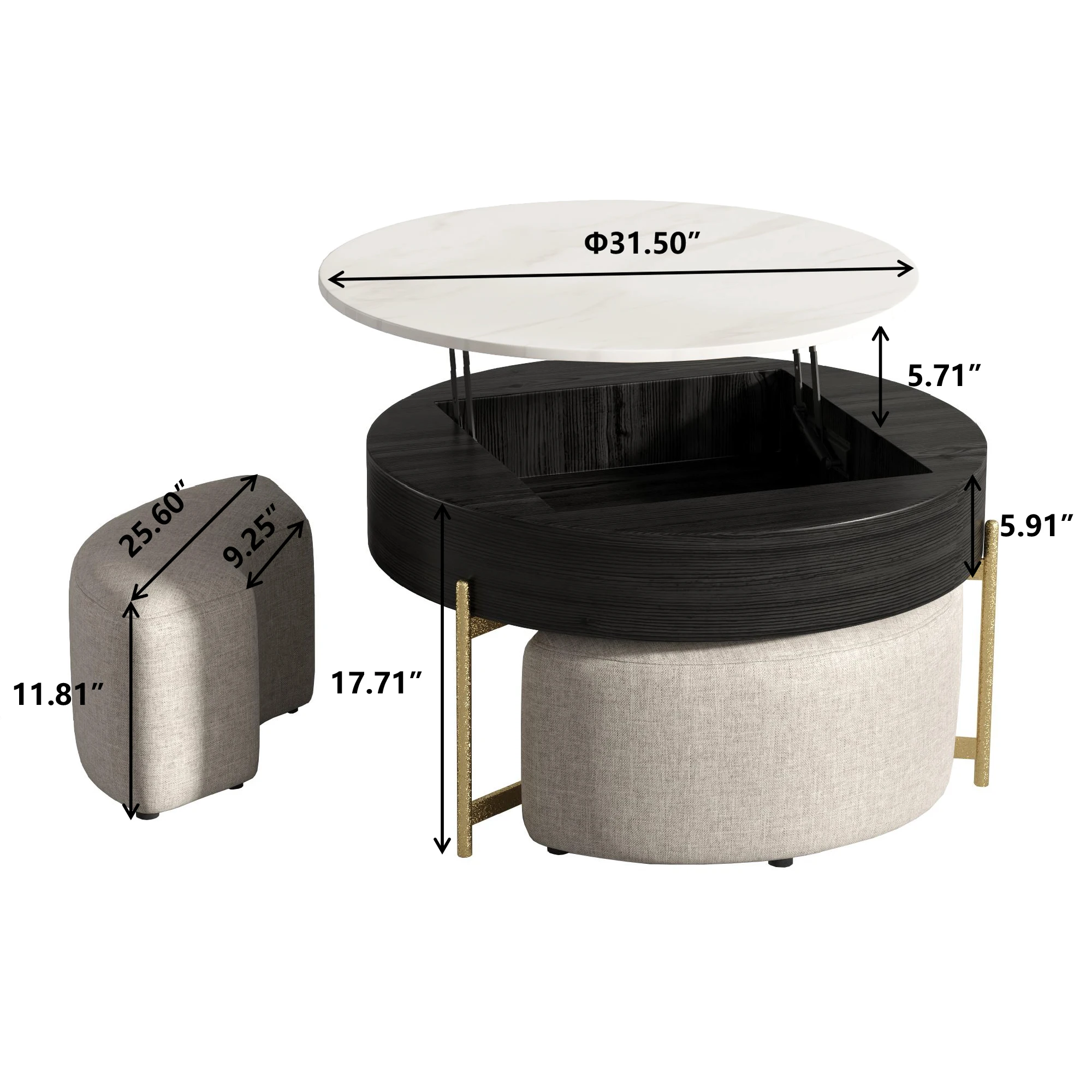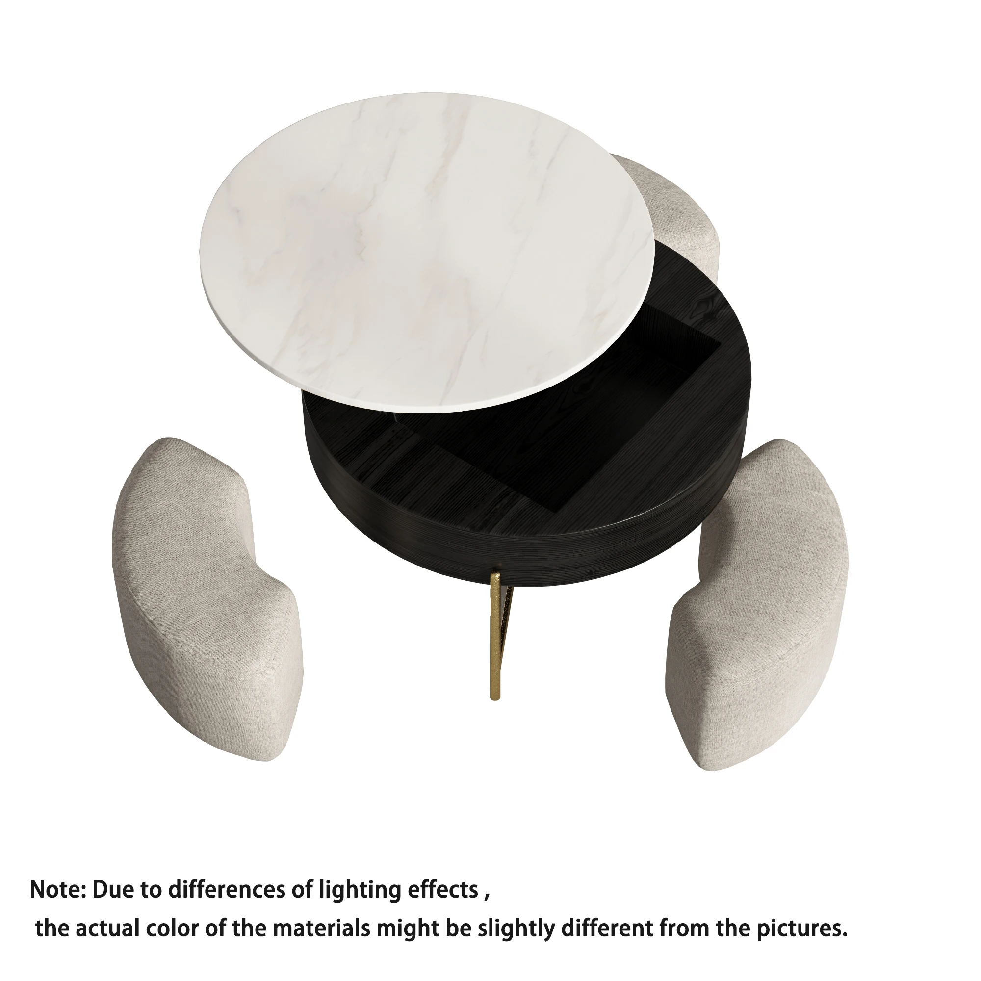 31.5" Round Marbling Pattern Slate Coffee Table with Storage 3 Stools Wood Rustic Boho Lift Top Coffee Table Set for Living Room