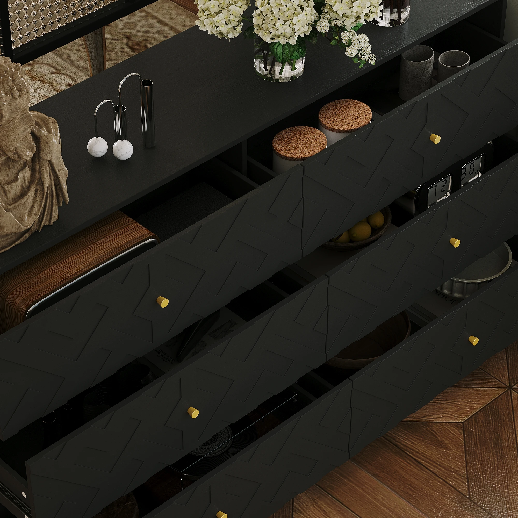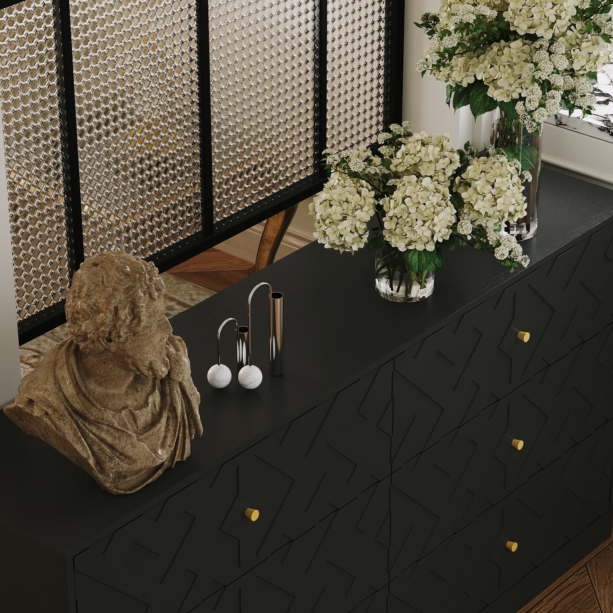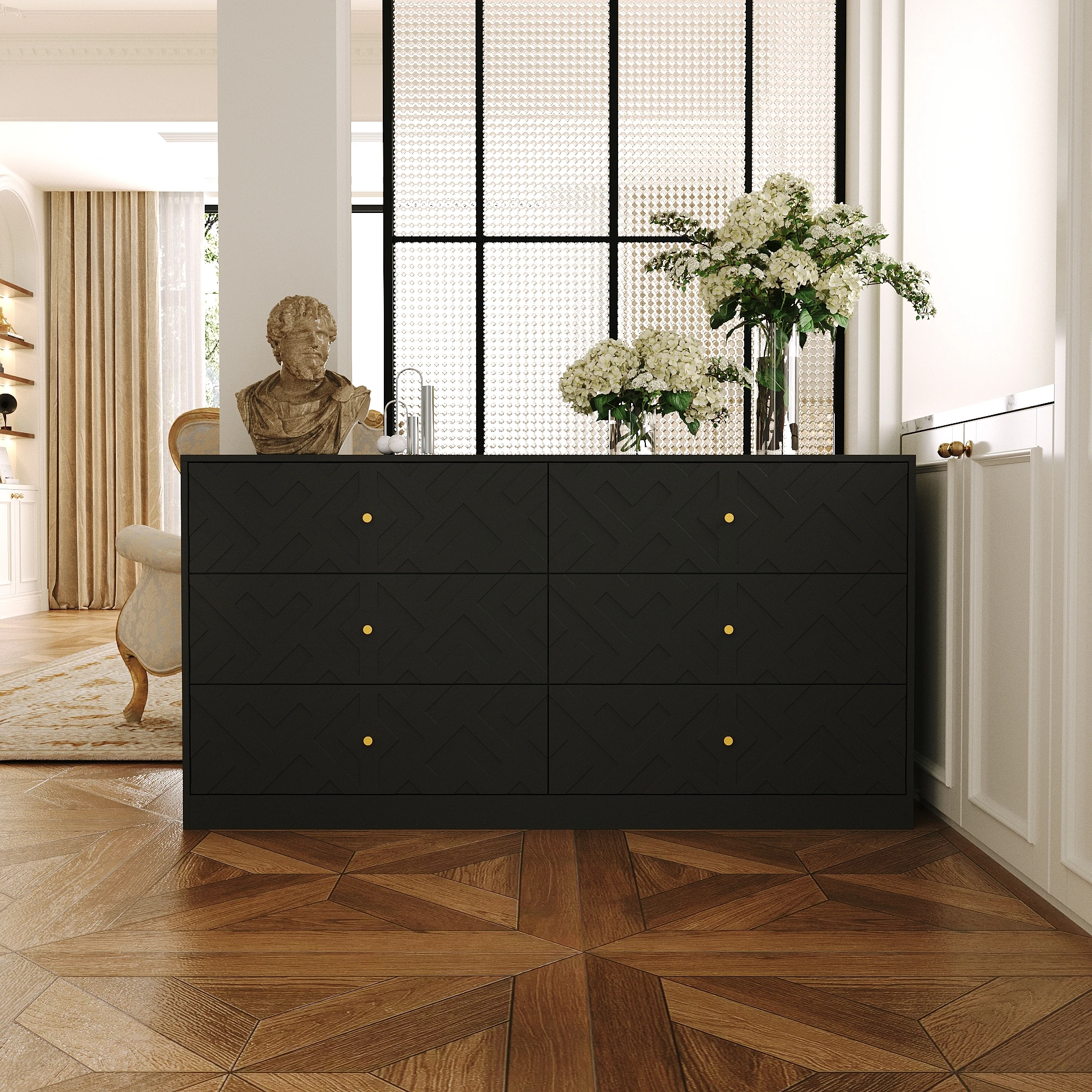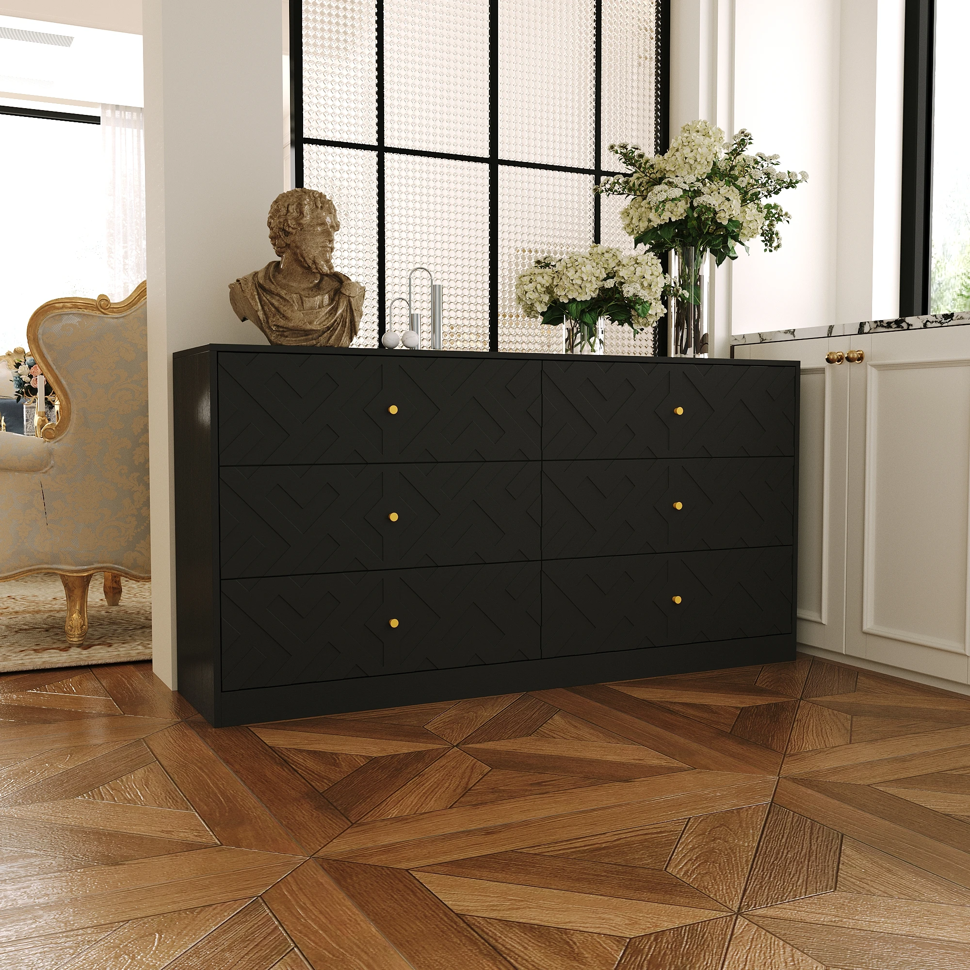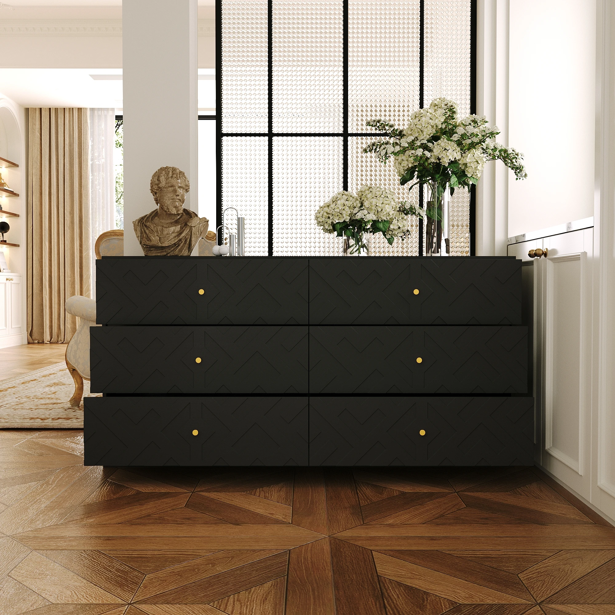 Chest of Drawers with Relief Pattern & Gold Handles, Morden Storage Cabinet with 6 Drawers for Living Room, Black