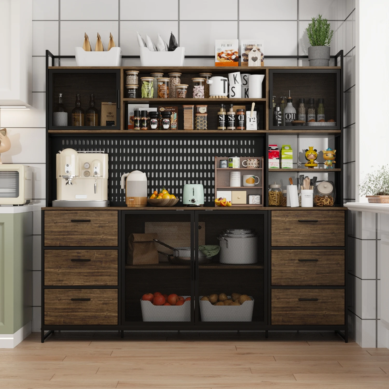 Kitchen Hutch with 6 Drawers, 4 Mesh Doors & Open Shelves, Pantry Buffet Cabinet with Pegboard, Brown & Black