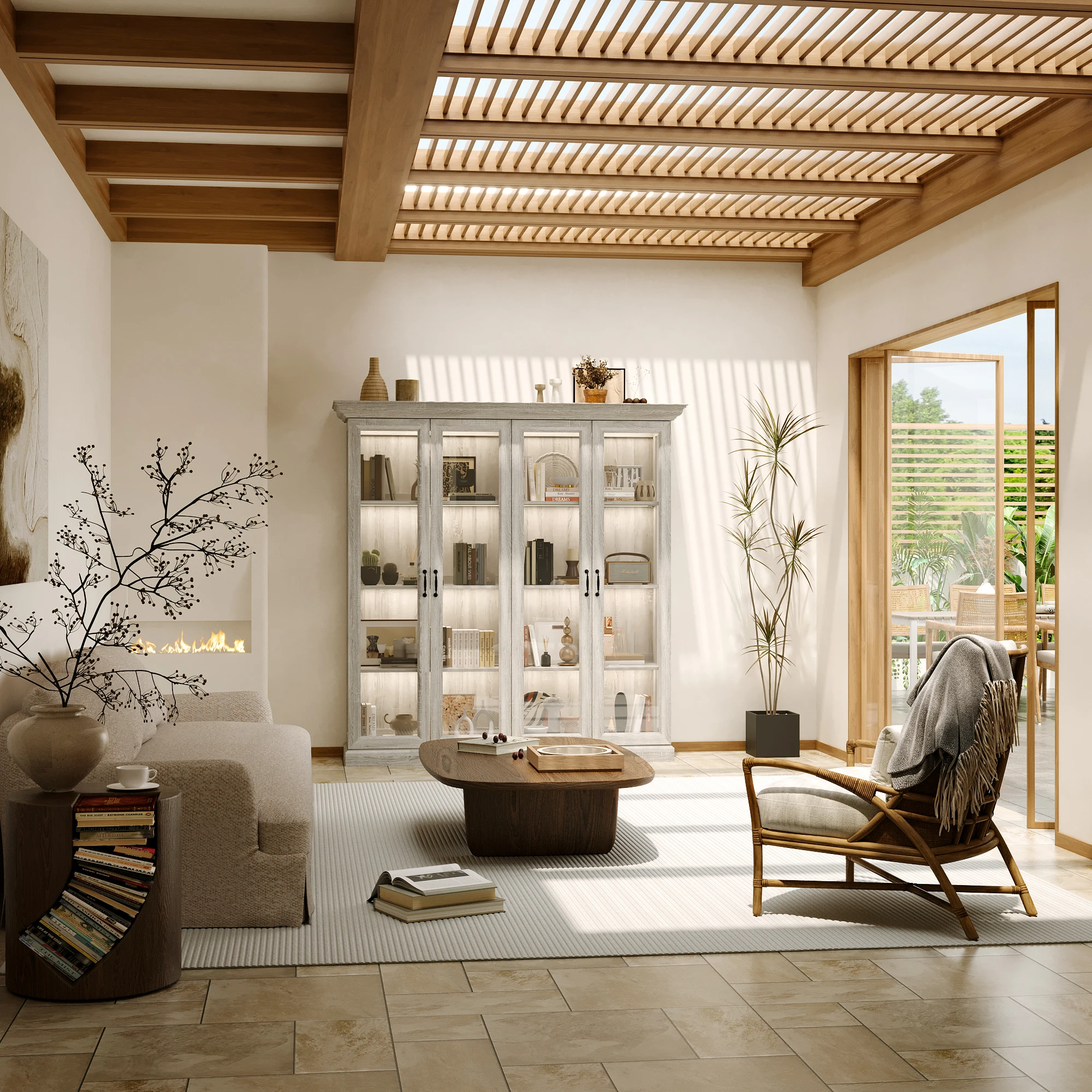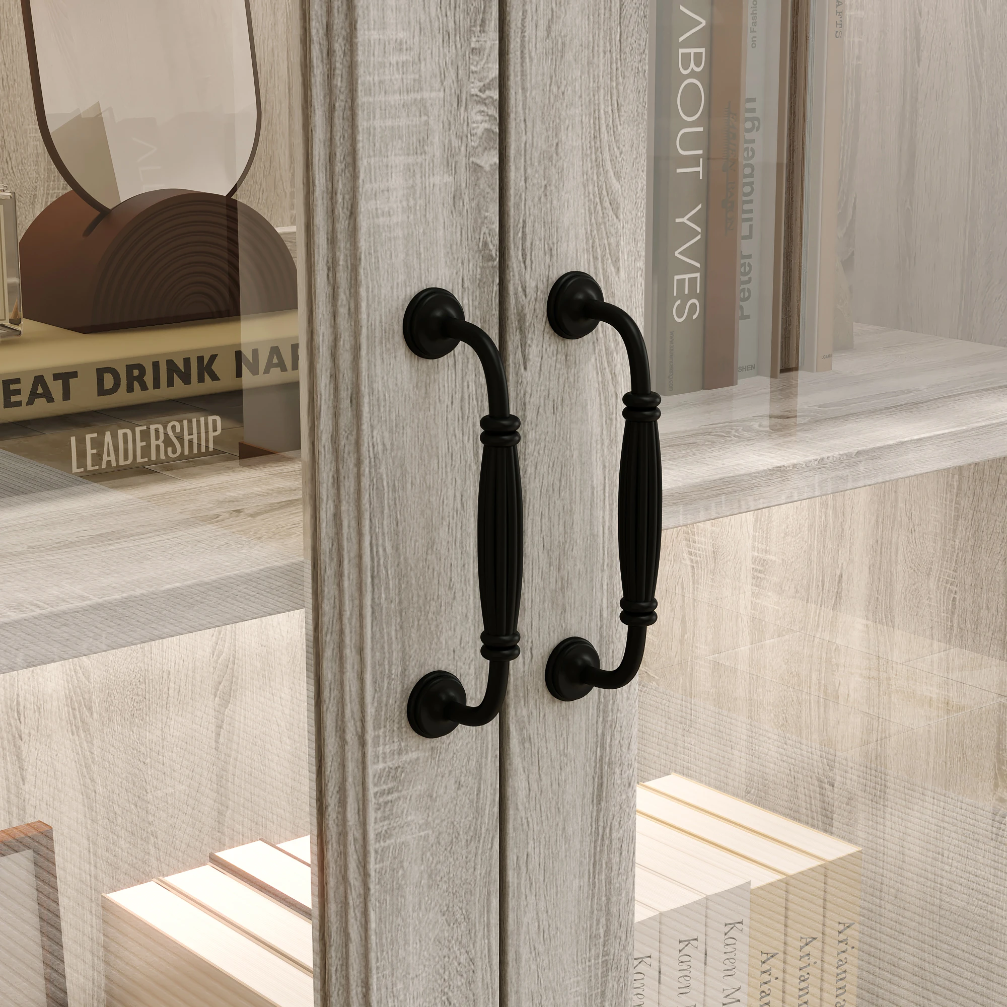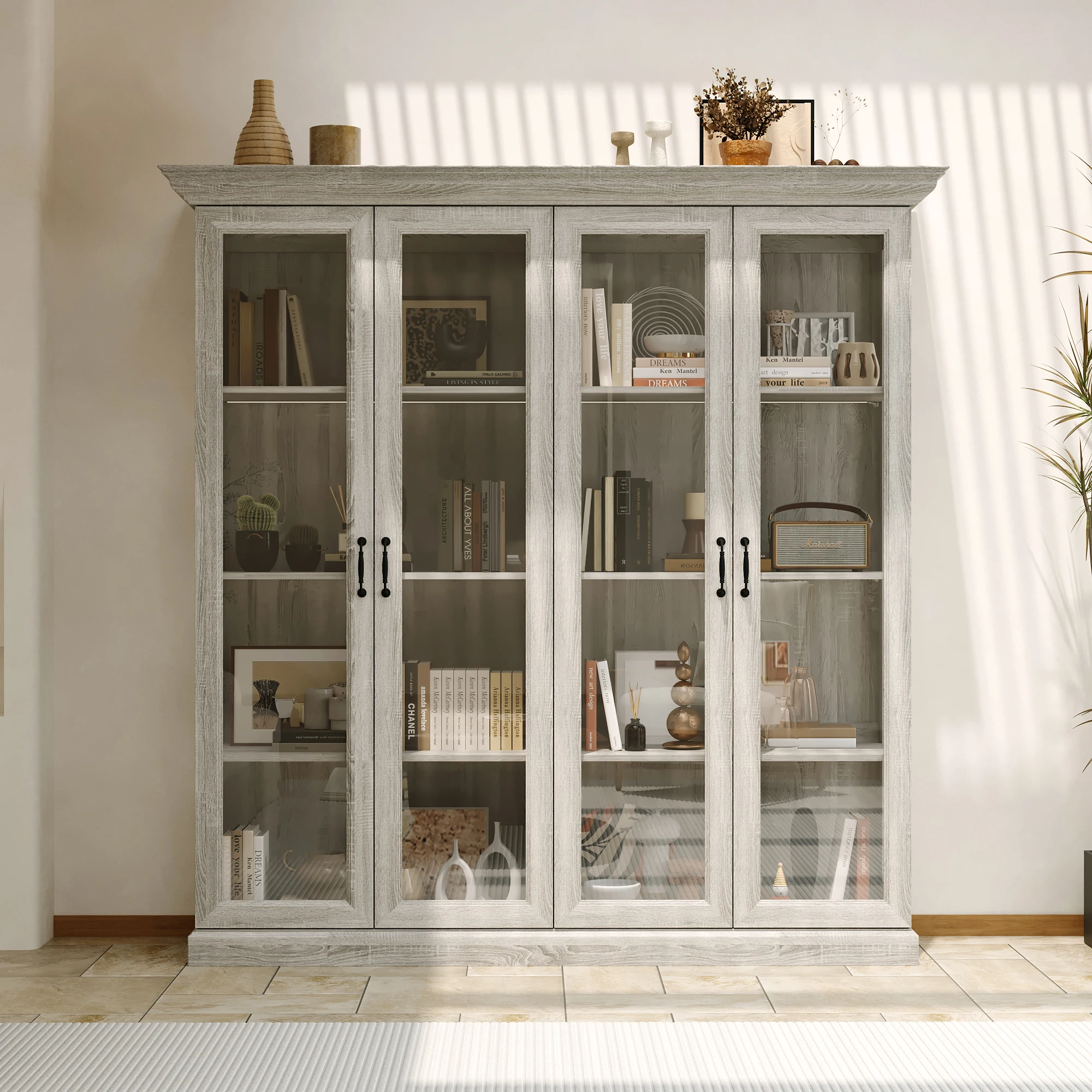【Modern Rustic Design】This display cabinet features a modern rustic style with a distressed gray finish, adding a touch of vintage charm to any room. Its elegant design and glass doors make it a perfect centerpiece for showcasing cherished items while enhancing your home decor.