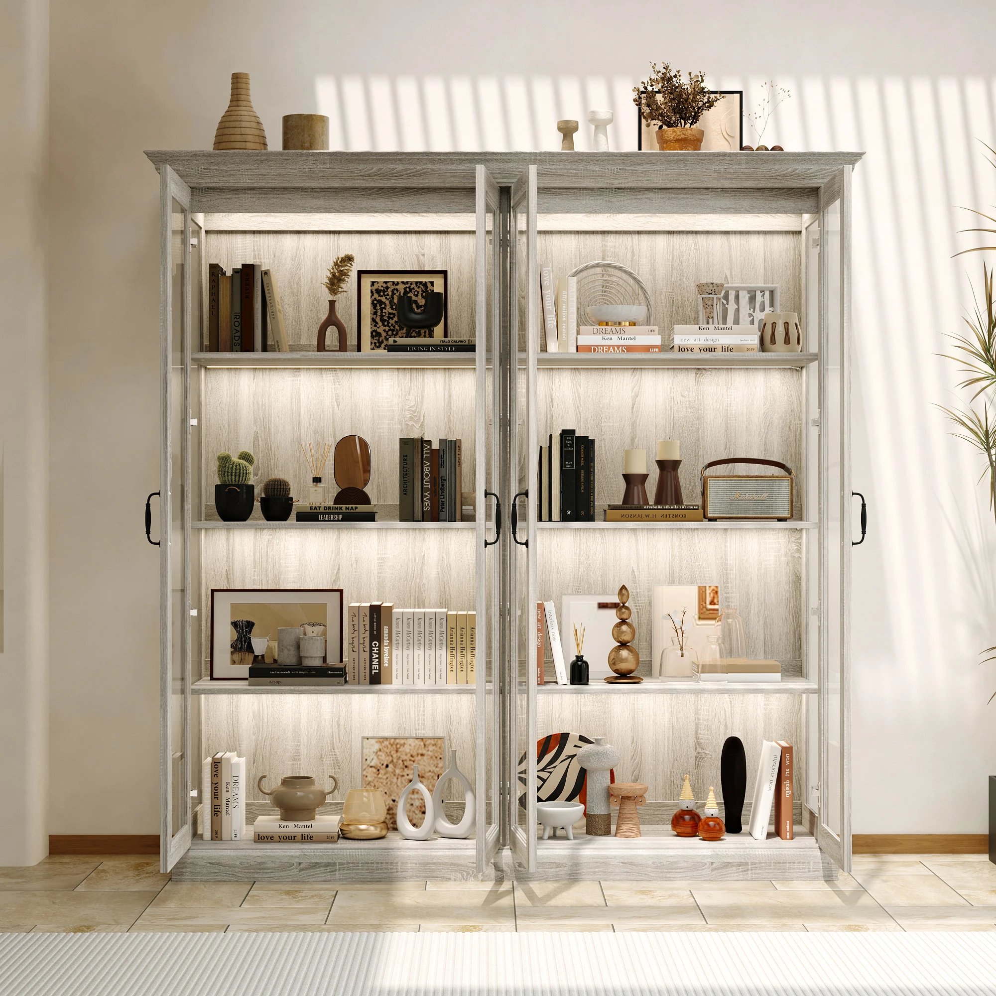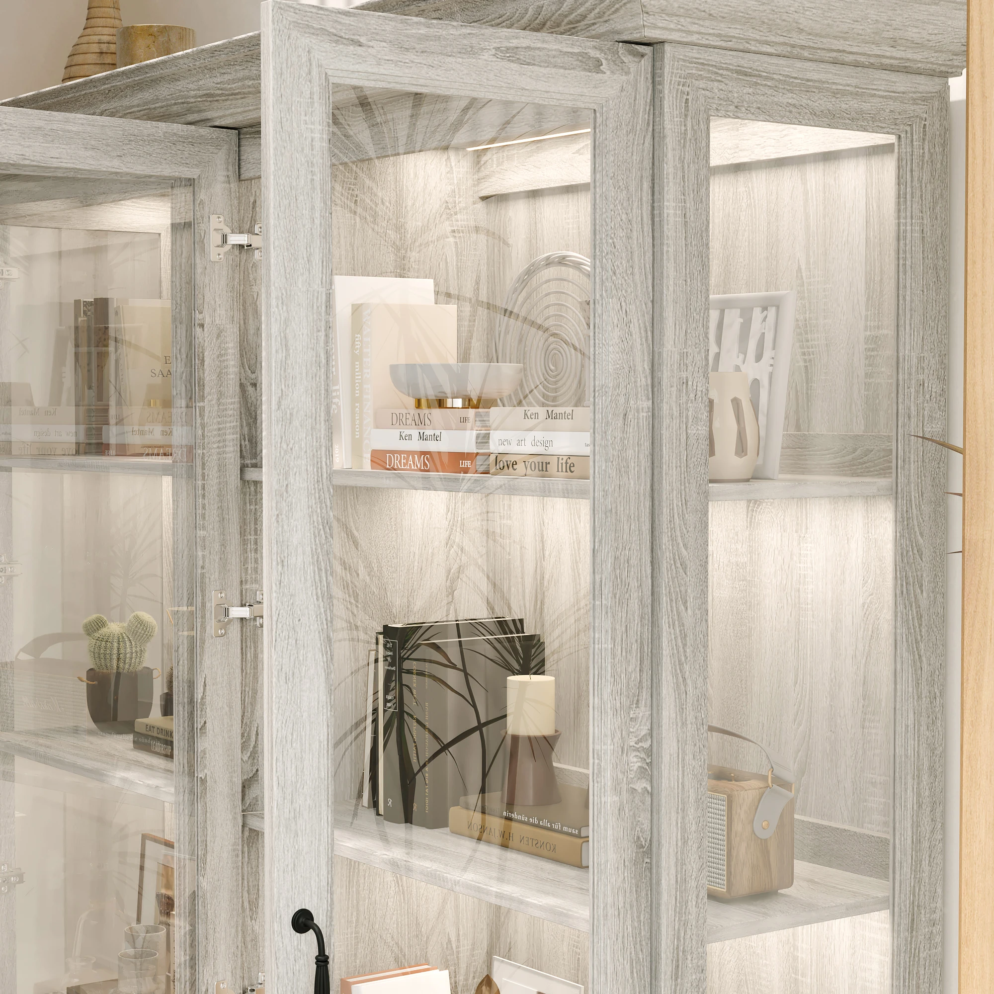Lighted Curio Display Cabinet with 4 Glass Doors, Tall Corner Cabinet with 4-Tier Shelves for Living Room, Study, Gray