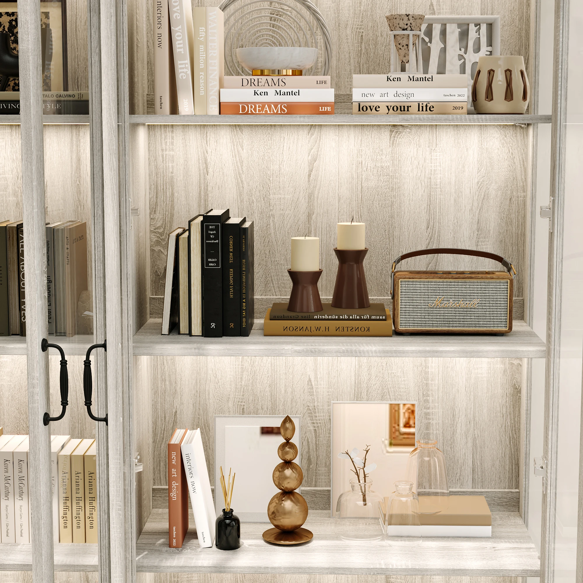 Enhance your living space with our stylish display cabinet, blending modern rustic charm with functional design. Made from durable P2 MDF and featuring distressed gray oak finish, it offers a robust yet elegant storage solution. The glass doors and wooden frames create a sophisticated showcase for your books, decor, or collectibles, while the built-in warm white LED lighting highlights your items beautifully. Equipped with anti-tipover accessories for added safety, this versatile cabinet is perfect for living rooms, offices, or entryways. Whether you want to display family heirlooms or modern decor, this piece adds both style and practicality to your home.