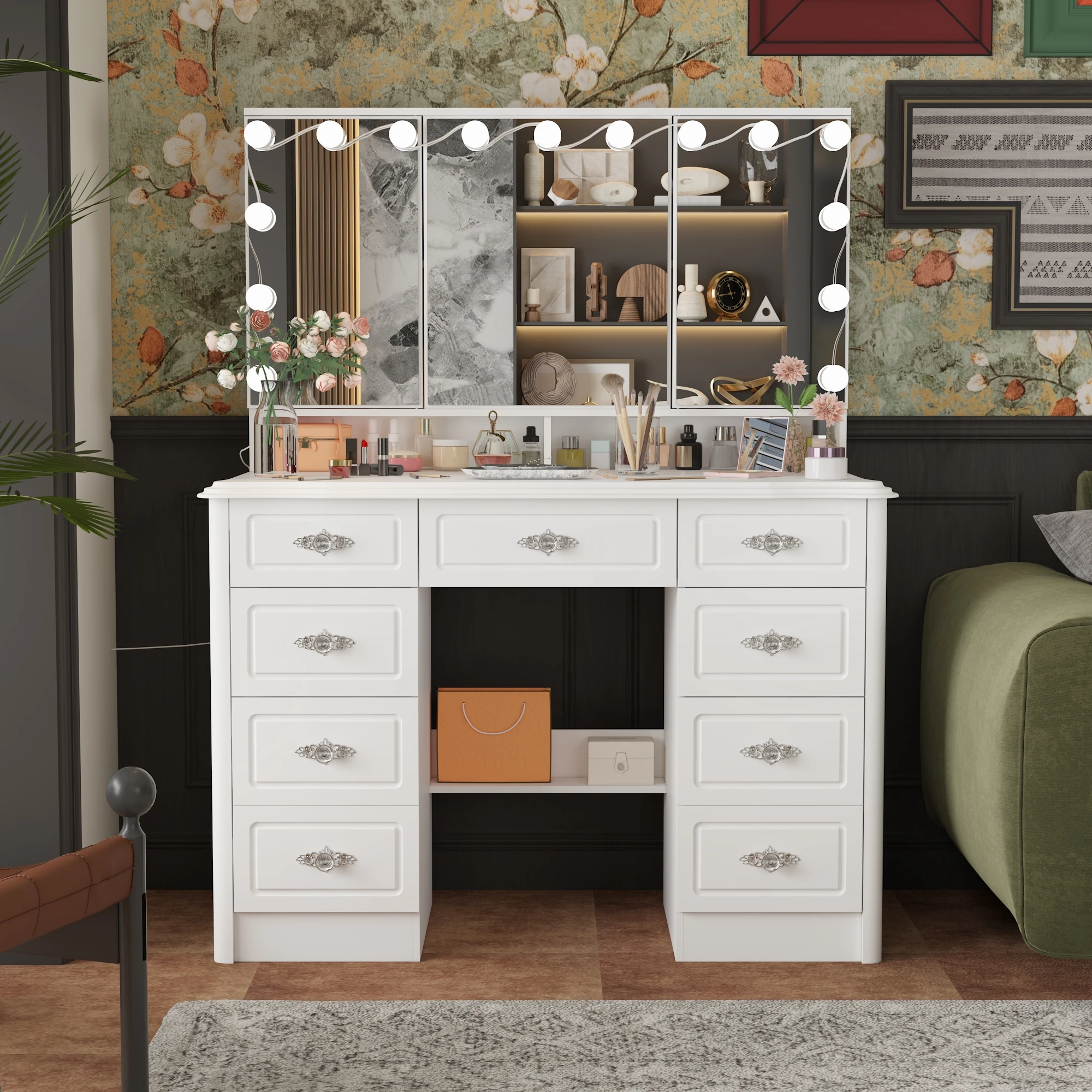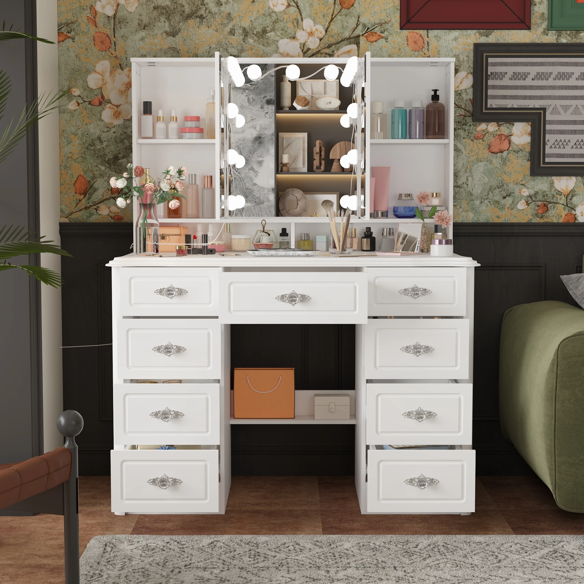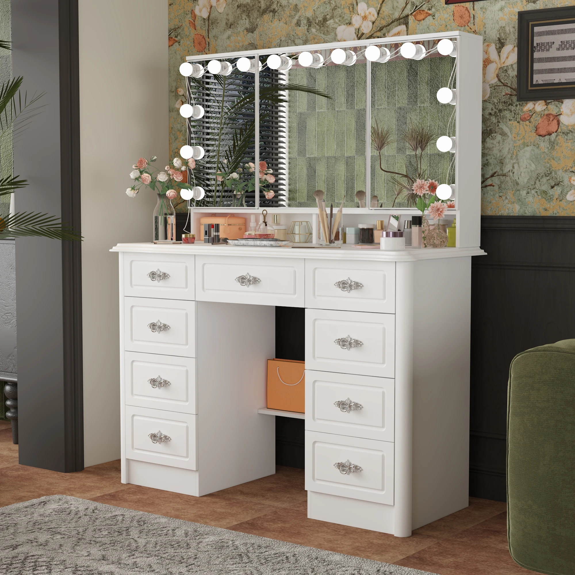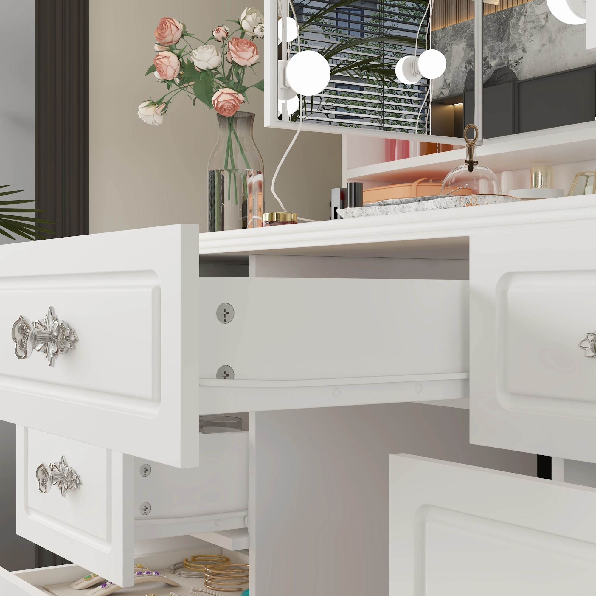 This makeup vanity takes your beauty routine to the next level. It comes with bulbs offering 3 color modes (cool, natural, warm) plus a USB port, so you'll have ideal lighting for any occasion—whether getting ready for work or a night out. Mirror doors open to handy shelves, keeping your skincare and cosmetics organized yet easy to access. With 9 drawers on silent under-mount slides, multiple open shelves, and a wide tabletop, there's ample space for all your beauty essentials, tools, and even decorative items. Crafted from durable P2 grade MDF, it's built to withstand daily use. Plus, the silver rose - shaped decorative handles brings a sophisticated, romantic vibe to your space, making this vanity dresser both practical and stylish for your bedroom.