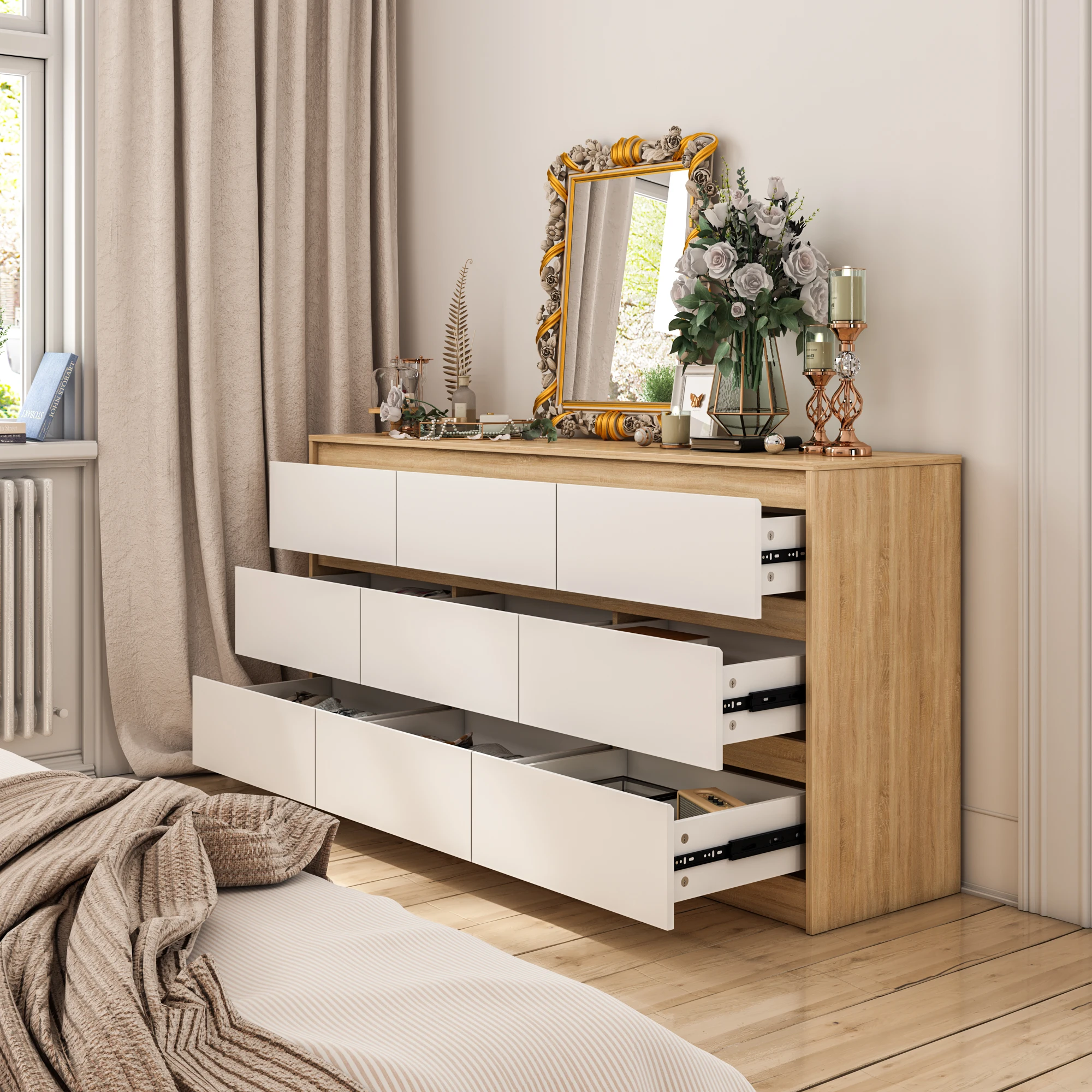 【Modern Minimalist Design】This nine-drawer vanity features an oak-colored cabinet with white drawers, complemented by beveled, handleless designs. Blending minimalist aesthetics with practicality, the contrasting tones easily fit various home styles, adding a layered, stylish touch to bedrooms, living rooms, and more.