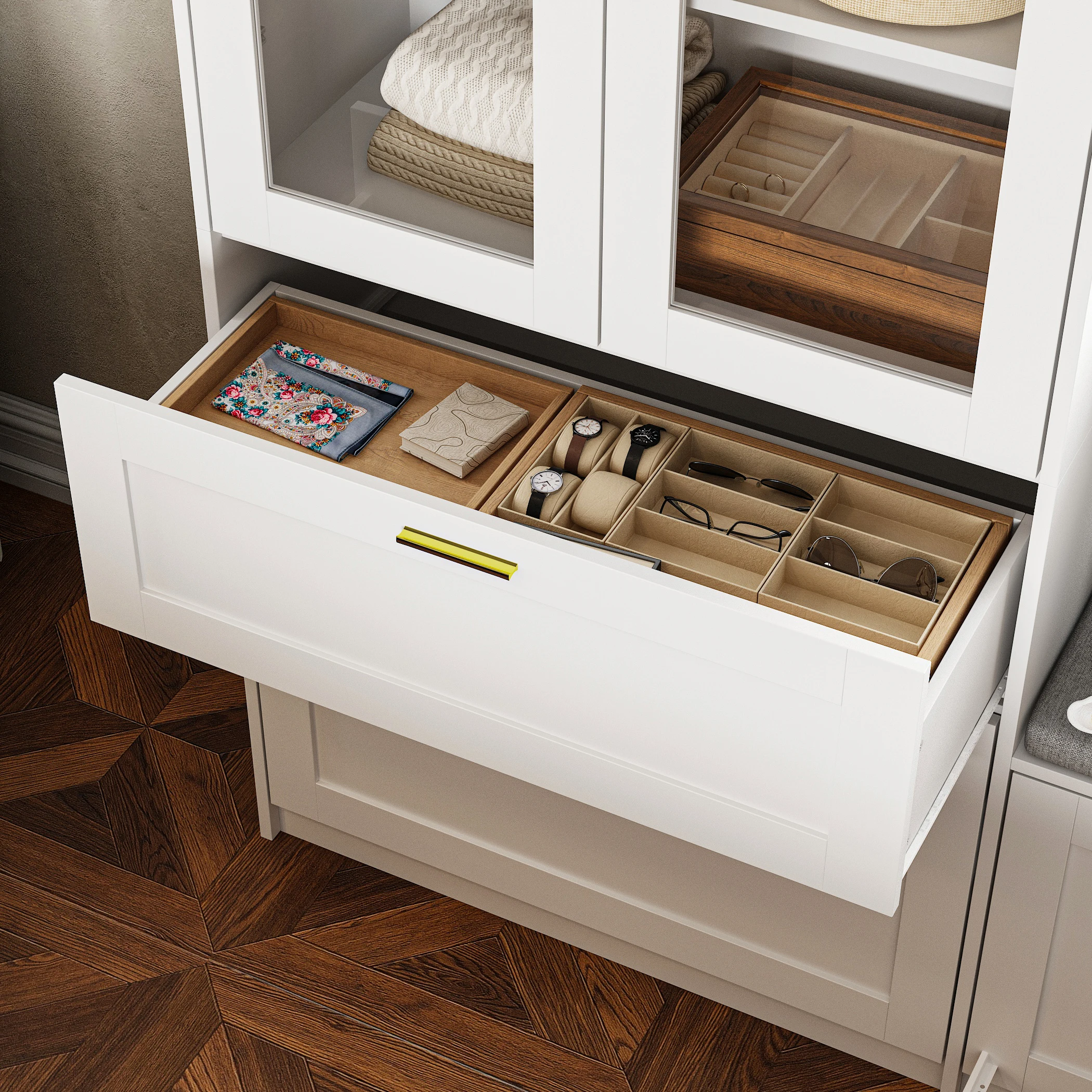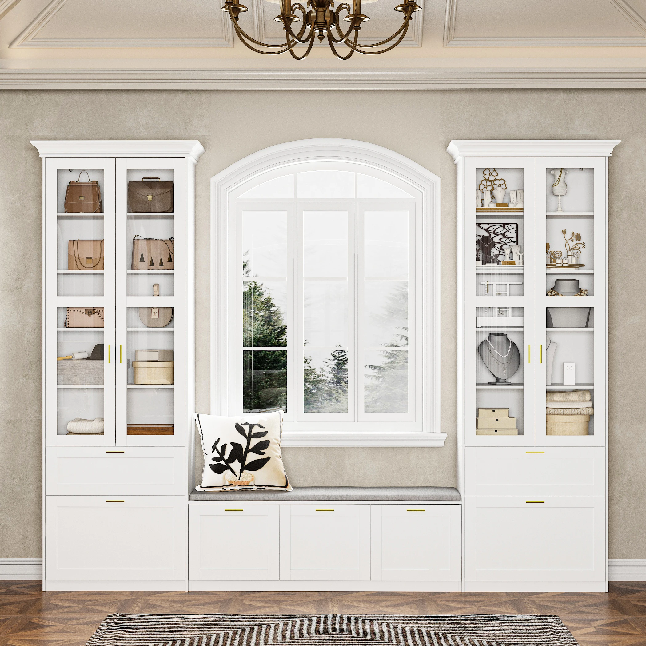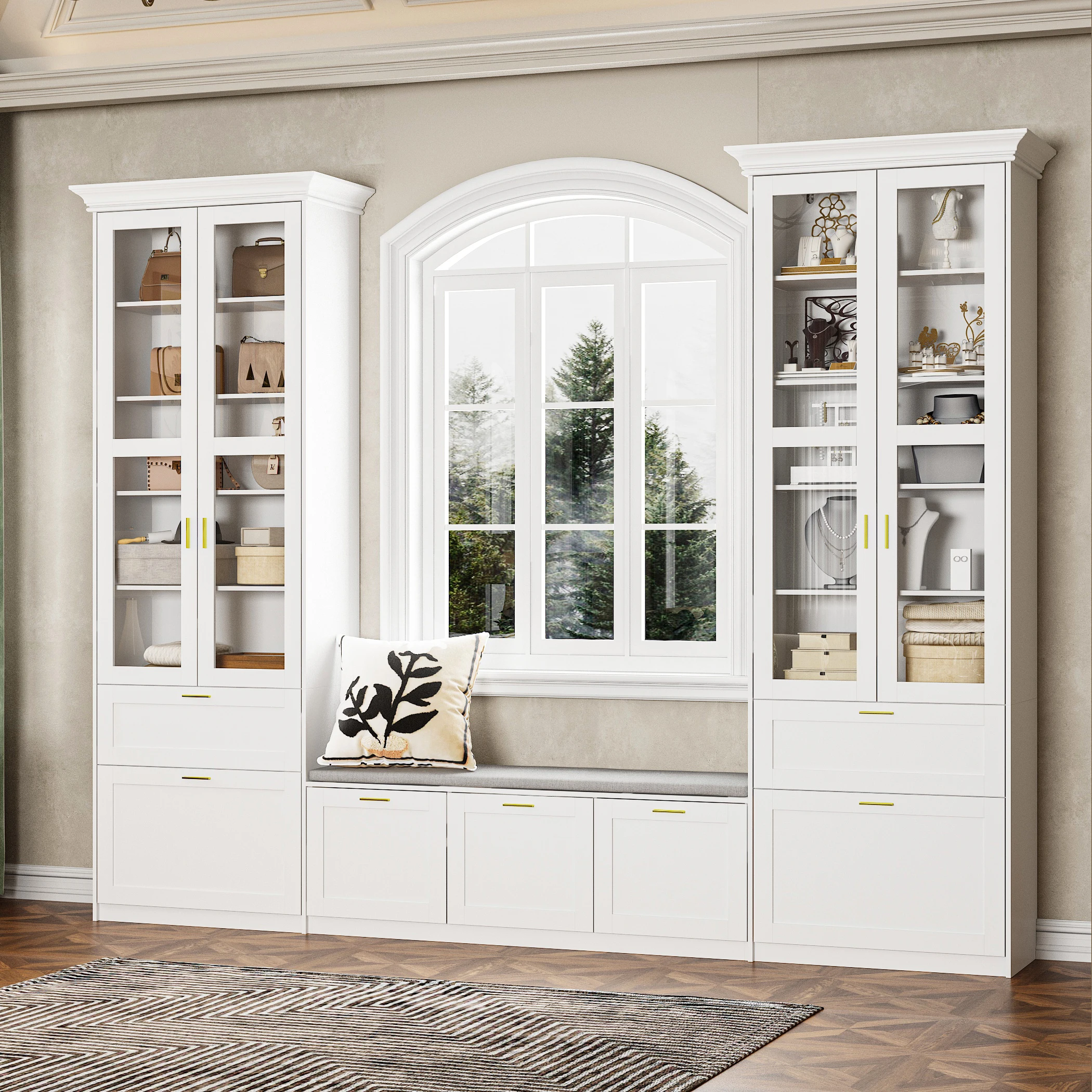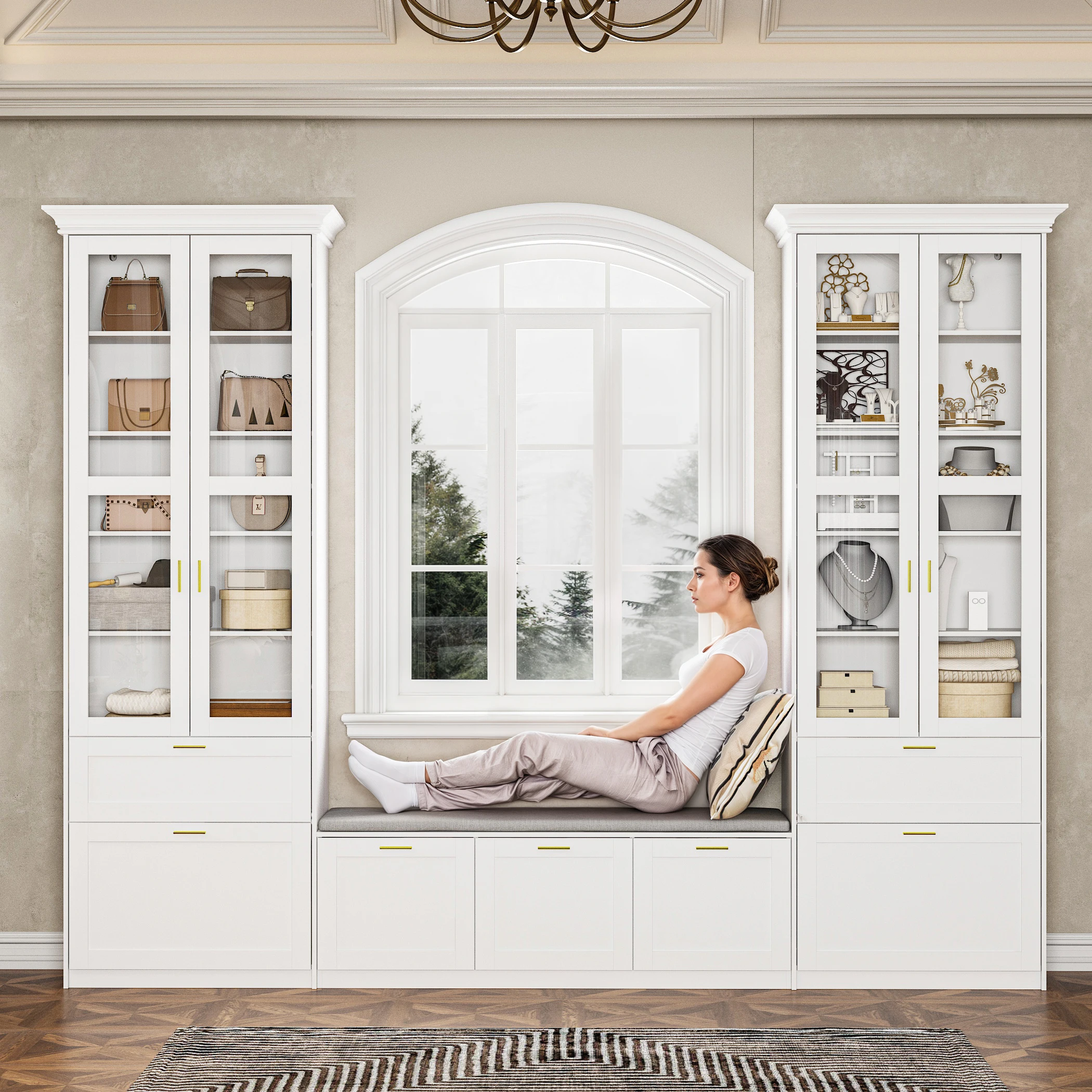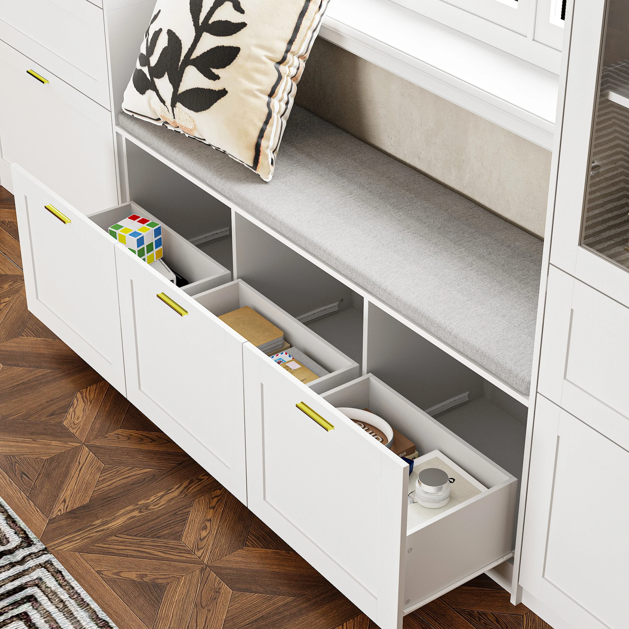 Elevate your living space with our elegant white storage cabinet, a perfect blend of style and functionality. Made from durable P2 MDF and featuring a soft luster finish, it provides robust storage while complementing modern interiors. The glass-paneled doors integrate seamlessly with window settings, allowing natural light to shine through while showcasing your stored items. Inside, multiple drawers and spacious cabinet sections offer versatile organization options for everything from accessories to larger household items. The built-in grey cushion adds a touch of comfort, making it a practical addition for reading or relaxing. With anti-tipover accessories included for safety, this cabinet is a stylish and practical choice for any room.