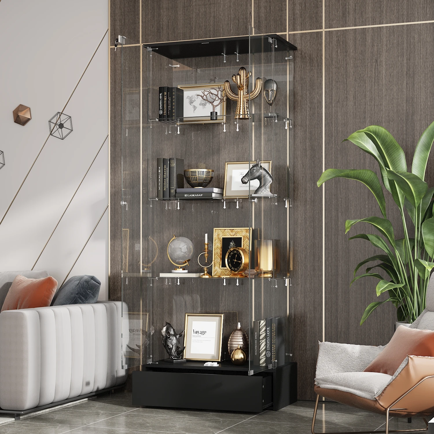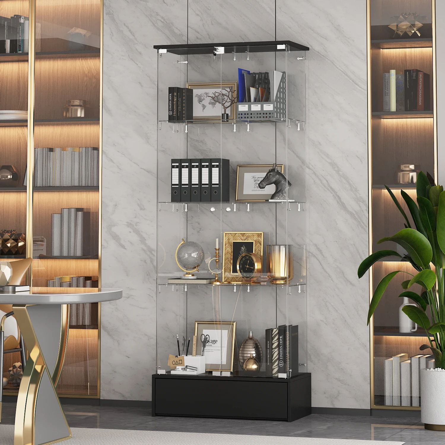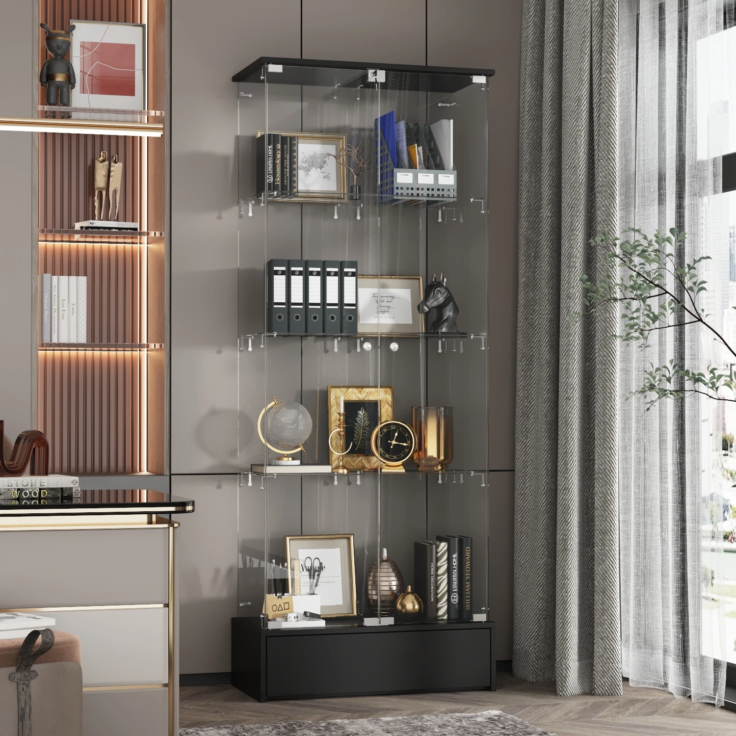 Morden Glass Display Cabinet with 2 Doors, 4-Tier Cabinets Bookshelf with Drawer & Lock for Living Room, Black