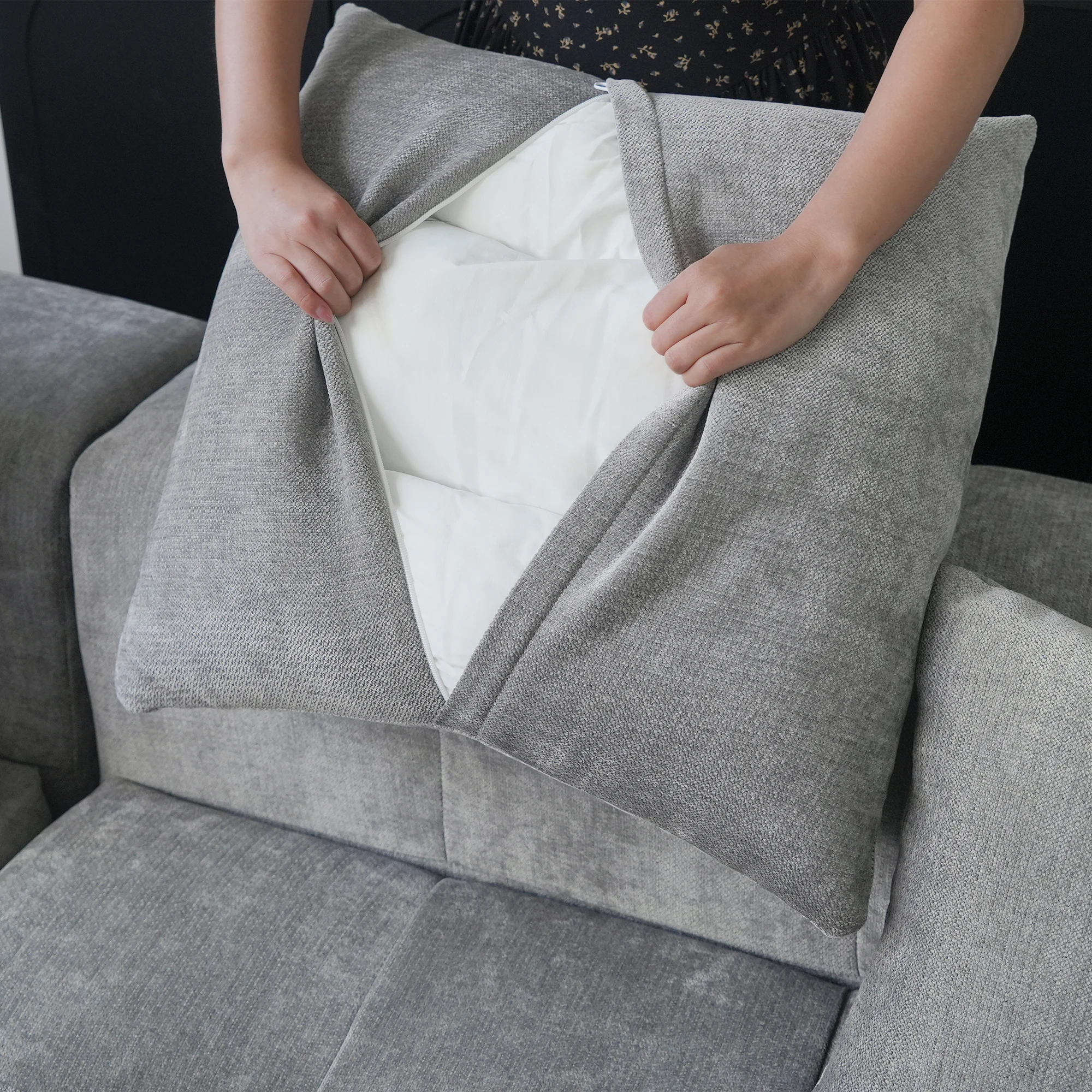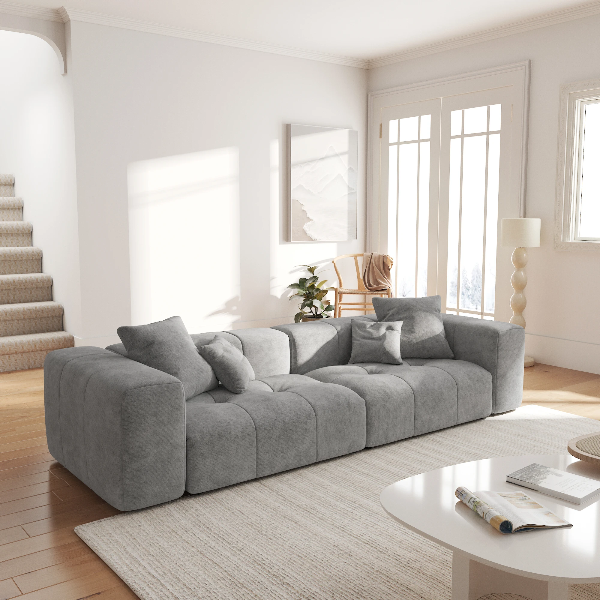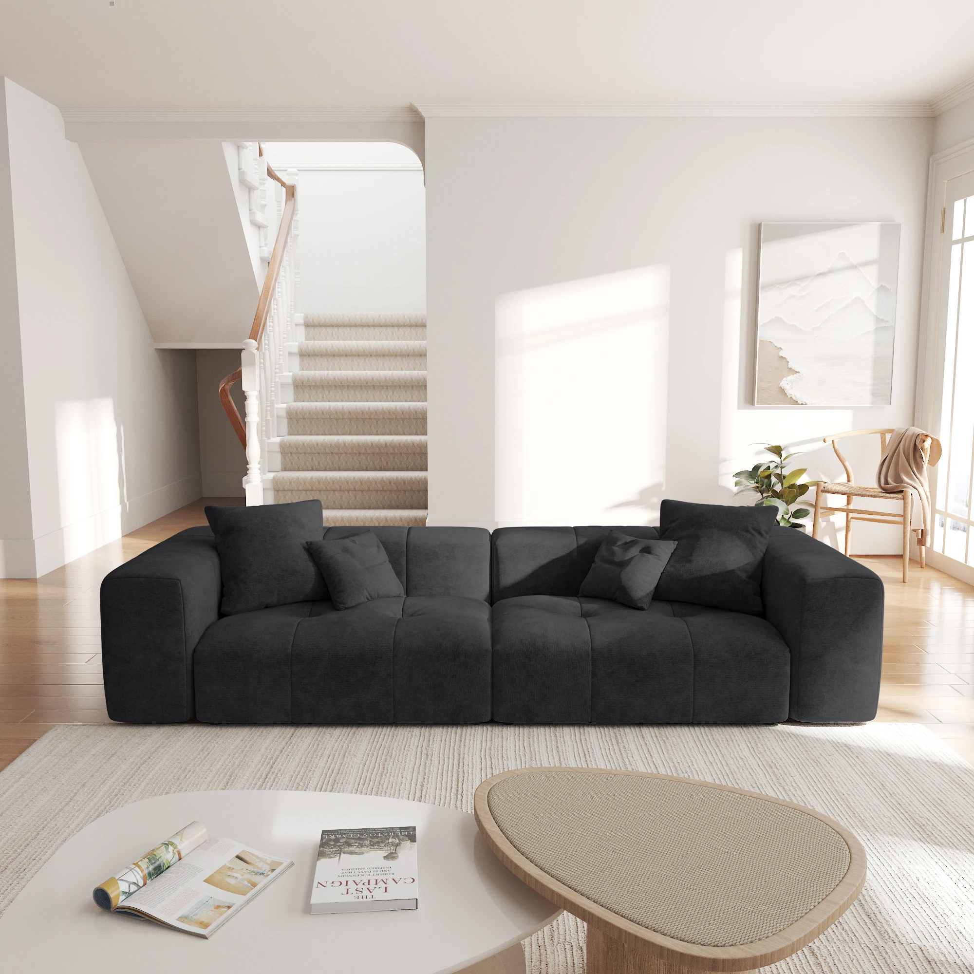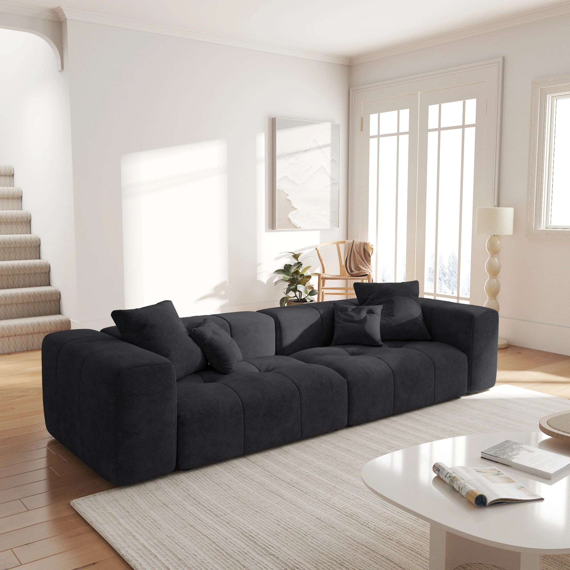 • This modular sofa features a solid wood frame, offering robust durability and an eco-friendly touch, while adding a natural, rustic charm to its overall design. The filling is high-quality sponge,Doll cotton, which does not collapse or deform after sitting for a long time.