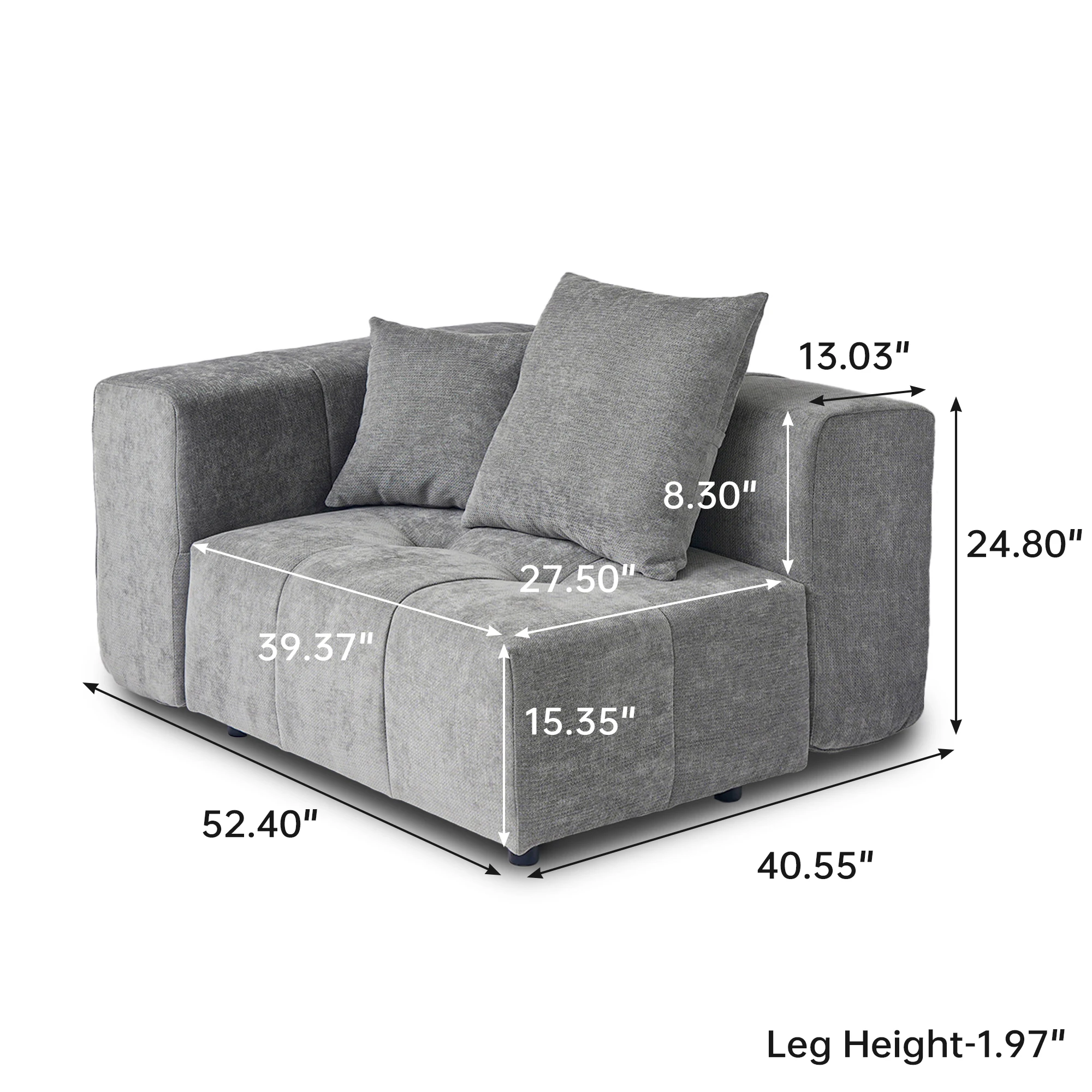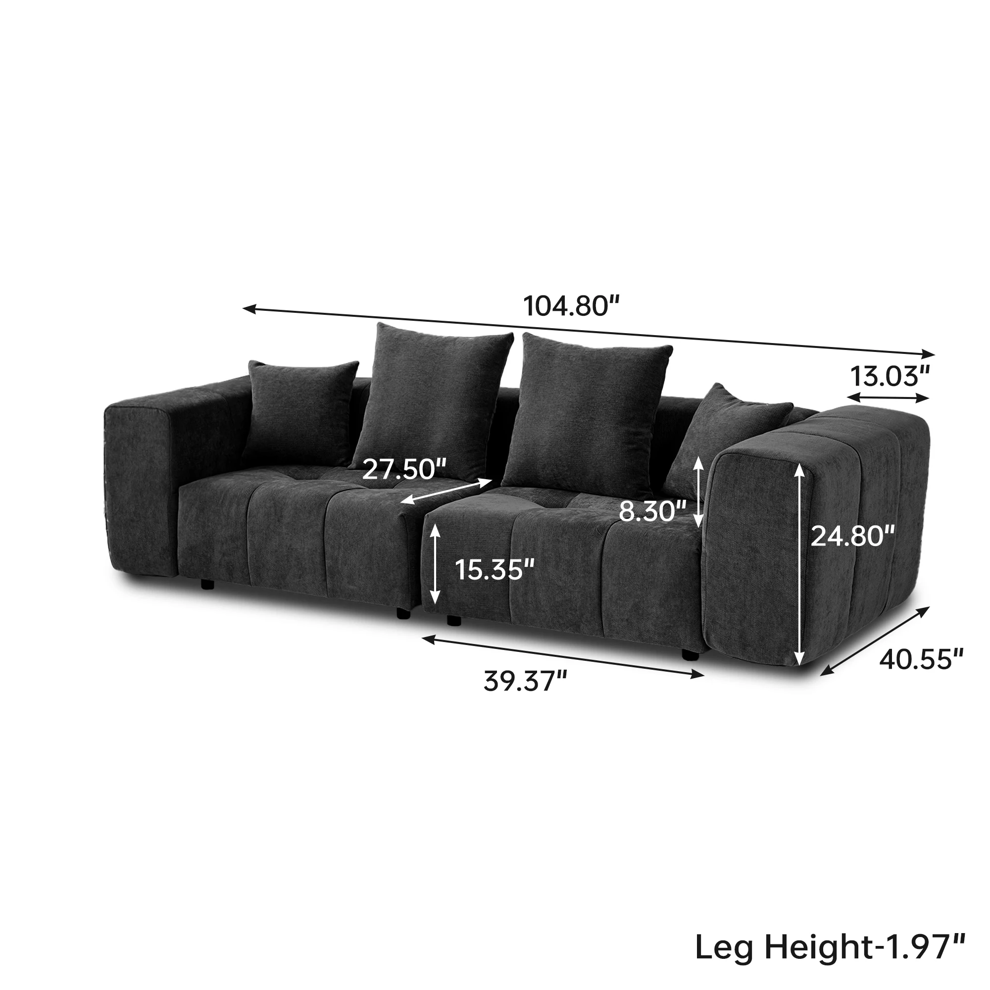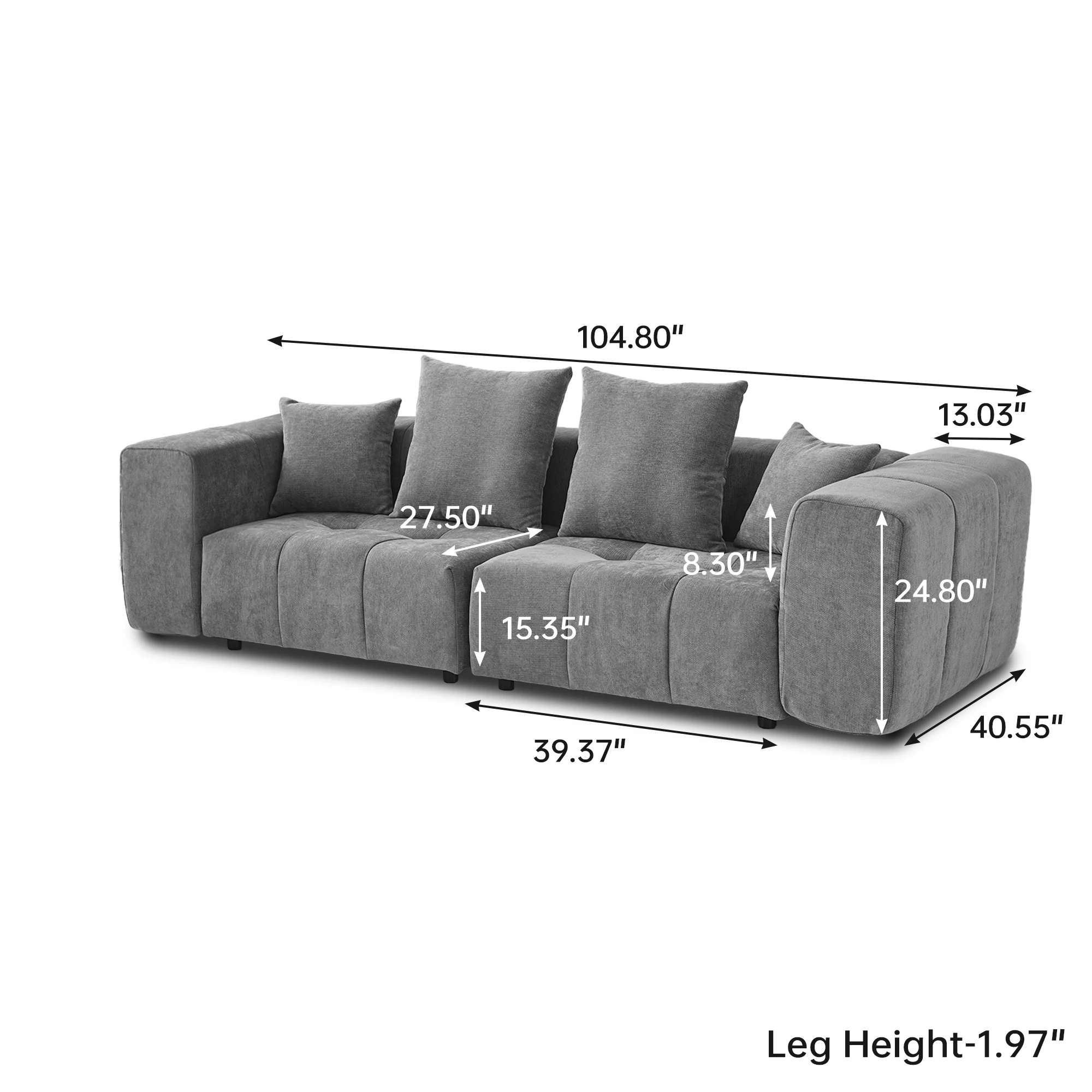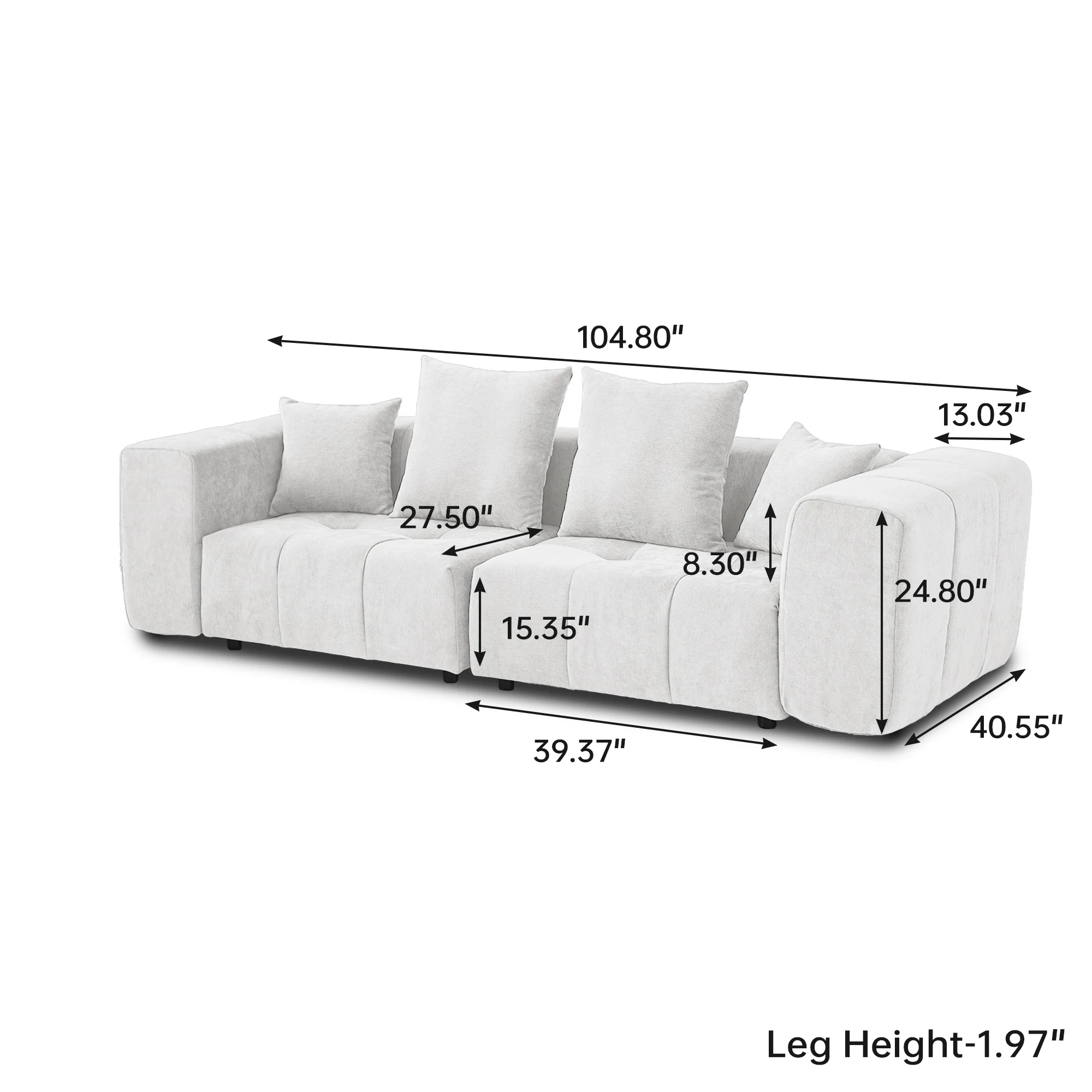 • Overall Size: 104.8 "W x 39.37"D x 24.8 "H. Sofa legs: 1.96" H. 2 Seater Sofa ,4 Pillows