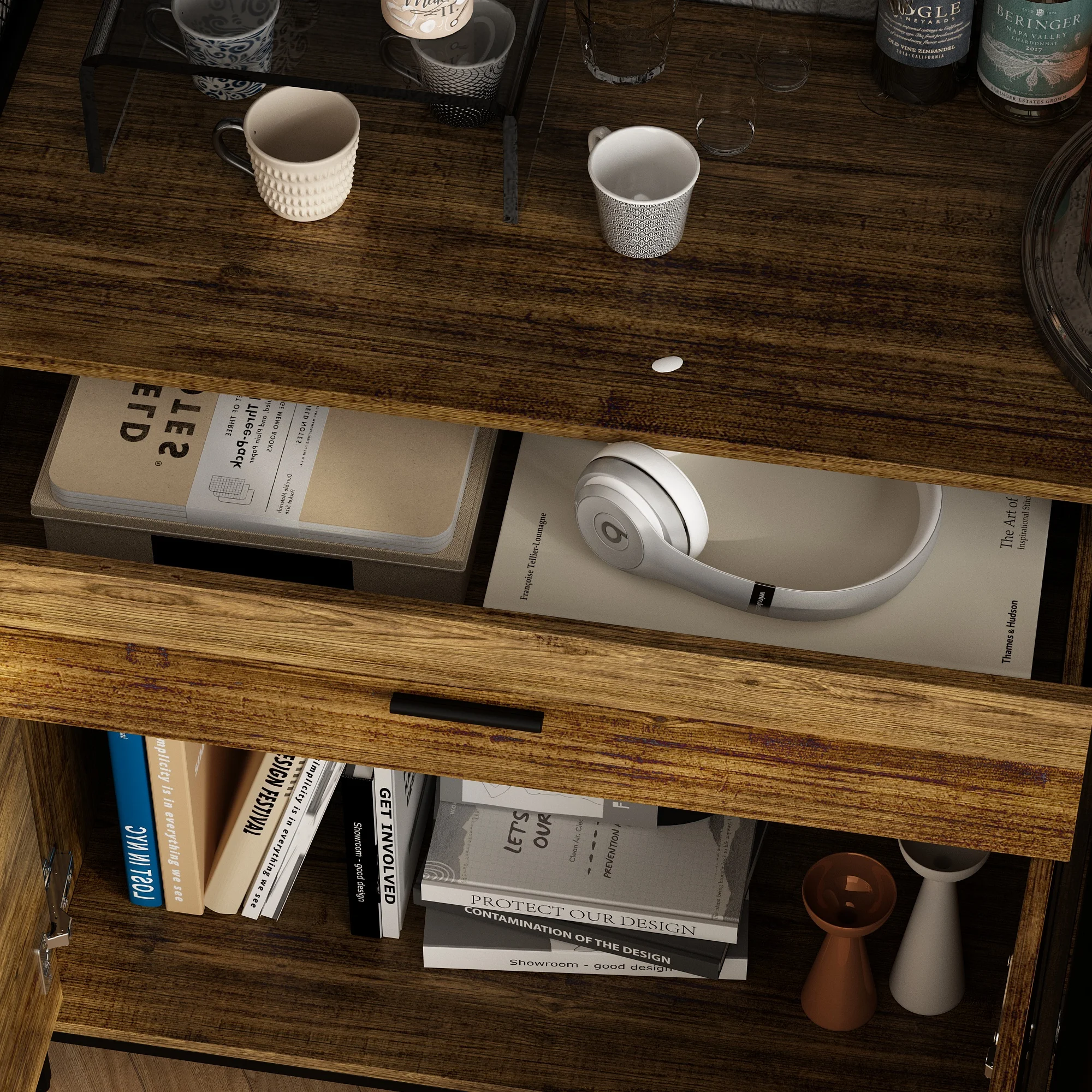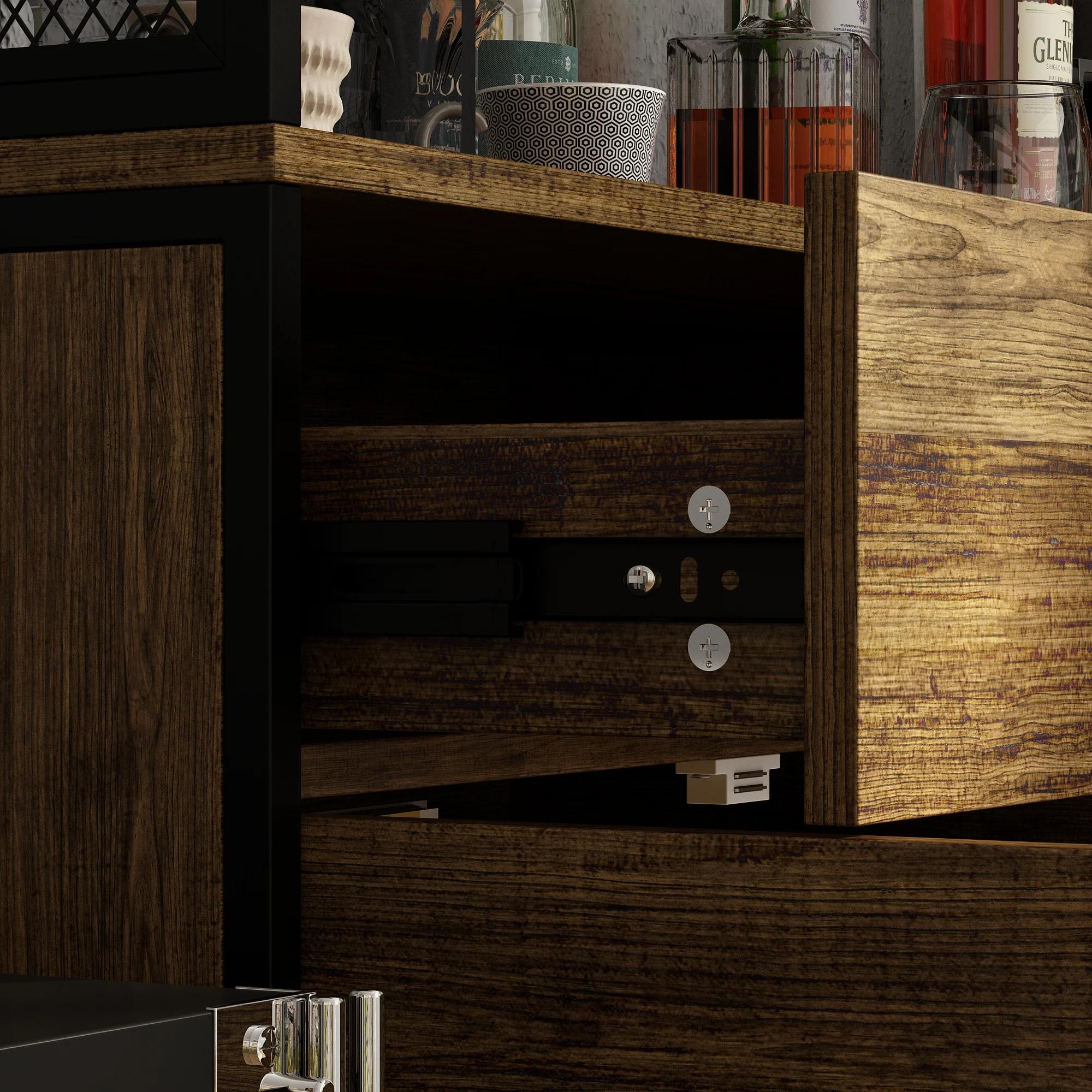 【Storage Capacity】Ample storage possibilities with multiple configurations. Spacious drawers glide smoothly on premium tracks for effortless access to everyday essentials, while fixed shelves provide stable support, keeping your items organized and within reach.