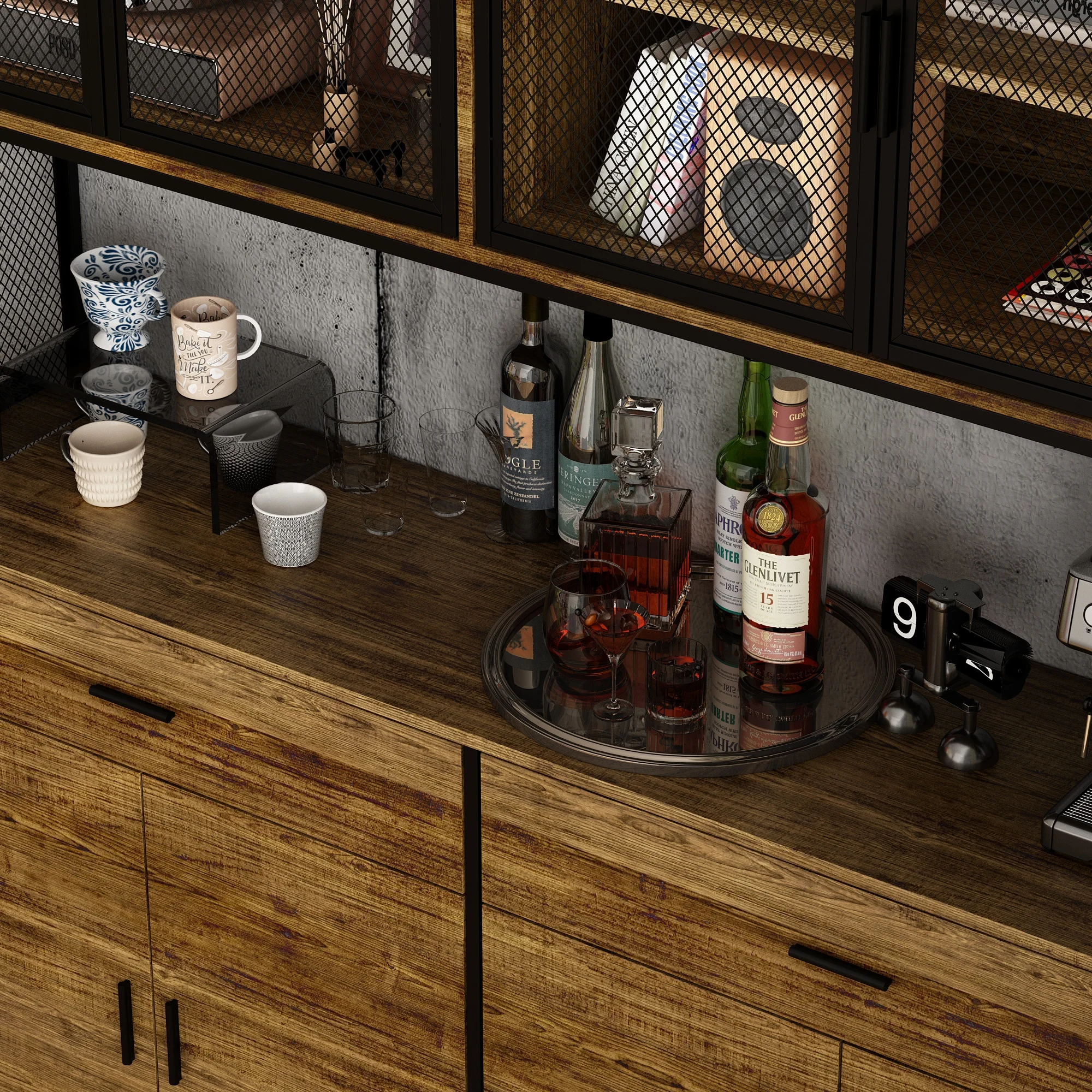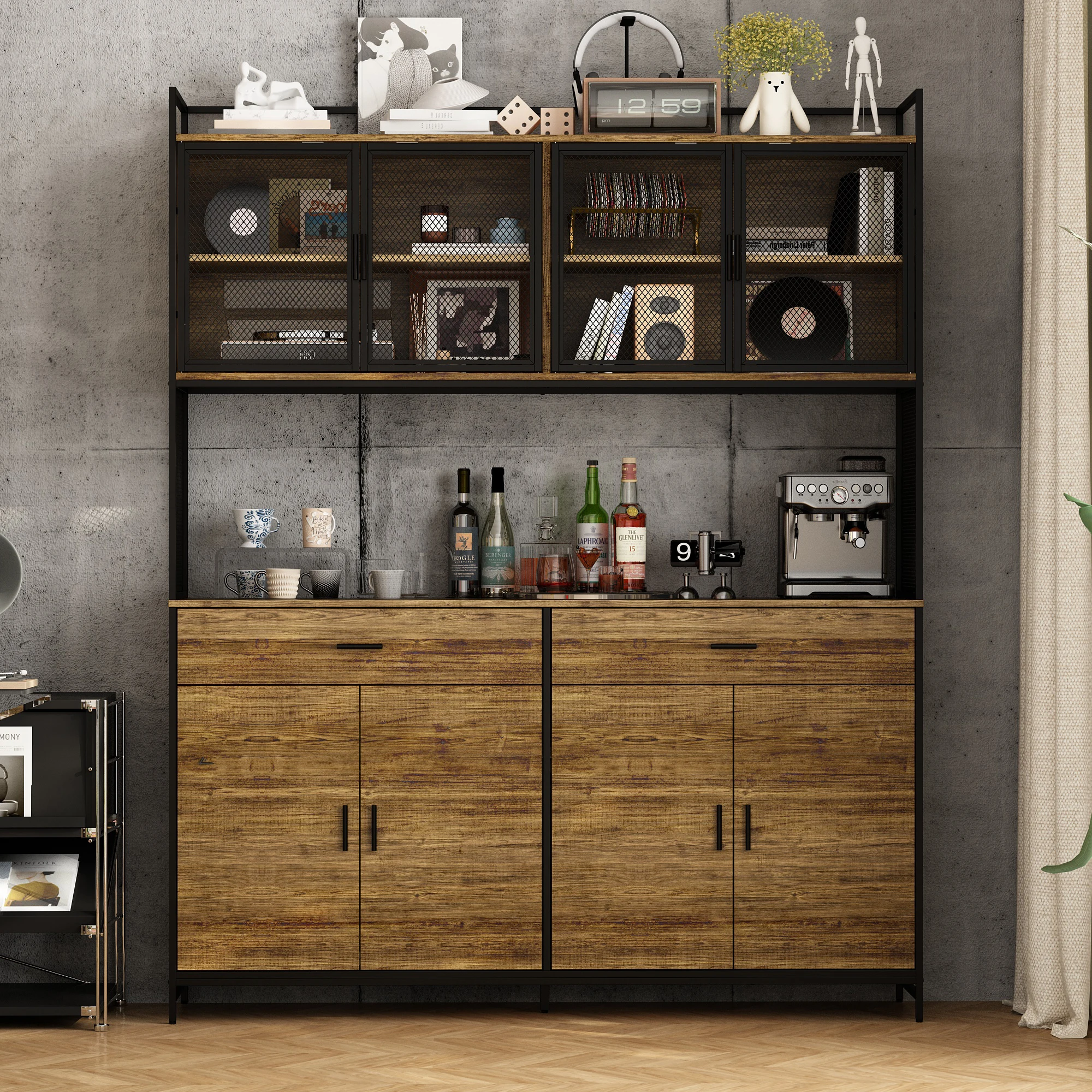【Practical Design】The practical combination of mesh doors and solid paneling offers a perfect balance between visibility and concealment. The mesh doors add an industrial touch while allowing you to easily view stored items, keeping your space tidy and functional without sacrificing style.