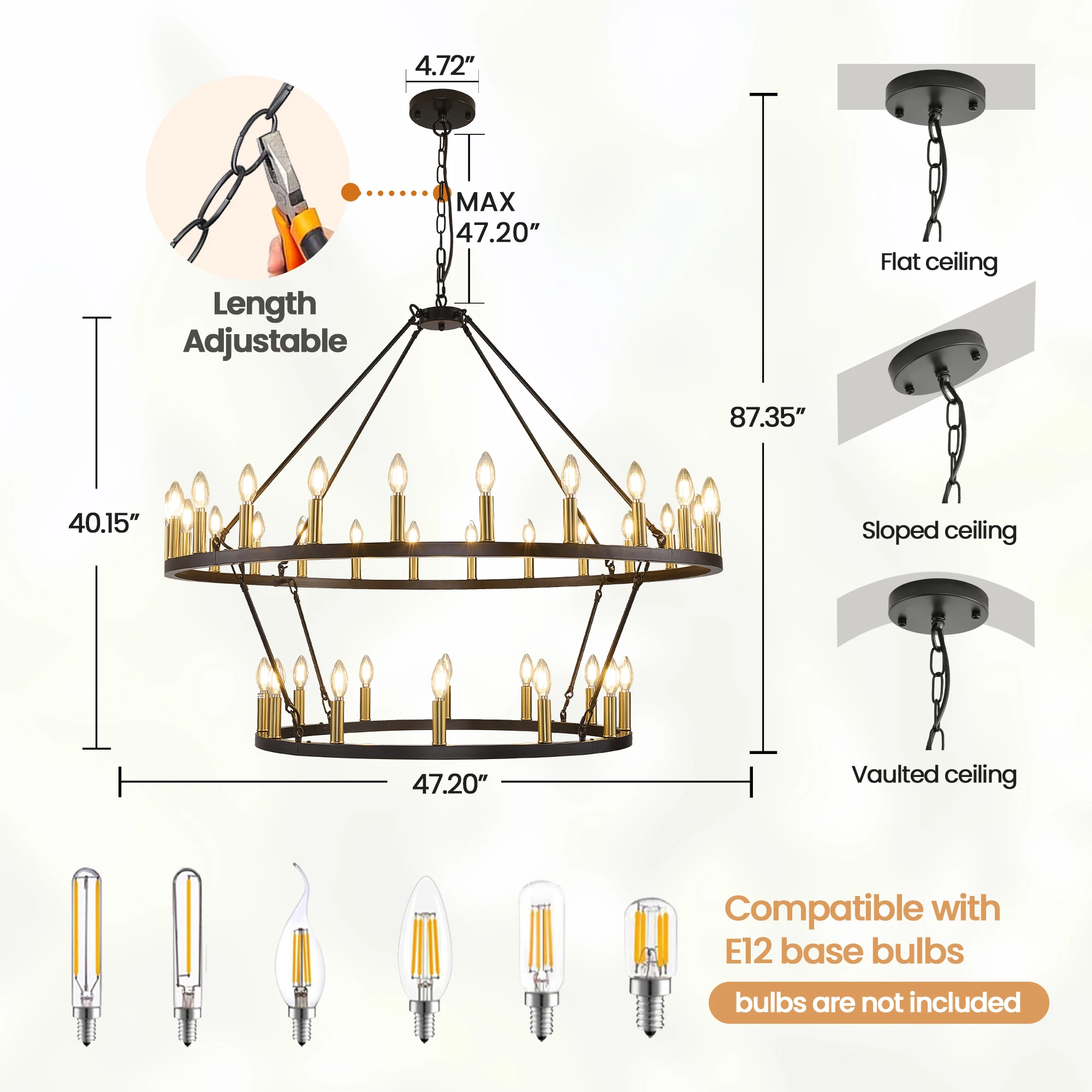 ✅【Compatibility Information & Bulb Type】This chandelier is compatible with 60W max E12 bulbs, you can DIY your lights for house with different types of bulbs, such as incandescent or led bulbs. Use vintage style Candelabra Bulbs for that extra retro vibe, use LED bulbs for energy and money savings. (Note: Bulbs are NOT included.)