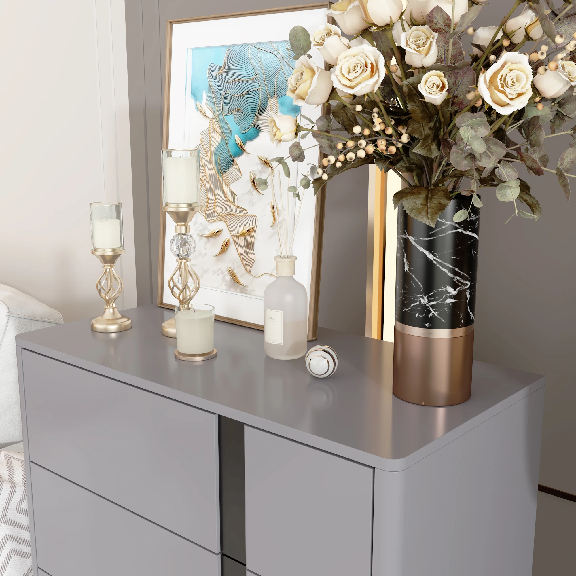 This sideboard cabinet brightens spaces with white fine linen texture and gold details, suitable for American pastoral and Nordic homes.Crafted from multi-layer PB and MDF boards, with strong slide rails and iron feet, it has good load-bearing and durability. Nine drawers keep jewelry, snacks, etc. organized. It's perfect for bedrooms, studies, living rooms—practical and elegant.