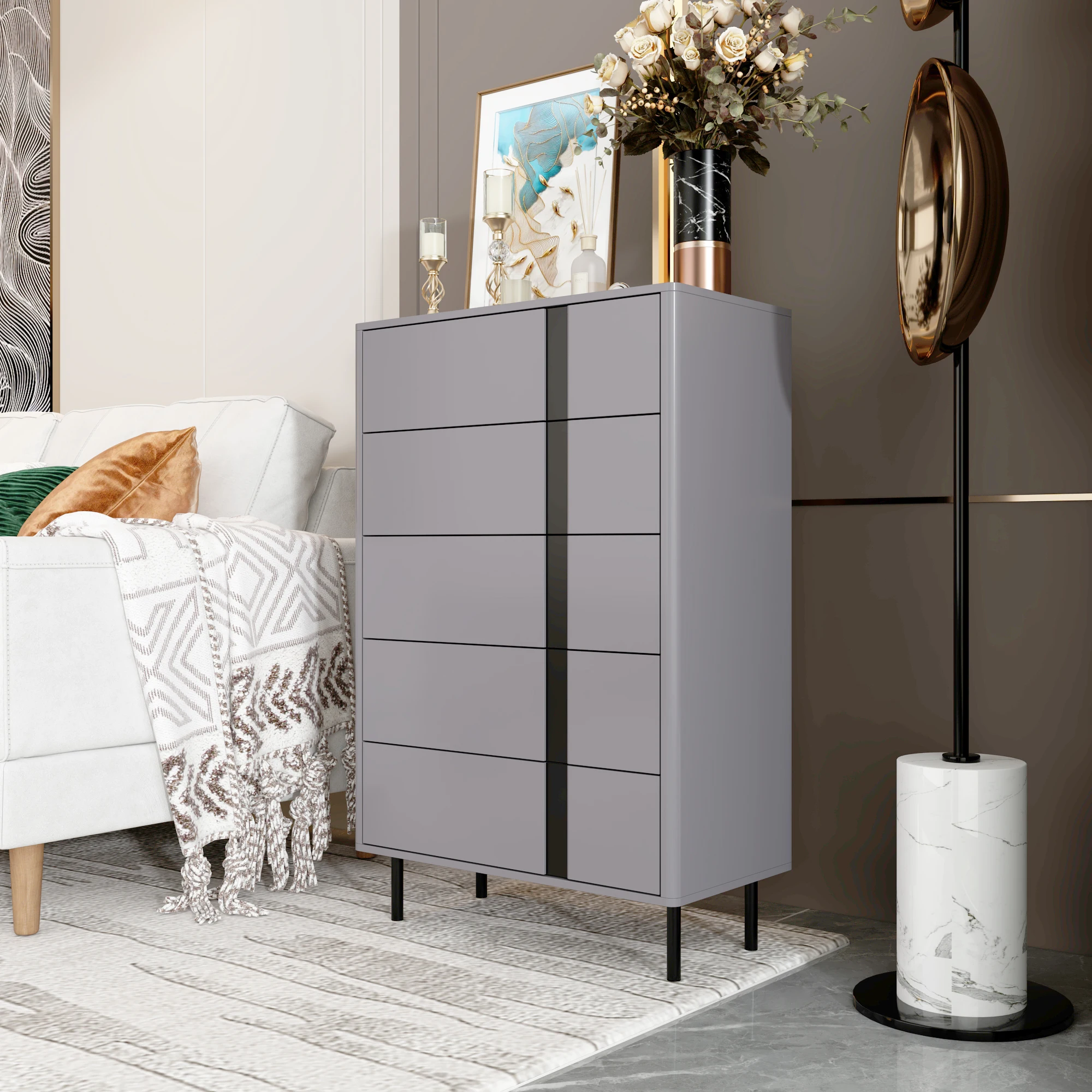 5-Drawers Coffee Table with Adjustable Metal Legs, Handless Chest of Drawers with Glass Decor for Living Room, Grey