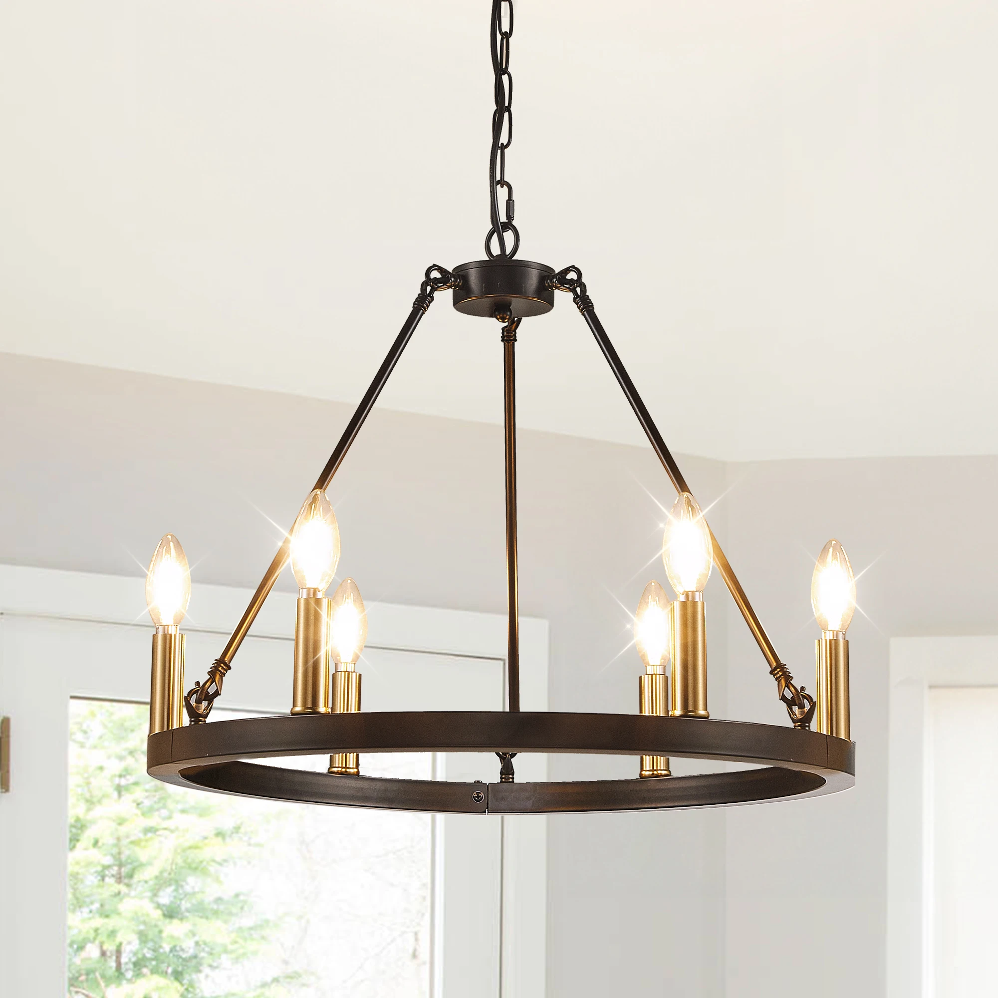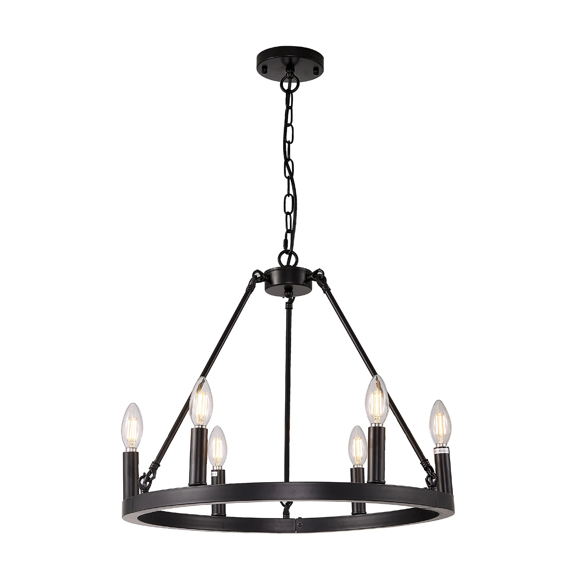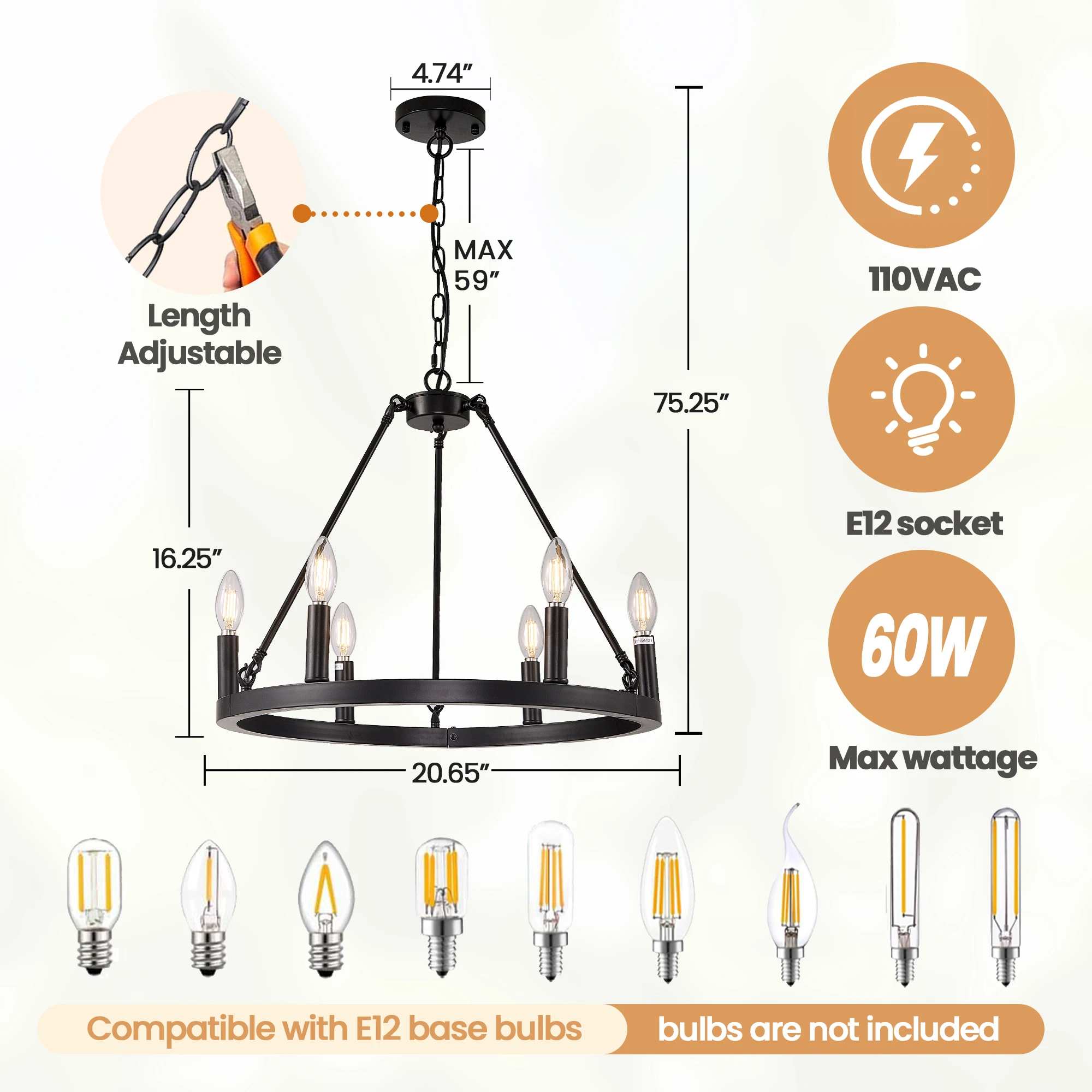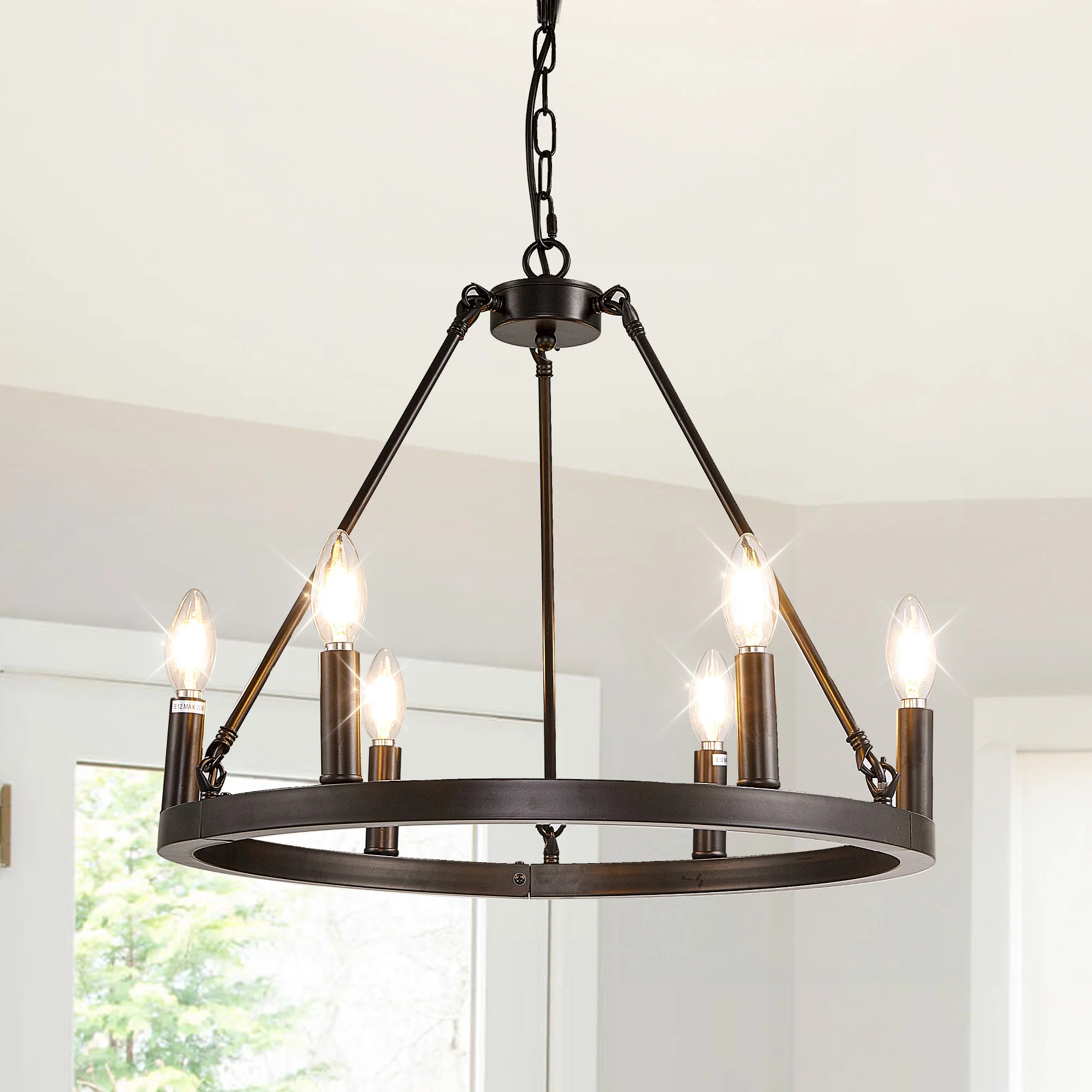 6-Light Black Wagon Wheel Chandelier 20.65 inch Candle Pendant Light Modern Rustic Farmhouse Large Chandeliers for Living Room
