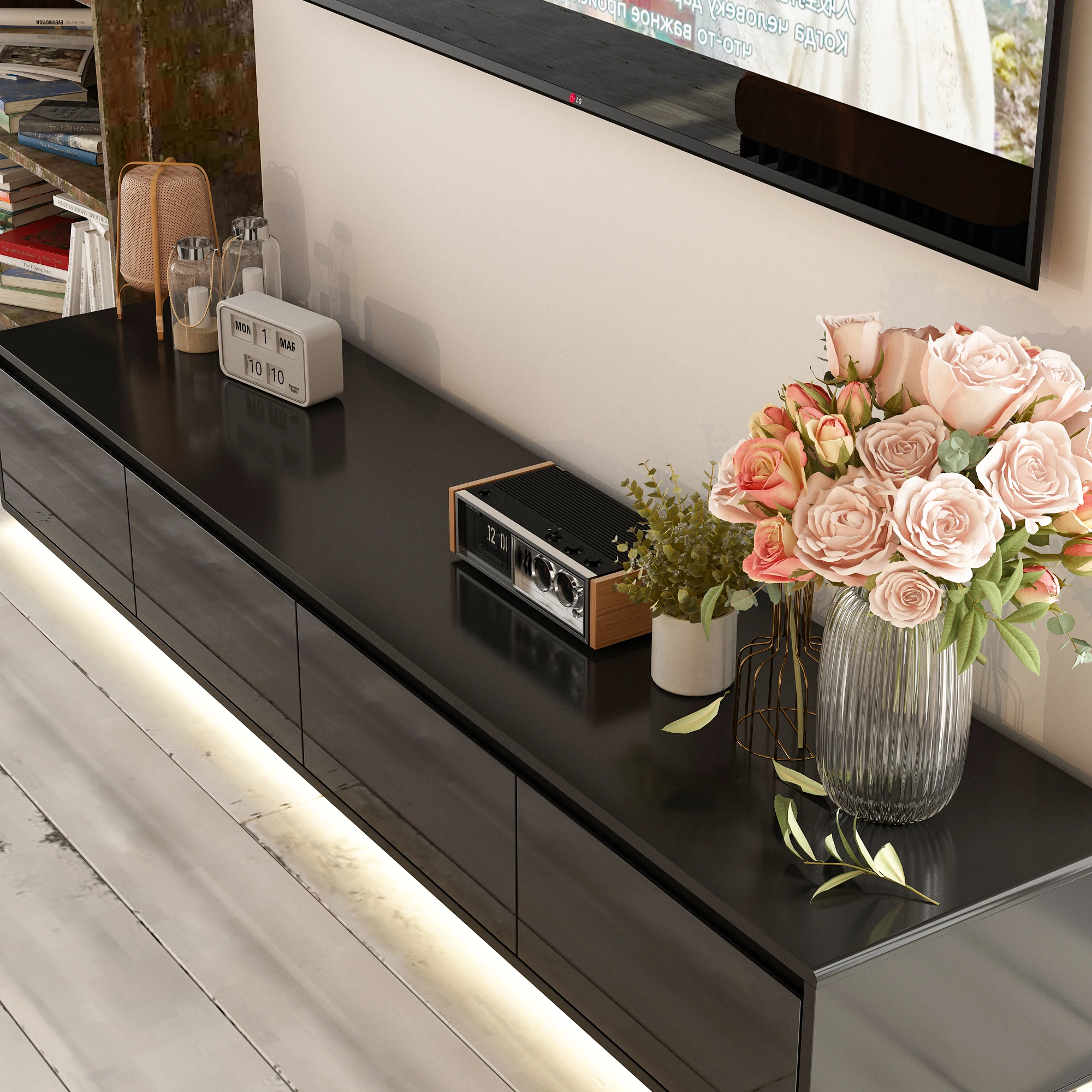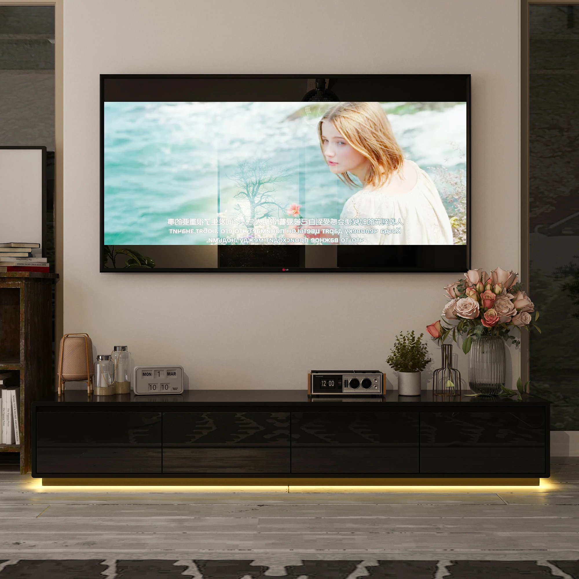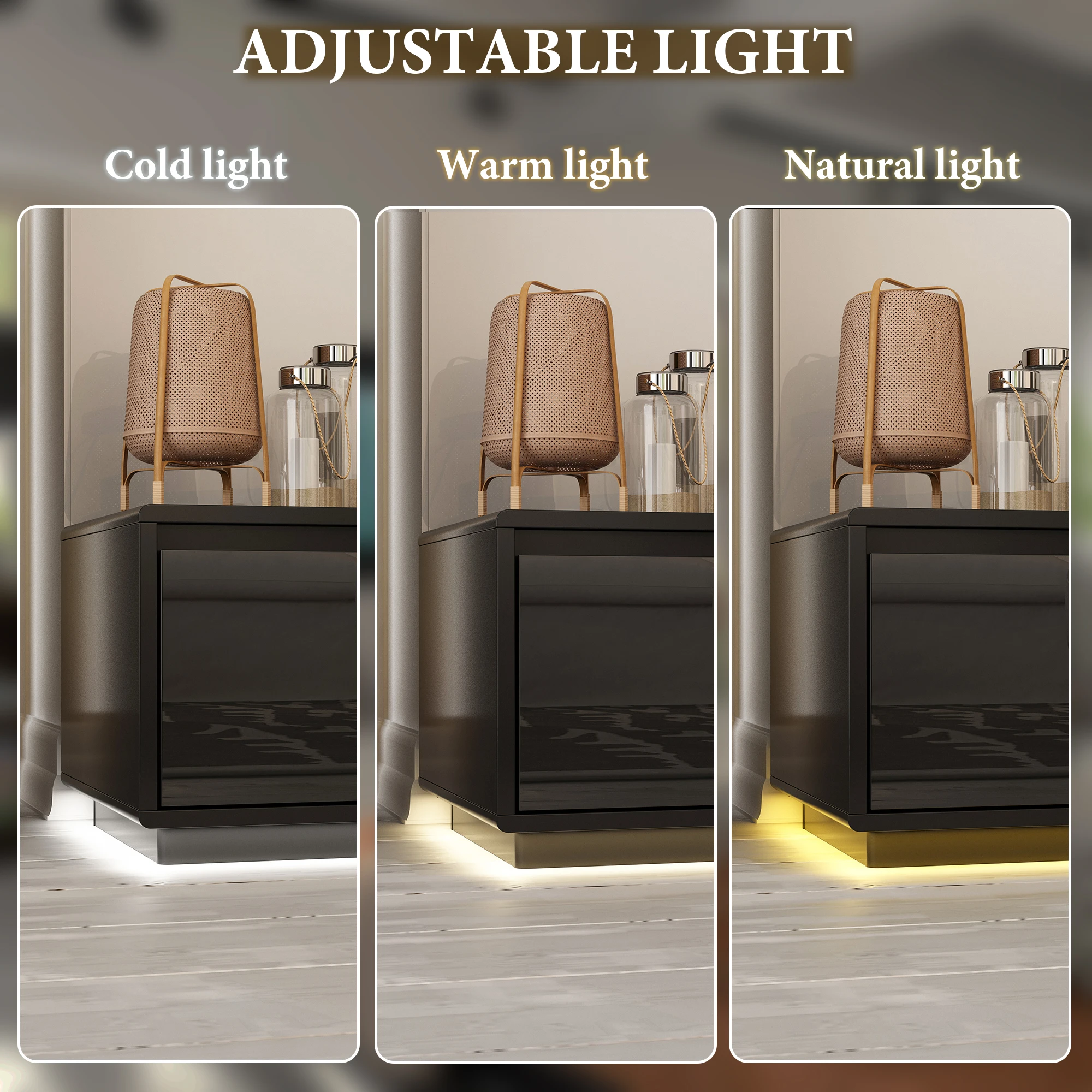 Upgrade your living room with this sleek TV cabinet that combines functionality with modern style. The high-gloss finish creates a striking visual impact, making it the centerpiece of your entertainment area. With multiple storage options including spacious drawers and open compartments, you can keep your space tidy while storing all your media essentials. The adjustable three-color lighting allows you to customize the ambiance, whether you're settling in for a movie night or hosting a gathering. Constructed from durable, eco-friendly materials, this cabinet ensures long-lasting performance and safety. Its versatile design seamlessly integrates into various decor styles, offering the perfect balance between aesthetic appeal and practical storage. Transform your living space into a sophisticated entertainment hub with this must-have TV stand, entertainment console, and media organizer.
