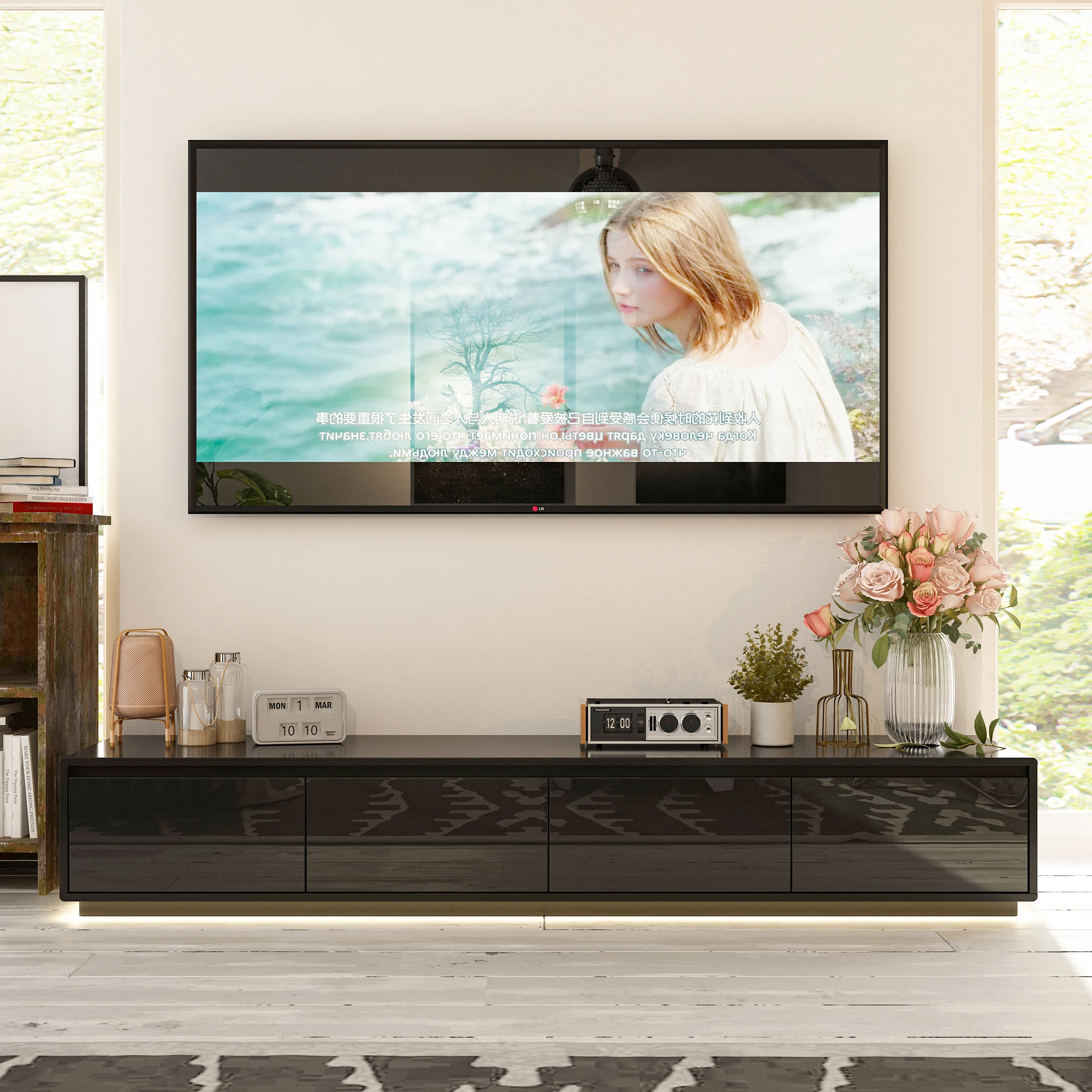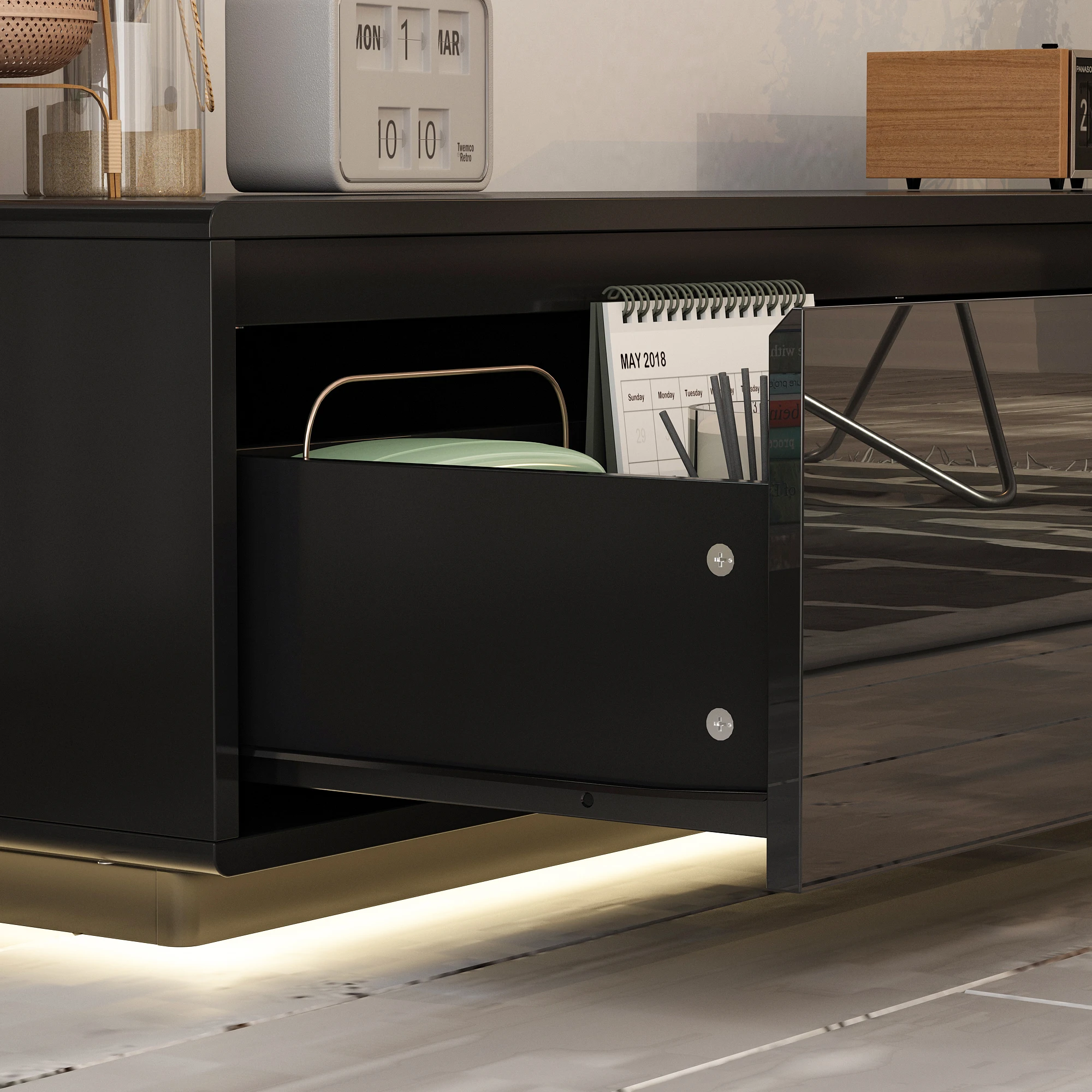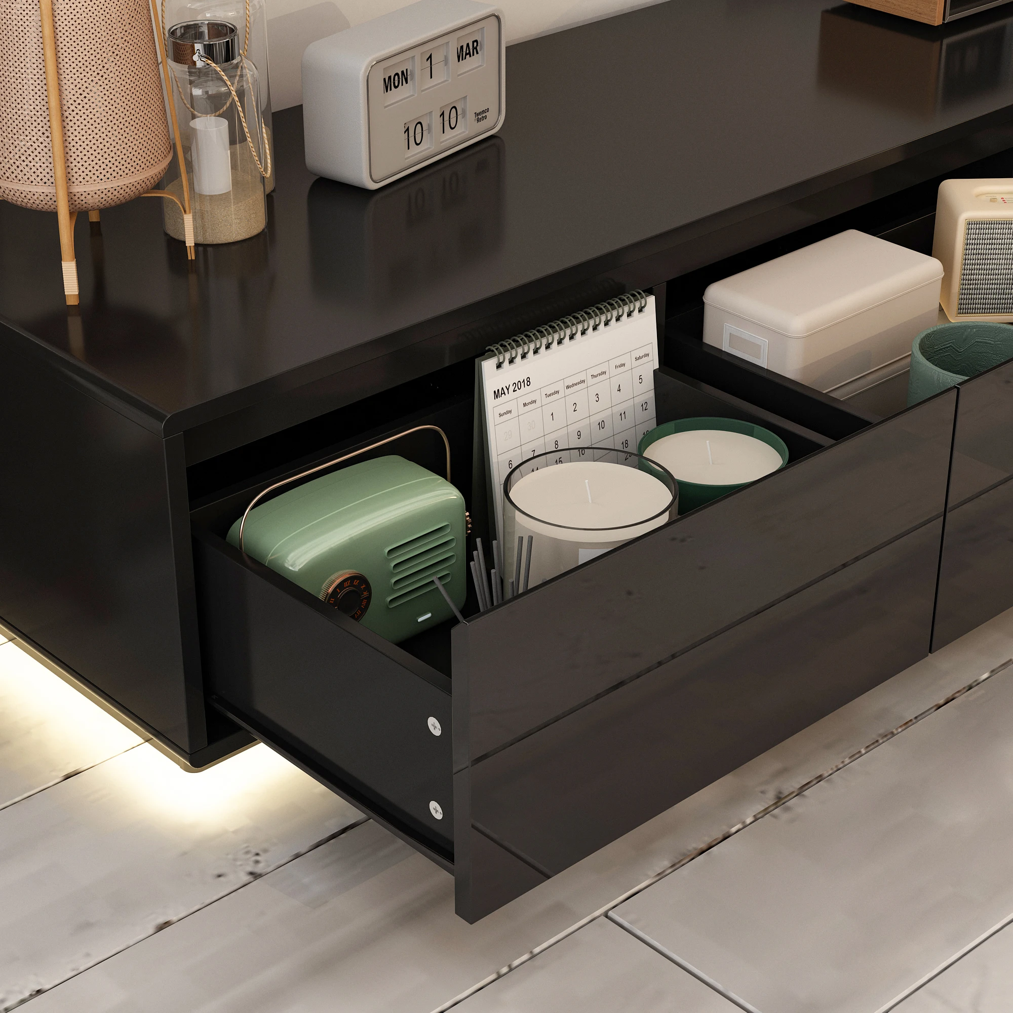 Upgrade your living room with this sleek TV cabinet that combines functionality with modern style. The high-gloss finish creates a striking visual impact, making it the centerpiece of your entertainment area. With multiple storage options including spacious drawers and open compartments, you can keep your space tidy while storing all your media essentials. The adjustable three-color lighting allows you to customize the ambiance, whether you're settling in for a movie night or hosting a gathering. Constructed from durable, eco-friendly materials, this cabinet ensures long-lasting performance and safety. Its versatile design seamlessly integrates into various decor styles, offering the perfect balance between aesthetic appeal and practical storage. Transform your living space into a sophisticated entertainment hub with this must-have TV stand, entertainment console, and media organizer.