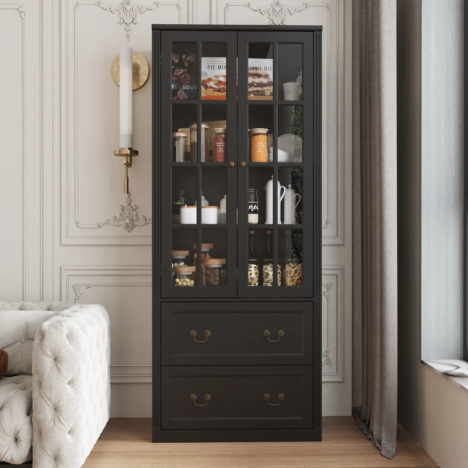 This 78.7'' tall kitchen dining cabinet, featuring two drawers and adjustable shelves, is an exquisite piece that combines functionality with timeless elegance. Painted in a sleek black finish, this sideboard buffet cabinet is perfect for both kitchens and dining areas, offering ample storage and display space while enhancing the overall aesthetic of any room.