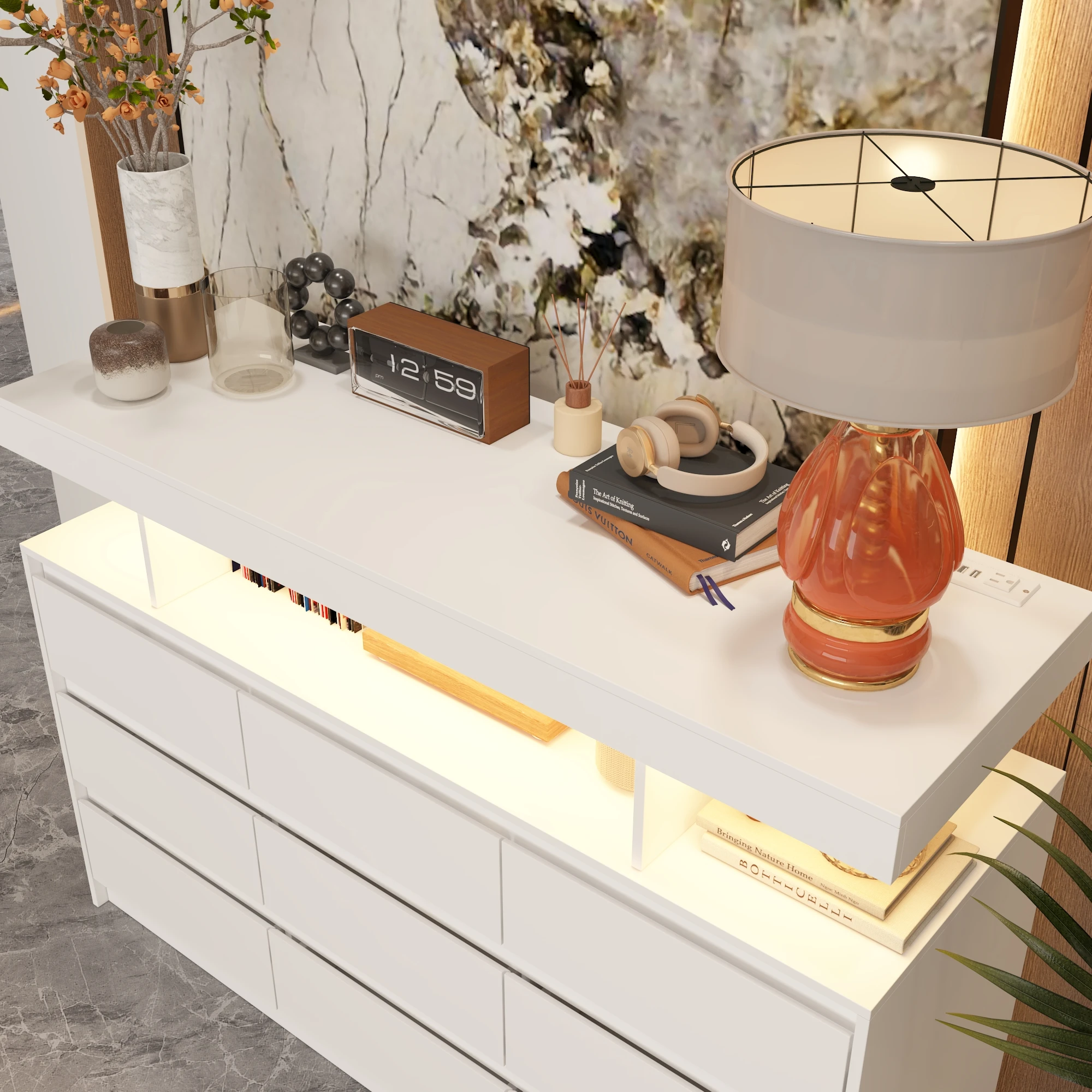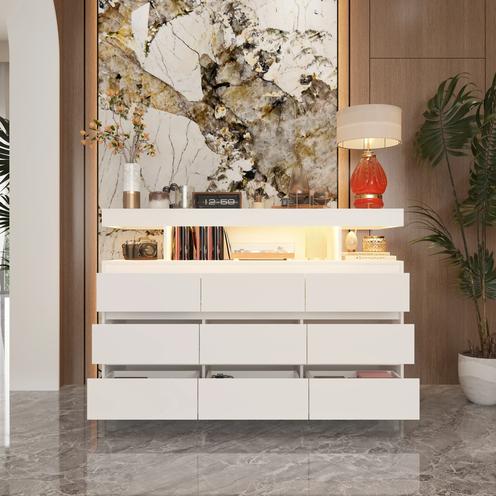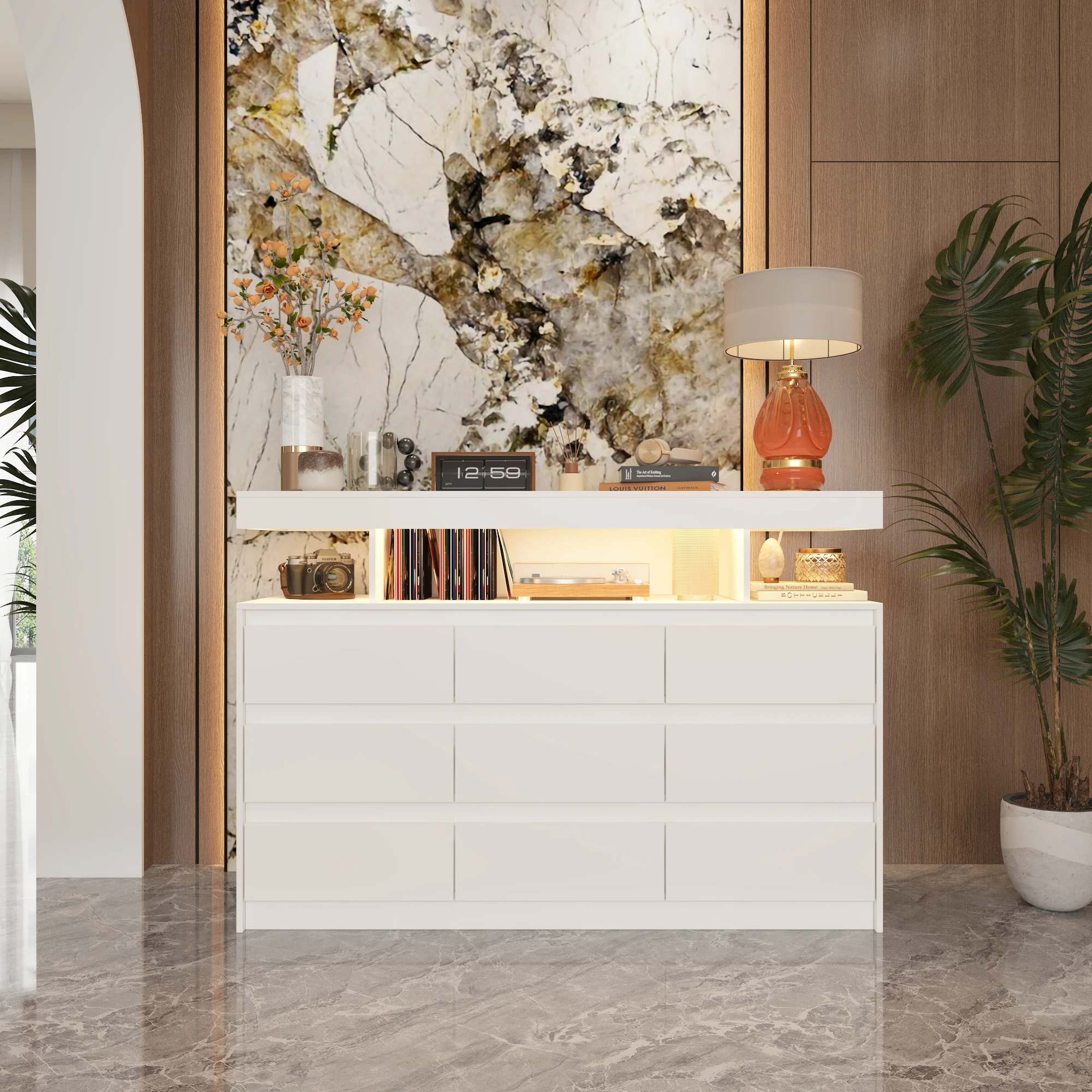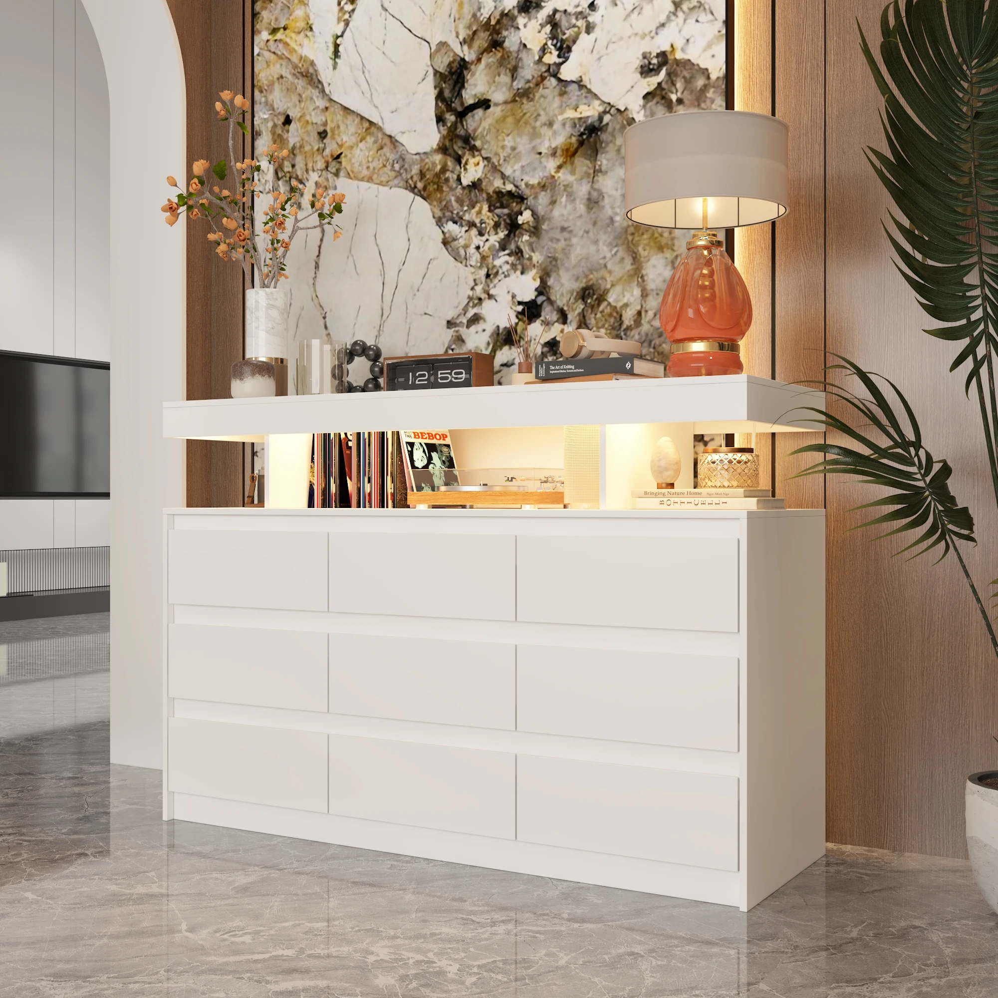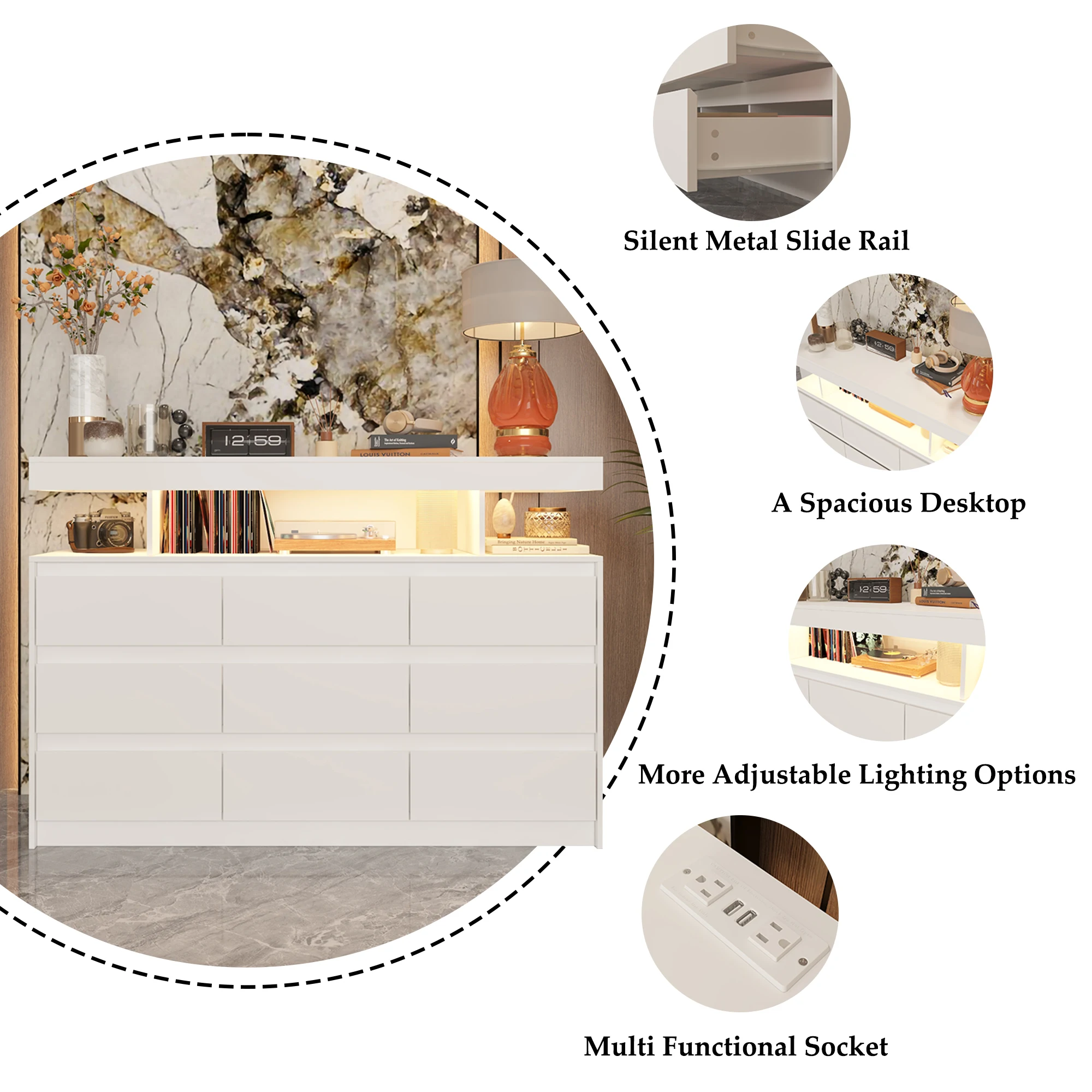 9 Drawer Dresser with LED Lights, Controller & Built-in Power Strip, Handless Chest of Drawers for Living Room, White