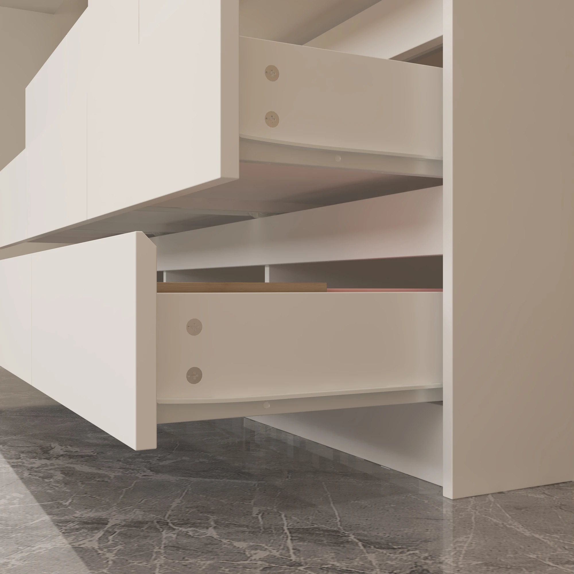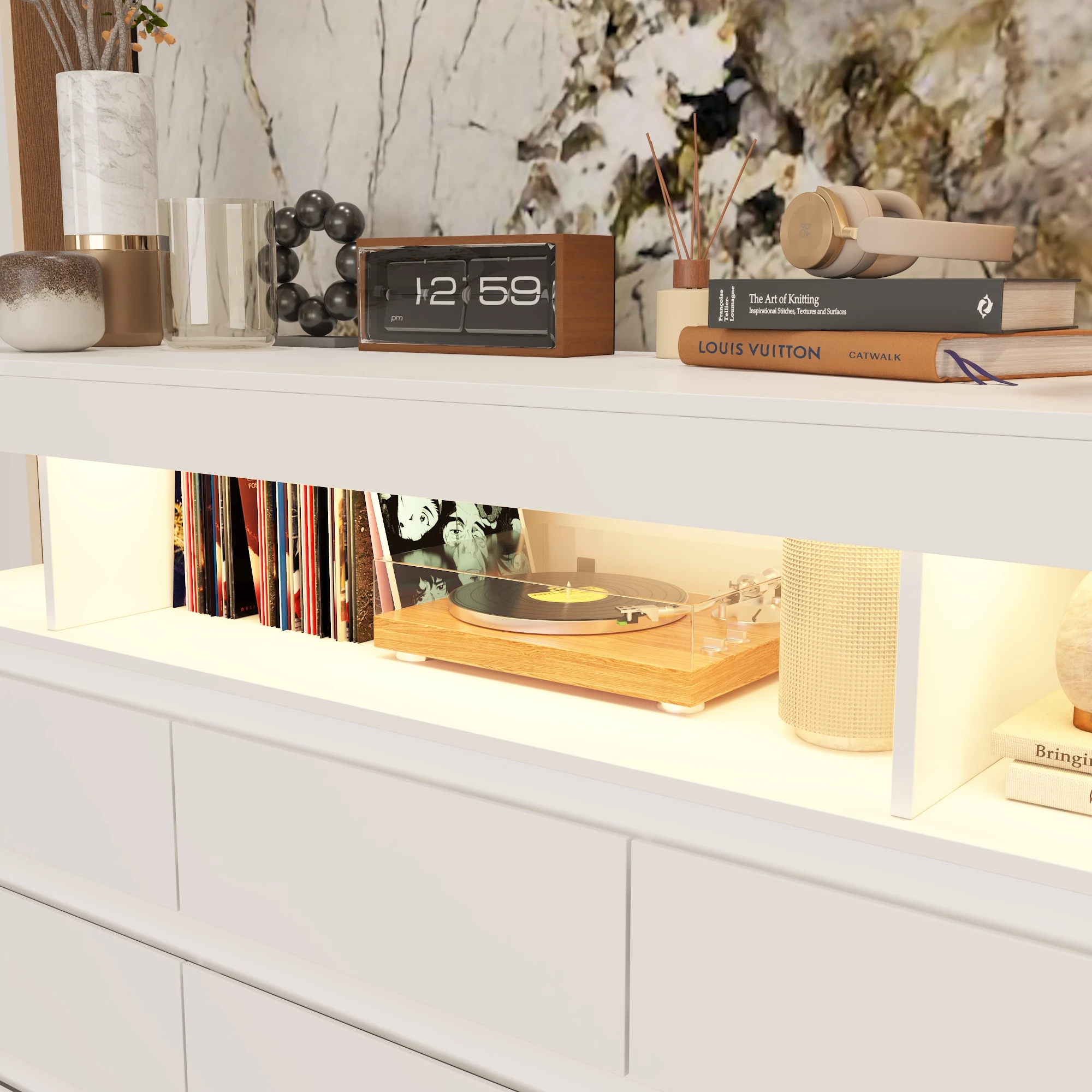 This modern white drawer cabinet is the ultimate blend of style and functionality for your home. With multiple spacious drawers, it provides ample storage for clothes, accessories, and more, helping you maintain an organized and clutter-free living space. The sleek design and pure white finish complement contemporary decor trends, making it a versatile addition to any room. Equipped with silent metal slide rails for smooth operation, a multifunctional socket with USB ports for convenient charging, and adjustable LED ambiance lighting to set the mood, this cabinet enhances both practicality and aesthetics. Use it as a bedroom dresser, living room storage unit – its adaptability ensures it fits seamlessly into various settings, becoming an indispensable piece in your home.
