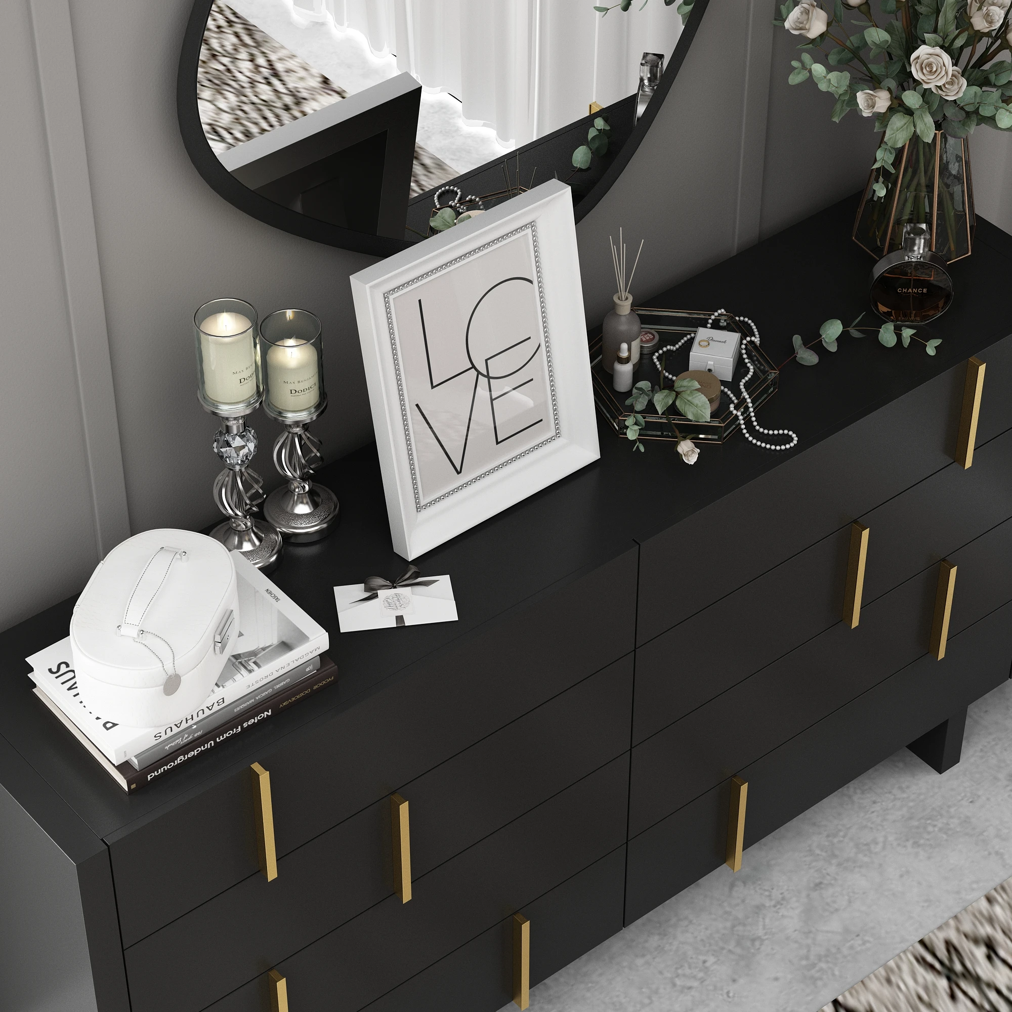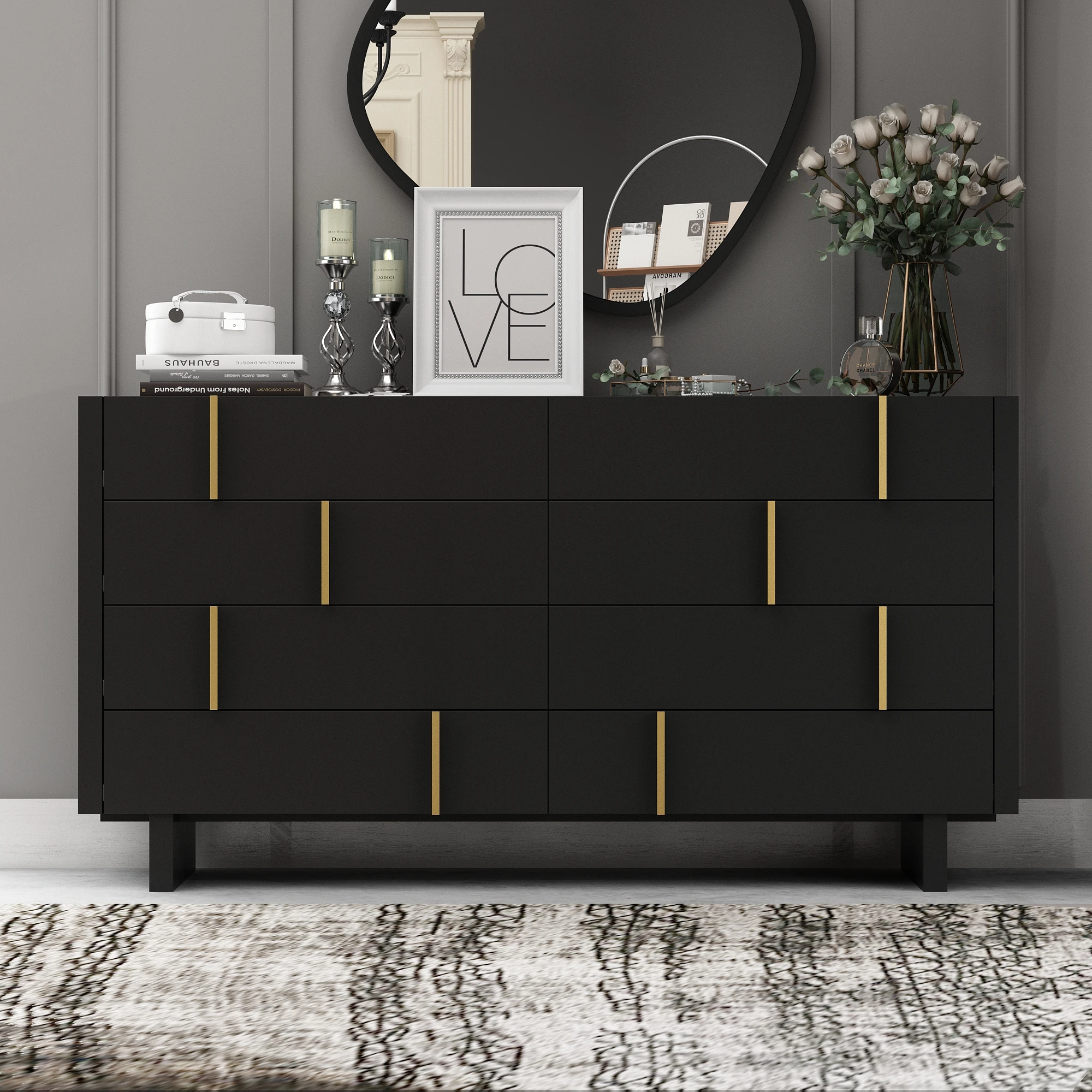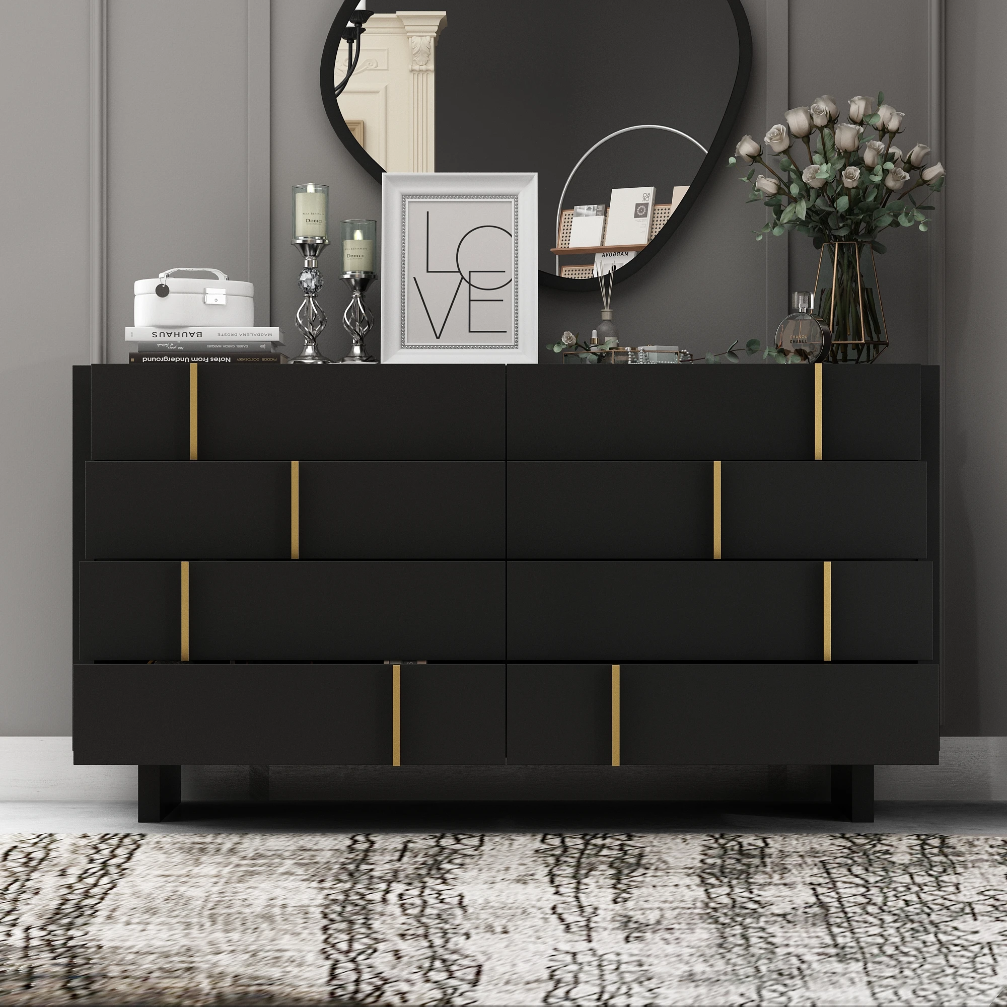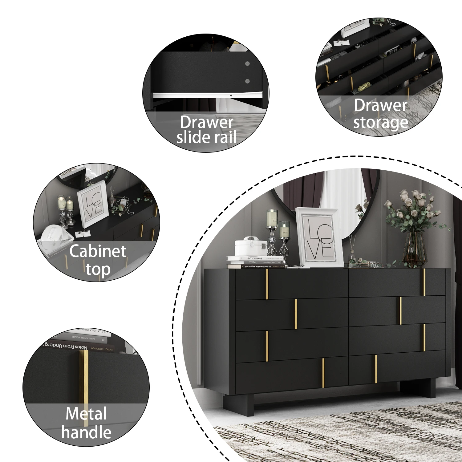 Accent Cabinet Dresser with 8 Drawers, Modern Chest of Drawers with Gold Handles for Bedroom & Living Room, Black