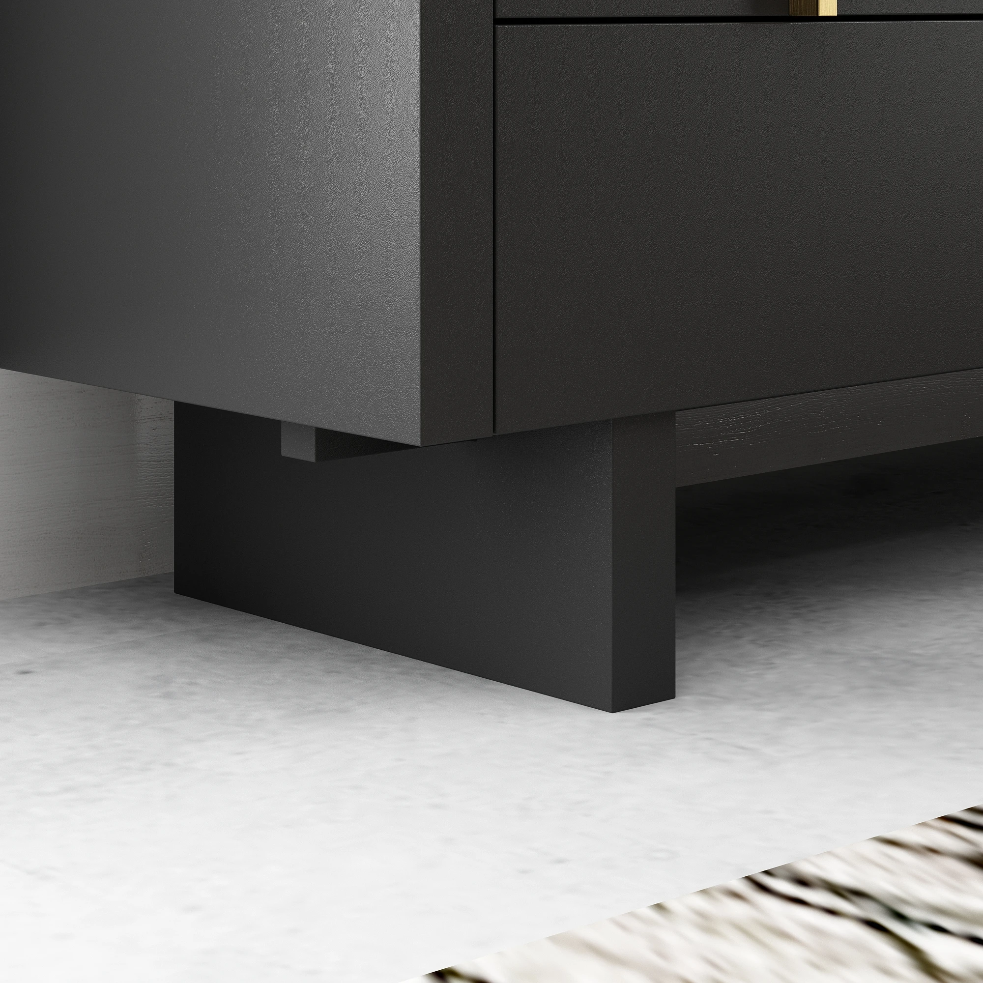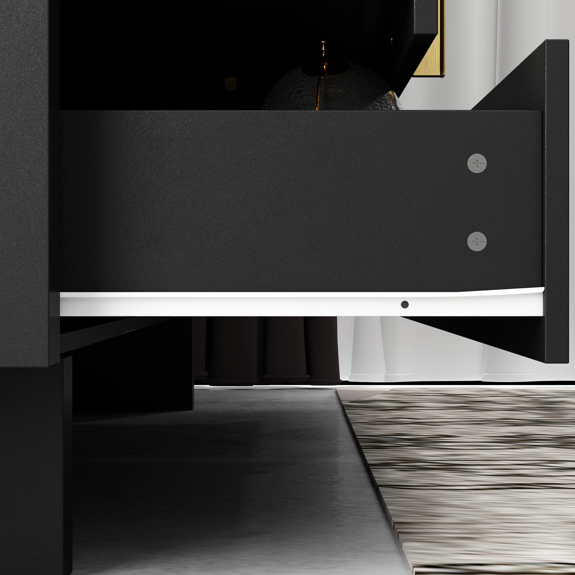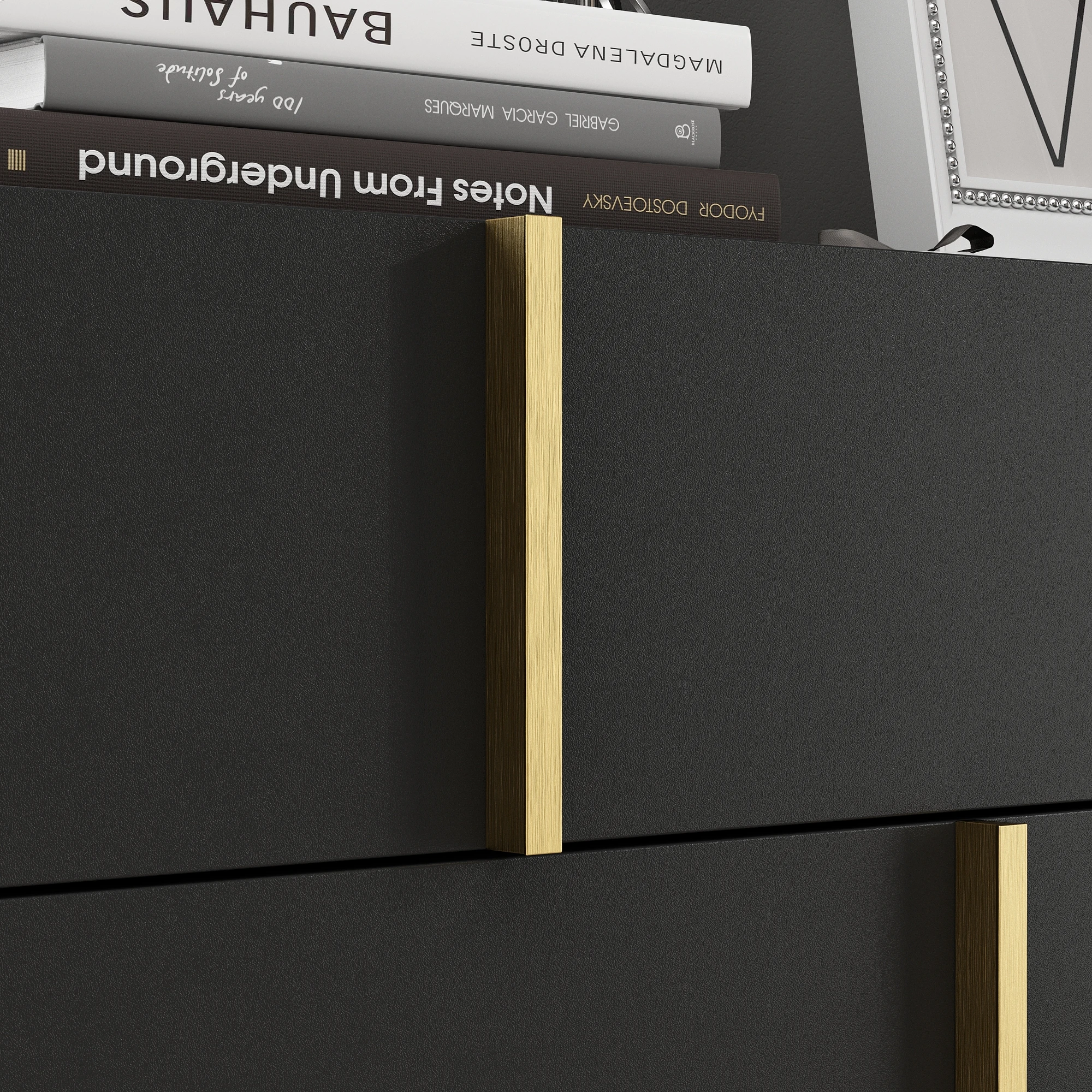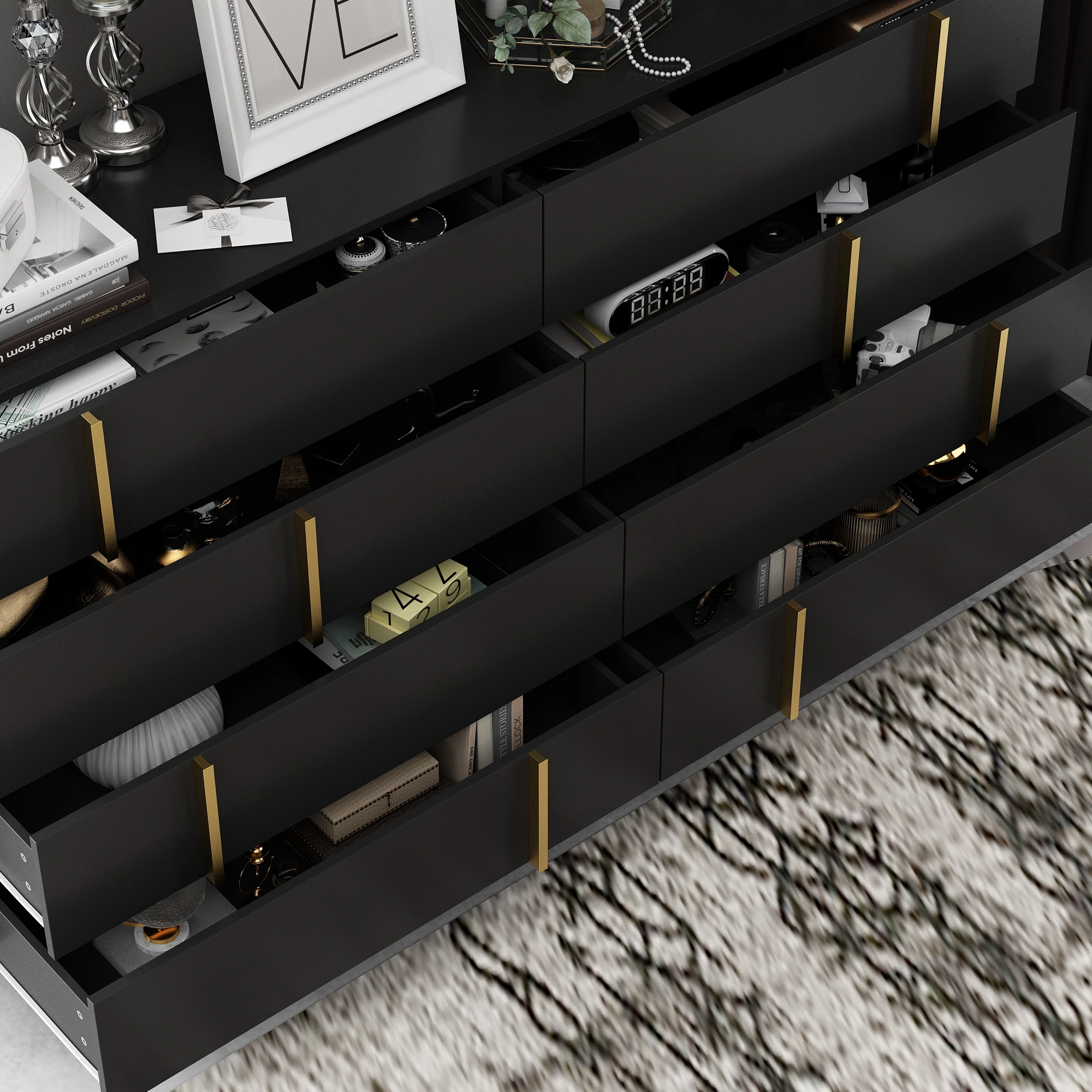 Crafted with premium P2 MDF material, this sleek black cabinet combines modern elegance with practical functionality. Featuring 8 smooth-sliding drawers, it offers ample storage space for clothing, accessories, or decor items. The gold-toned handles and minimalist design blend effortlessly into any living room or bedroom. With anti-tip brackets for added safety, this versatile piece serves as a stylish sideboard, storage cabinet, or even a dresser.