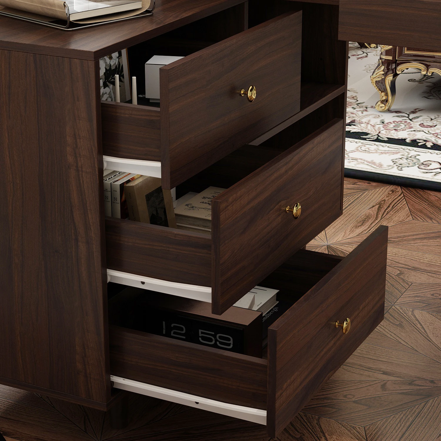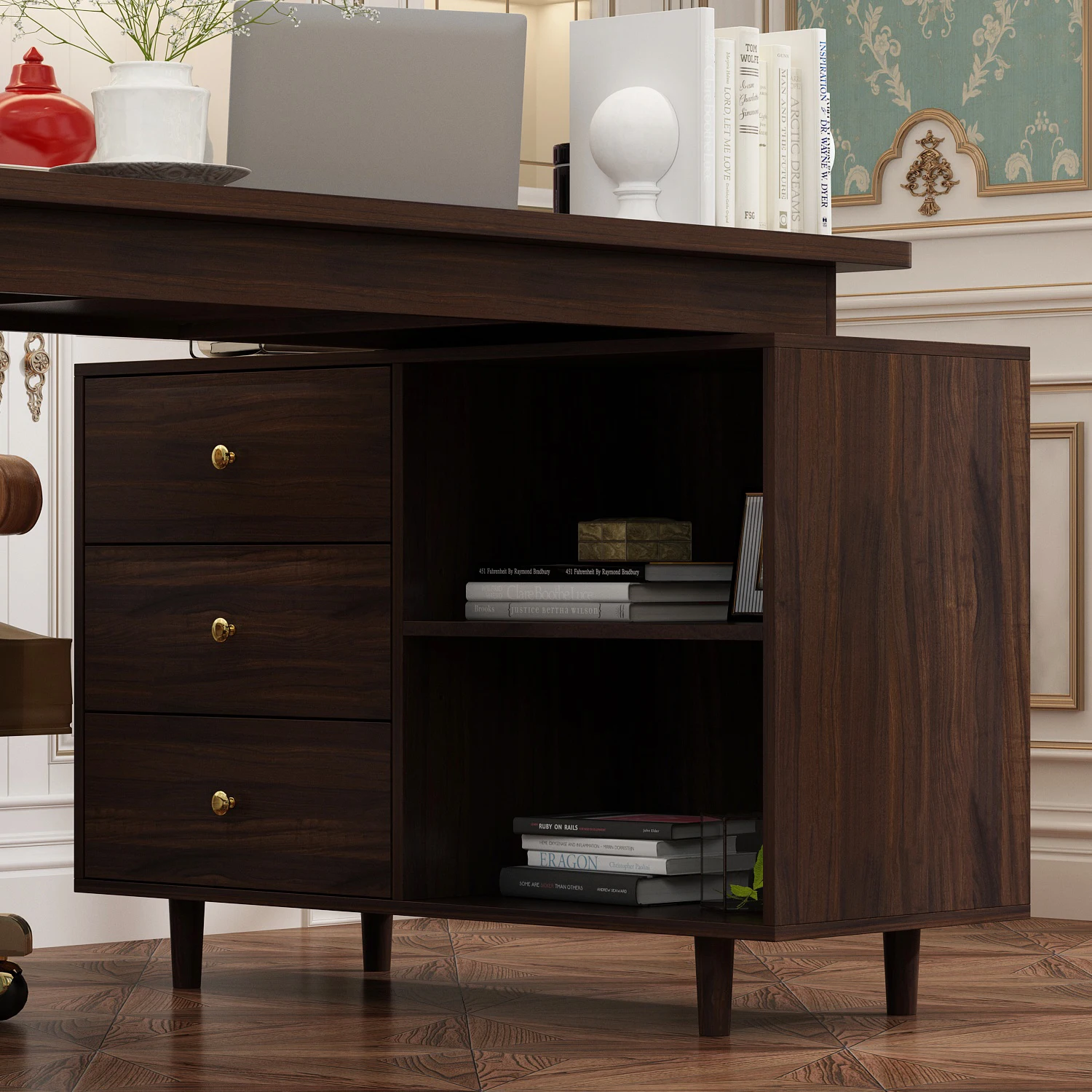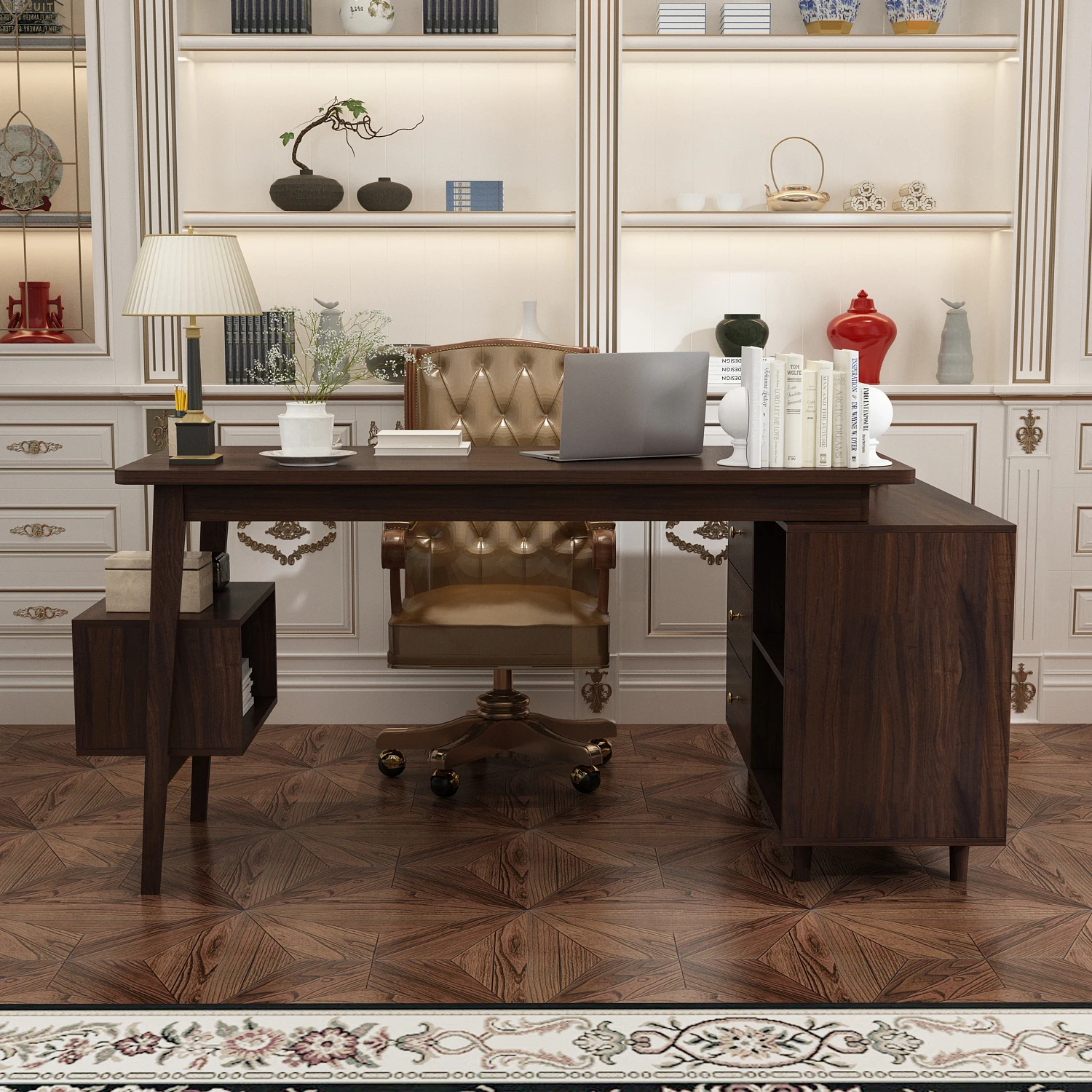 【Ample Storage Solutions】This desk comes with a left-side cabinet boasting multiple drawers to organize files and stationery, a hidden drawer for small essentials, and a right-side shelf for books or decor—keeping your workspace neat and tidy.