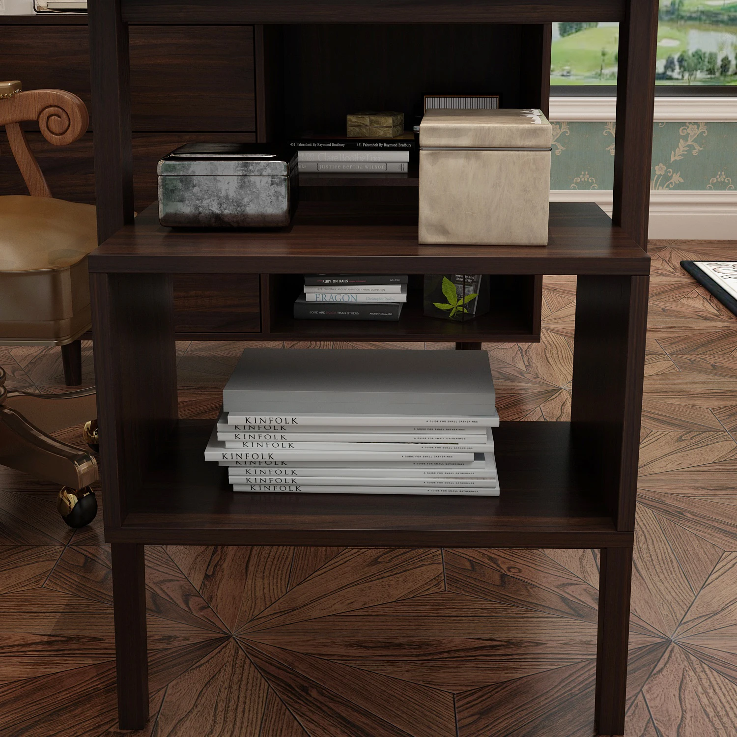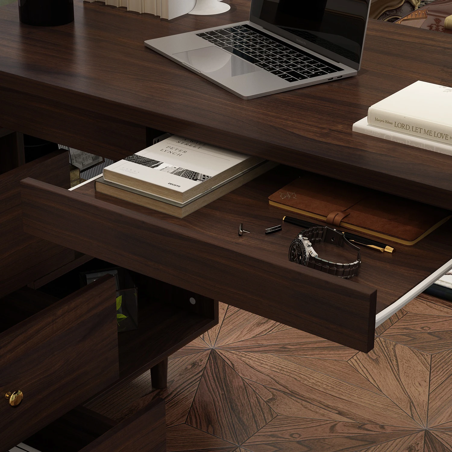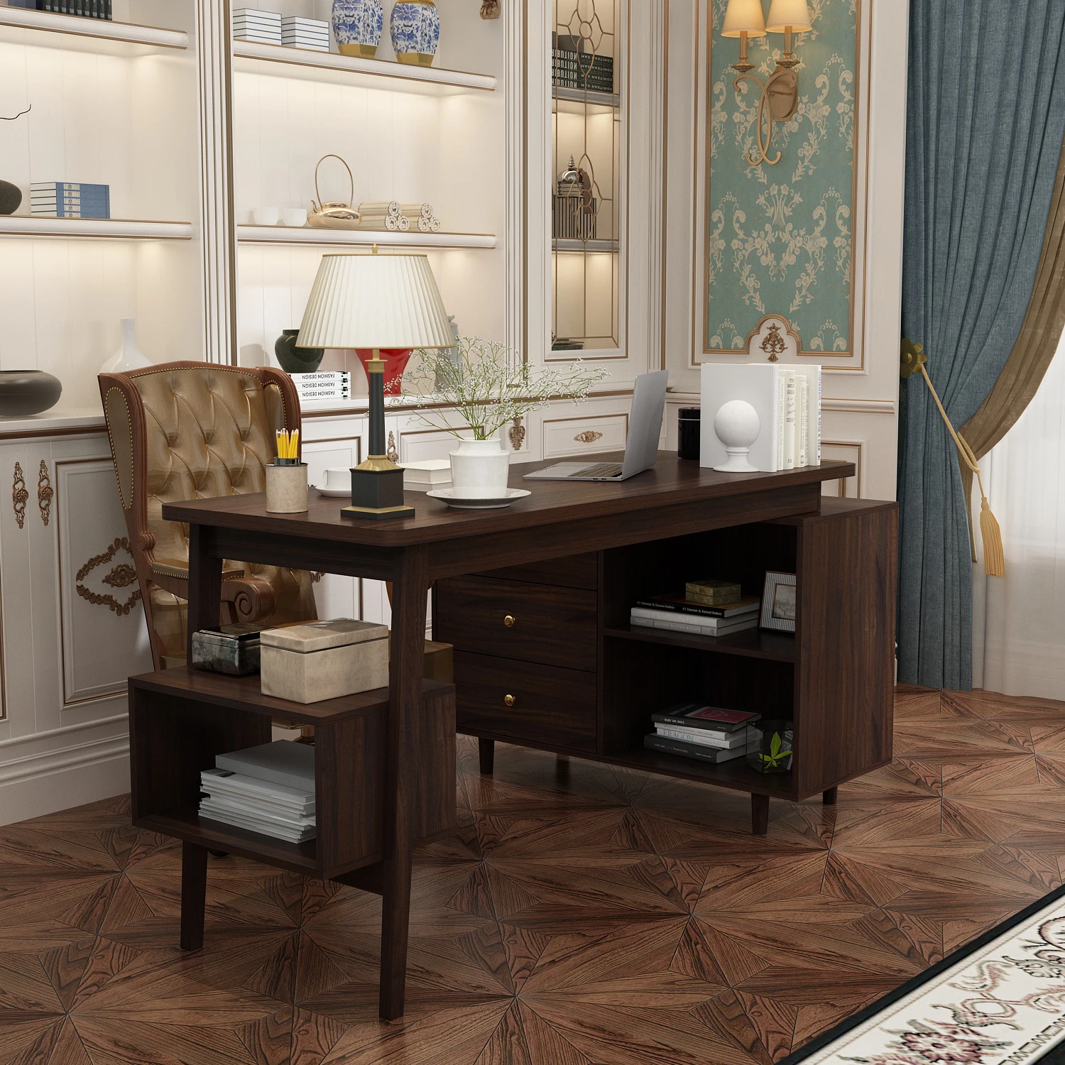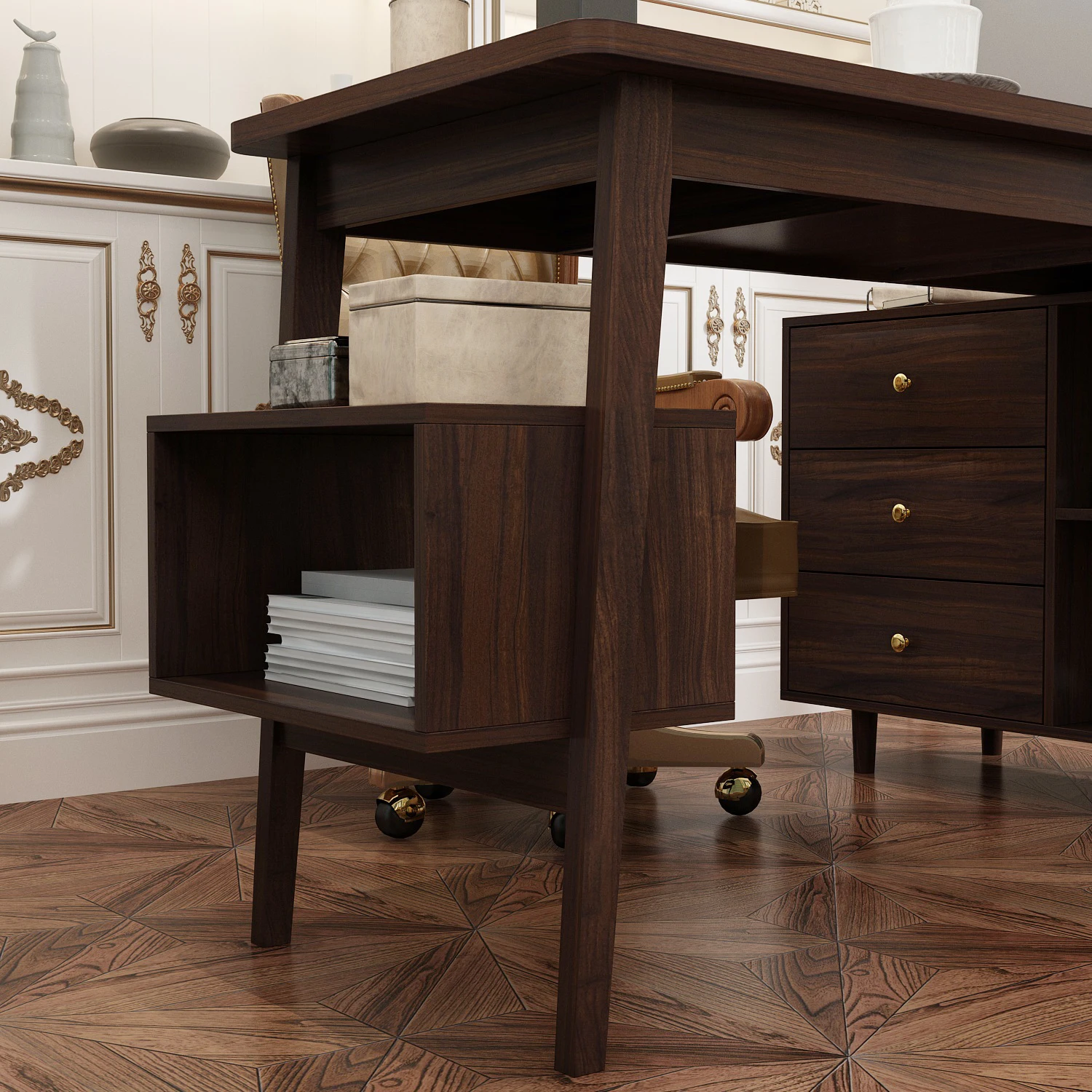 【Ample Storage Solutions】This desk comes with a left-side cabinet boasting multiple drawers to organize files and stationery, a hidden drawer for small essentials, and a right-side shelf for books or decor—keeping your workspace neat and tidy.