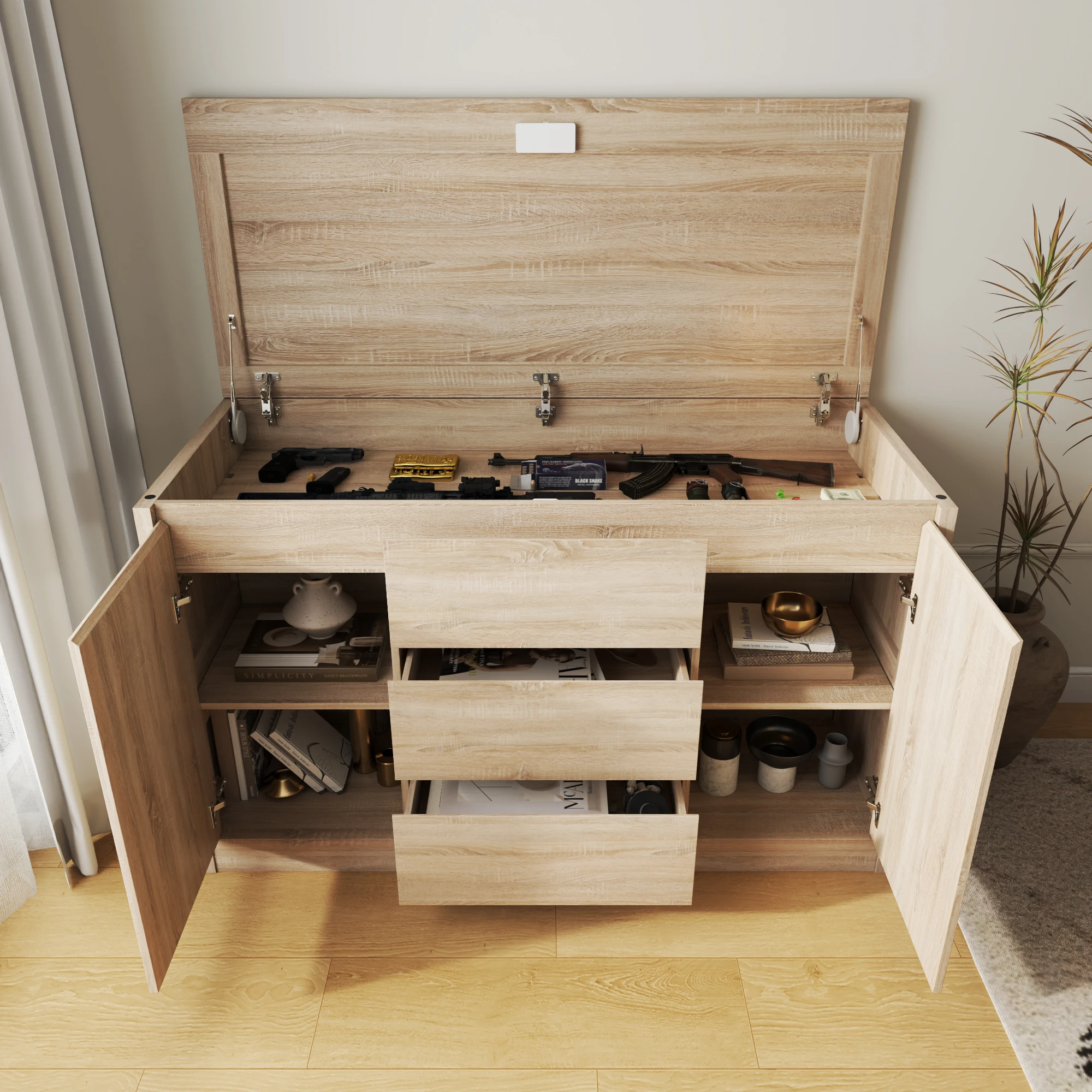 This storage cabinet combines style, security, and practicality. It features a warm wood-tone finish, durable MDF construction, 2 doors (with hidden compartments inside) plus 3 drawers, and a top NFC-lock flip door. Versatile for various indoor spaces and easy to assemble, it’s an excellent storage solution for any home.