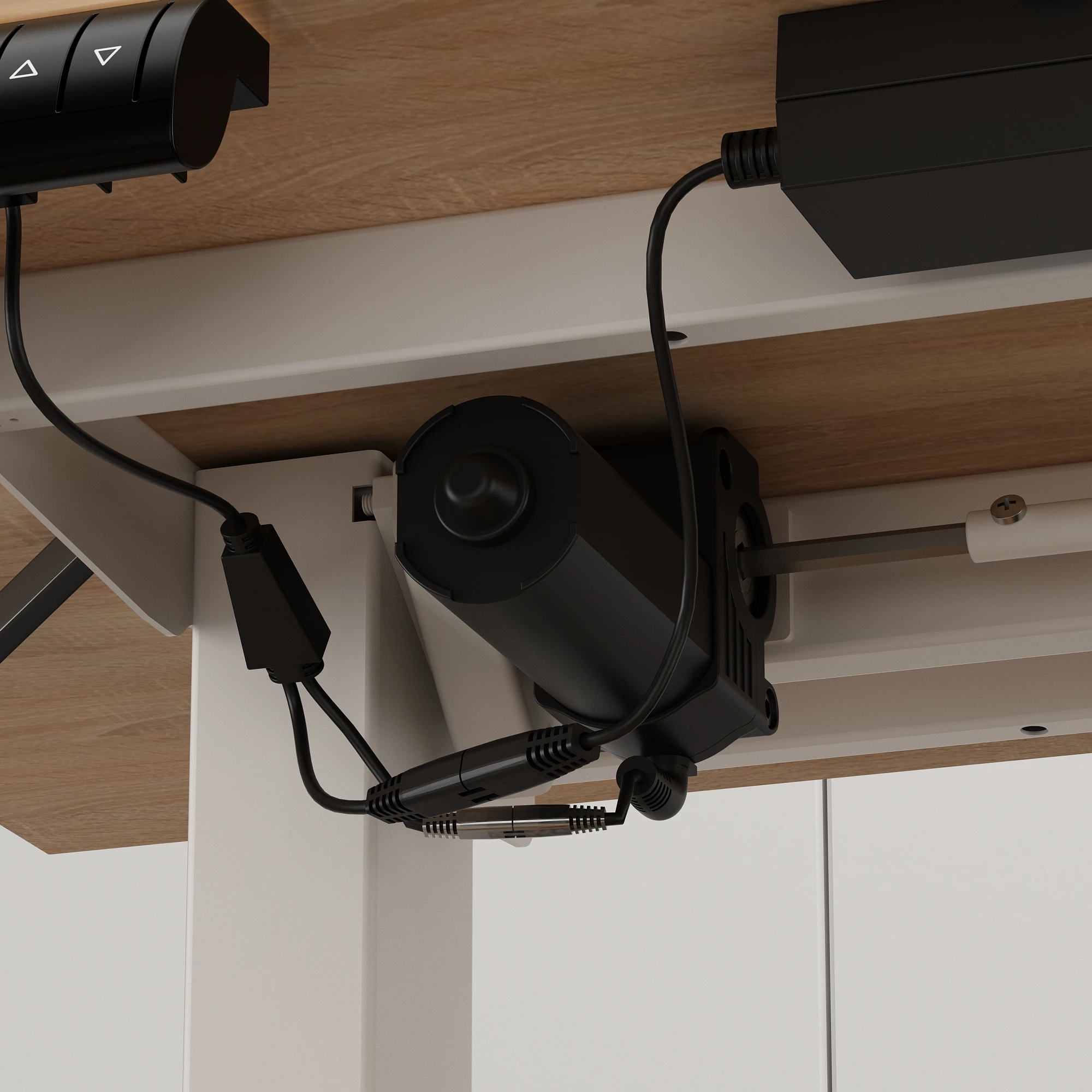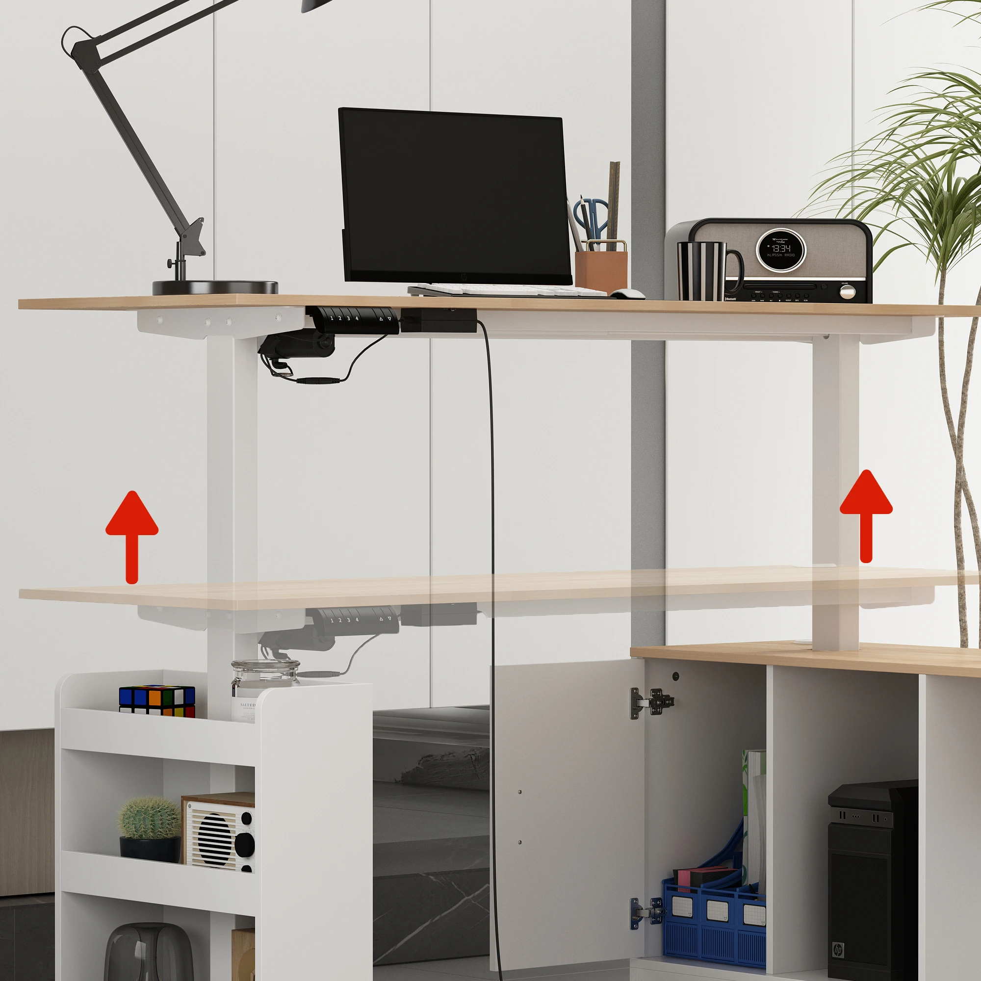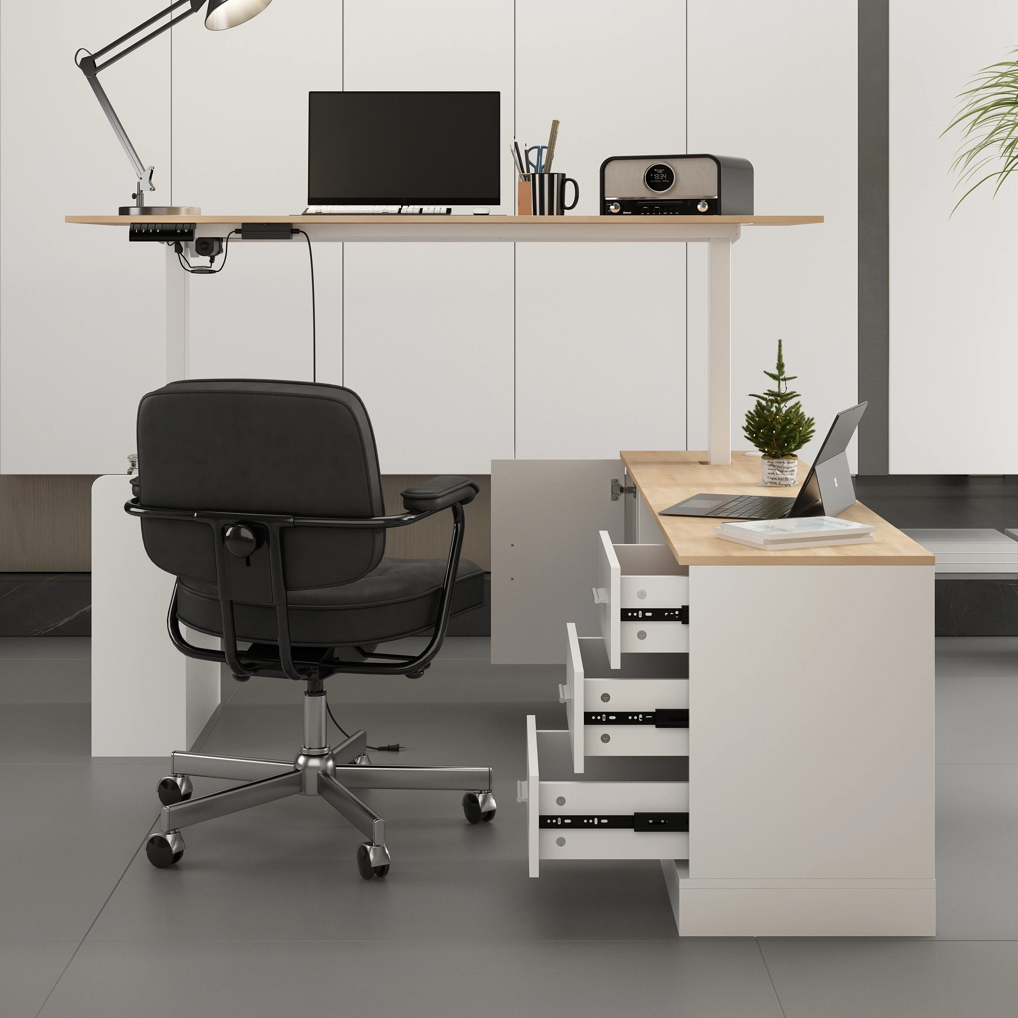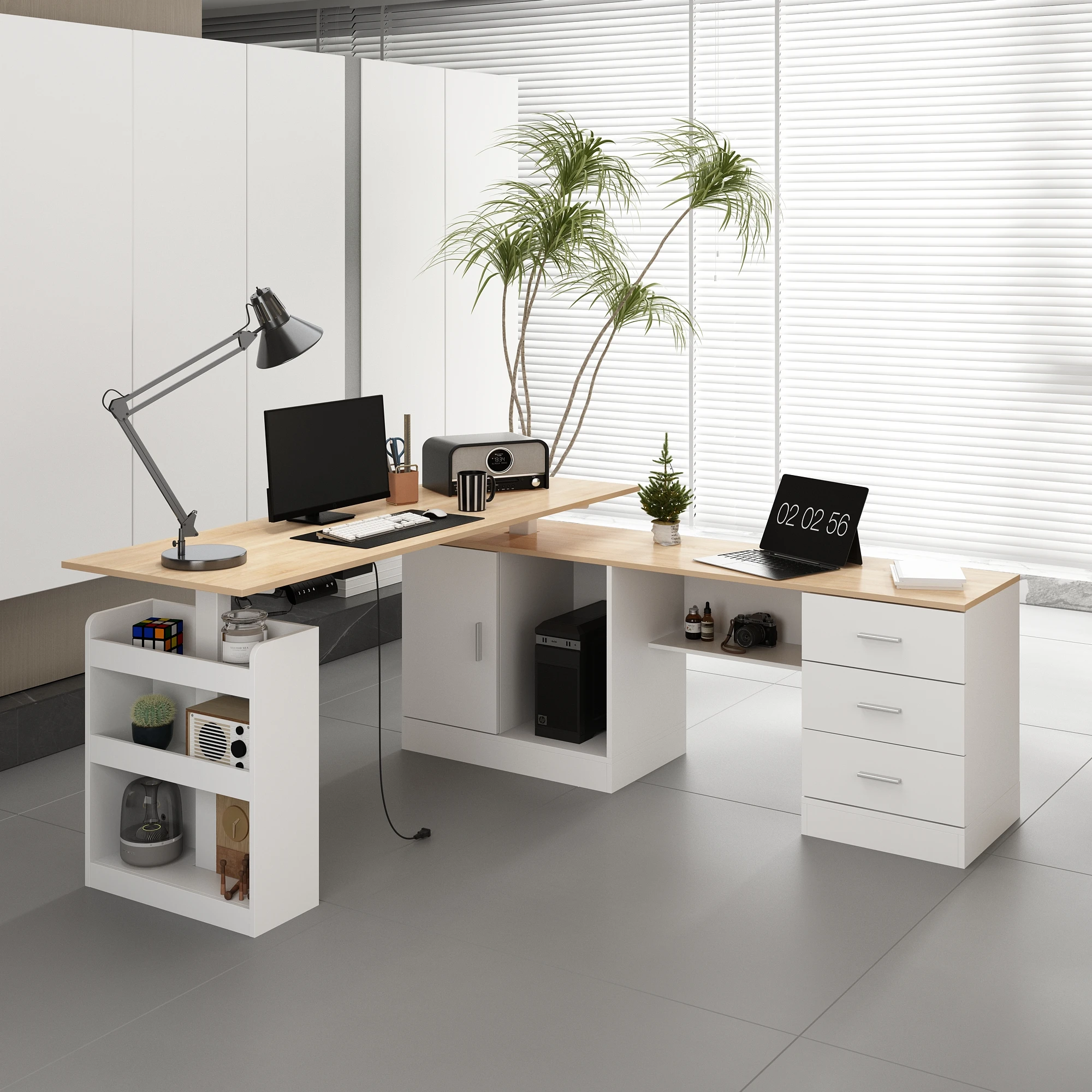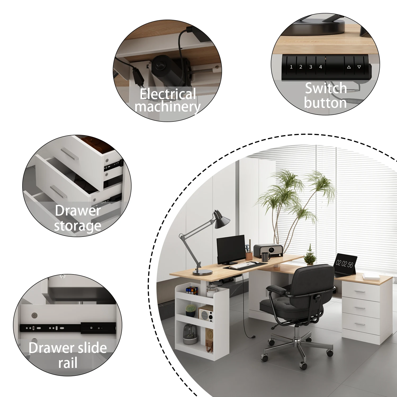 Electric Adjustable Computer Desk with Switch Button, L-Shape Desk with Drawers & Cabinets for Office, White & Oak