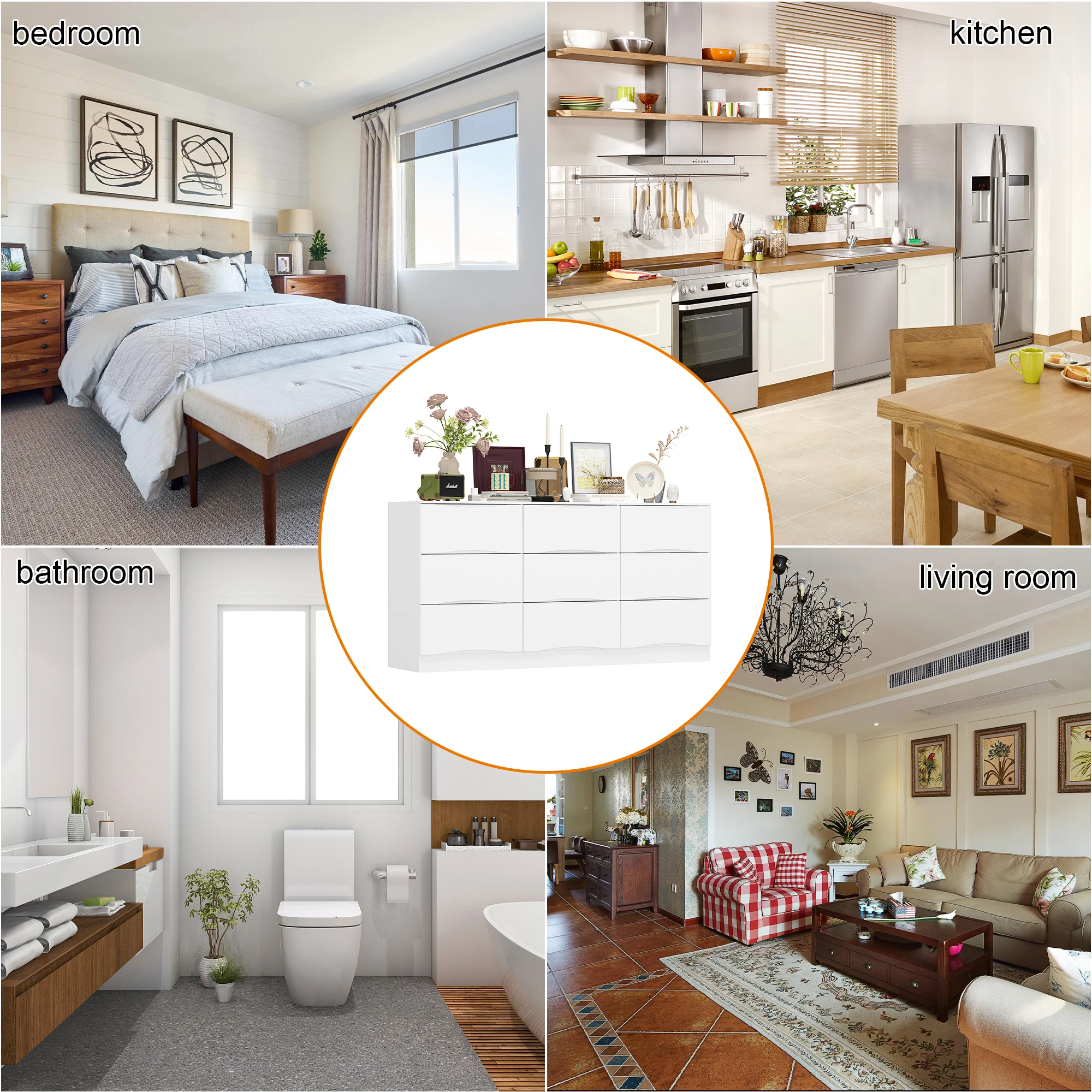 【Clean Design】This nine-drawer cabinet features a sleek white finish and rounded edges that fit seamlessly into any room decor. Its versatile design makes it perfect for use as a bedroom dresser, hallway sideboard, or bathroom storage unit, adding a touch of modern elegance to your space.