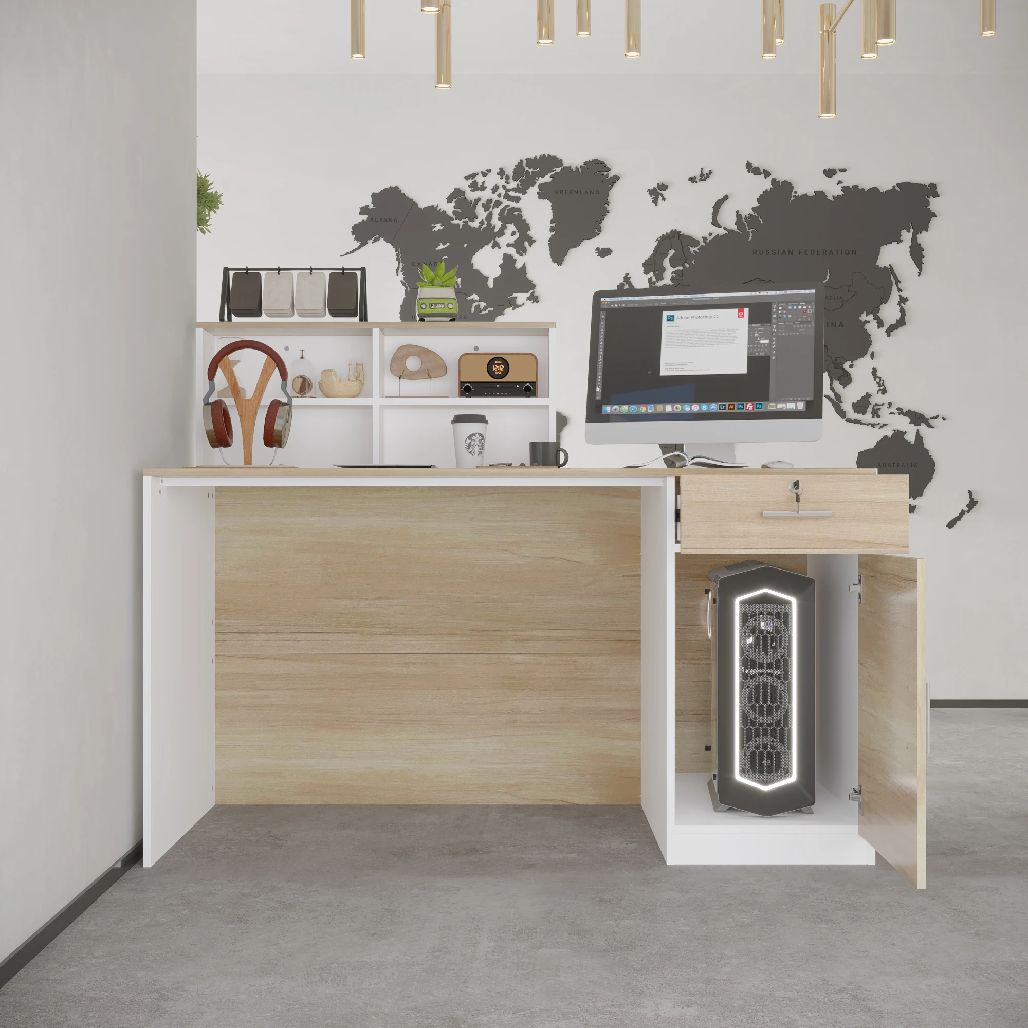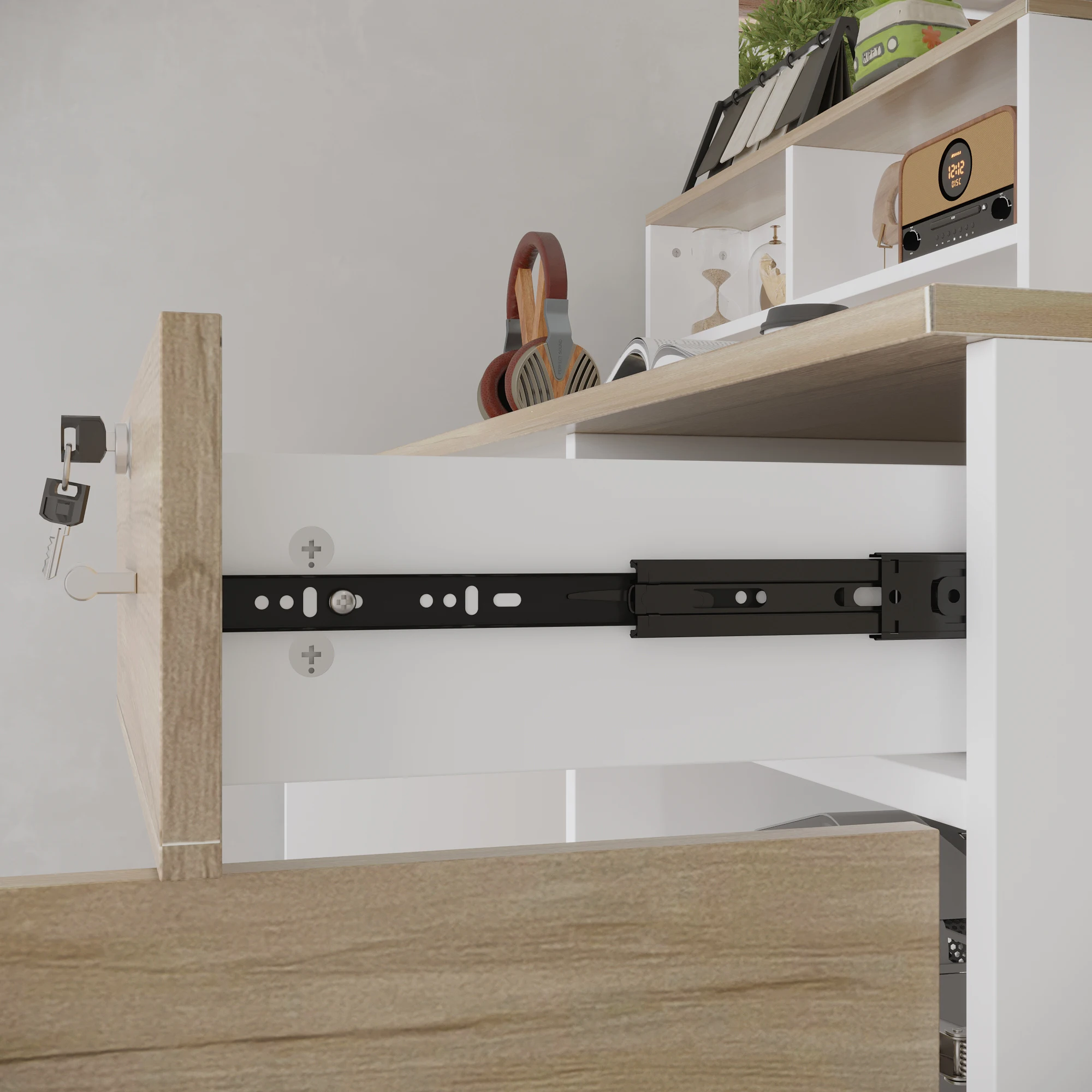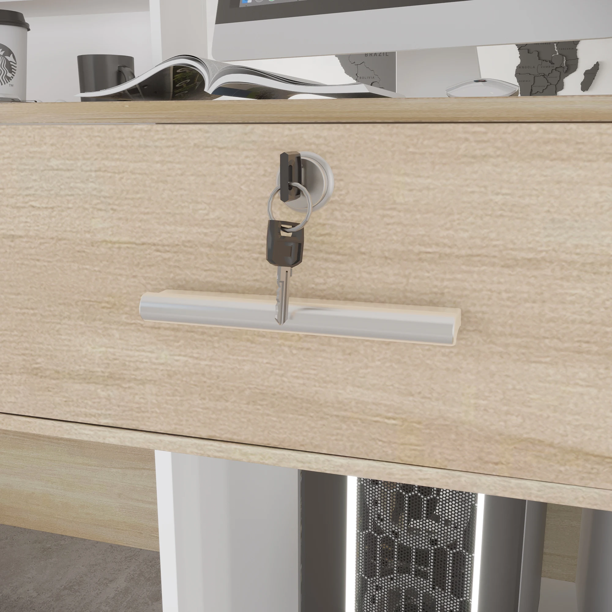 The reception desk is the perfect blend of style and functionality. Its modern design with warm white and wood grain tones creates an inviting atmosphere that enhances the first impression for visitors. Crafted from durable P2 MDF material, it offers a smooth and sturdy surface that can withstand daily use. The desk includes secure storage options with lockable drawers and cabinets, providing a safe space for storing valuable items and documents. The convenient cable hole helps keep wires organized and maintains a clean look. Whether you need it for an office lobby, hotel front desk, or retail store, this versatile reception desk adapts effortlessly to various environments. It's the ideal solution for businesses seeking a professional and practical reception area.