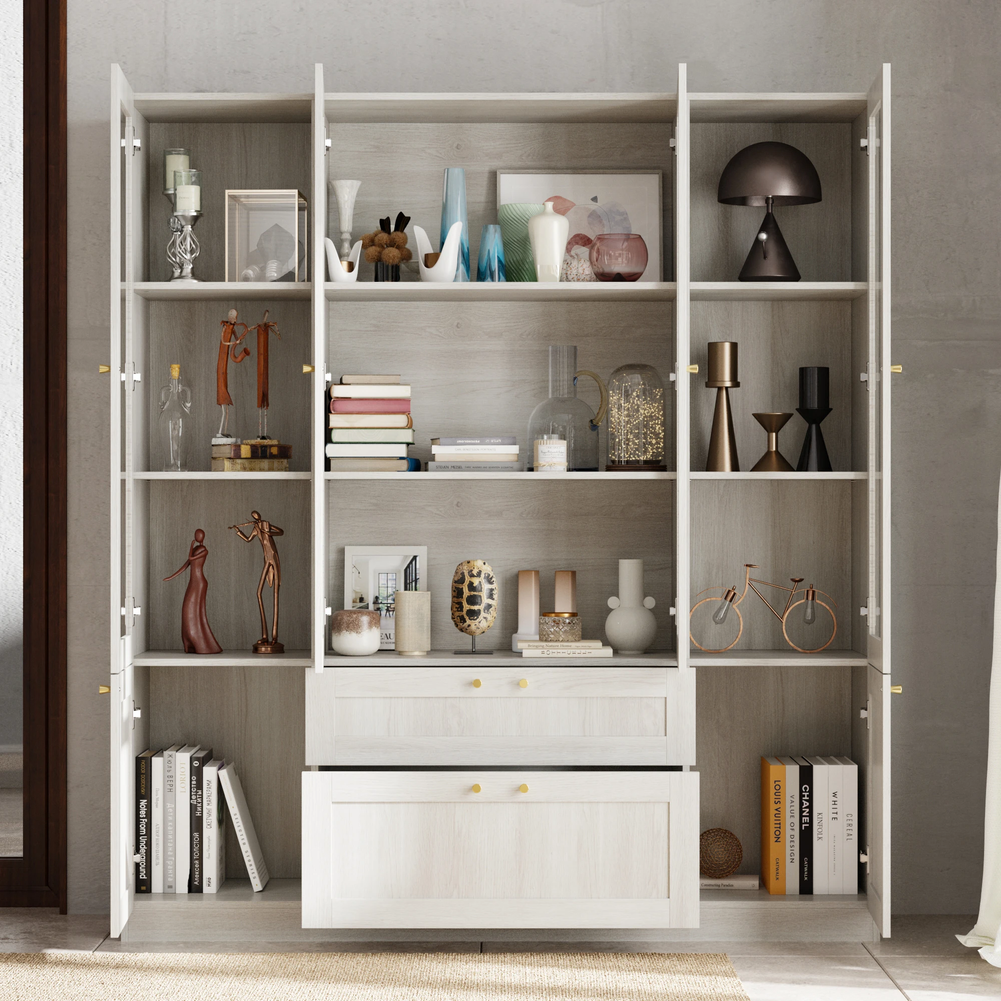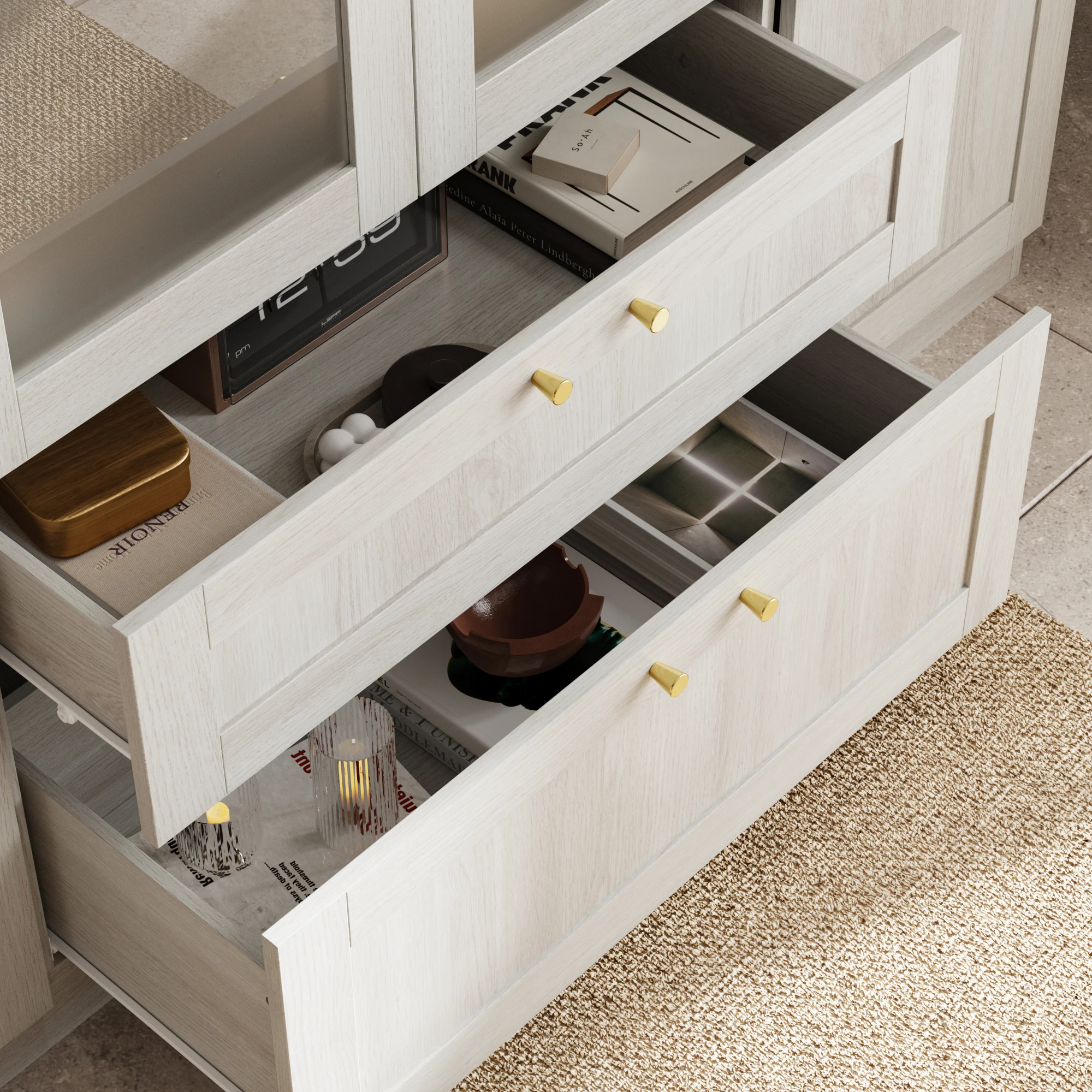 Elevate your space with this chic display cabinet—your go-to for showcasing treasures and tucking away essentials! Adjustable shelves let you flaunt tall vases, books, or decor, while frosted glass doors add a polished, private touch and cut down on dust. Gold-tone handles bring luxe style, and two deep drawers hide gadgets or clutter. Built from durable wood and glass, it’s sturdy enough for years of use.It is perfect for living rooms, dining areas, or offices.