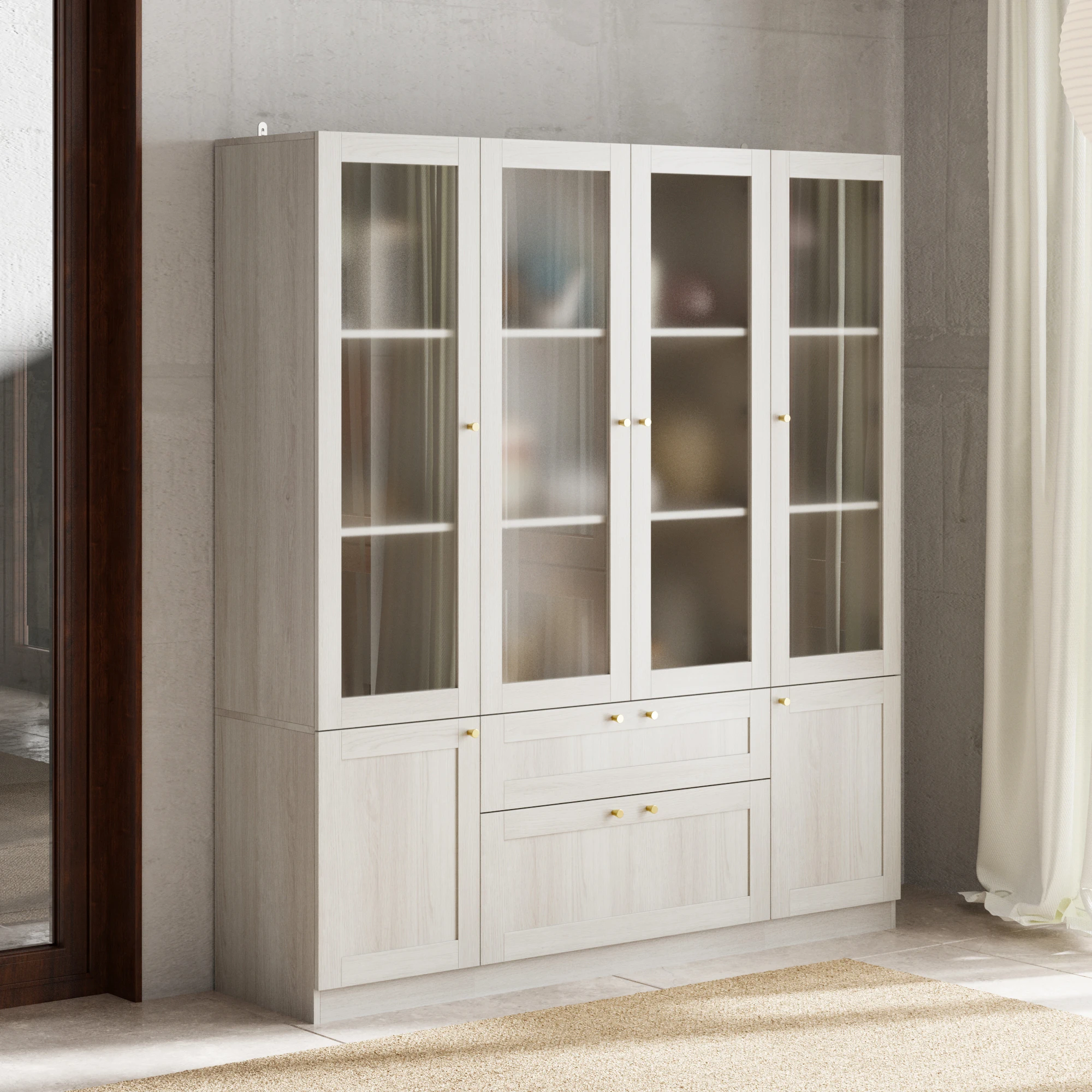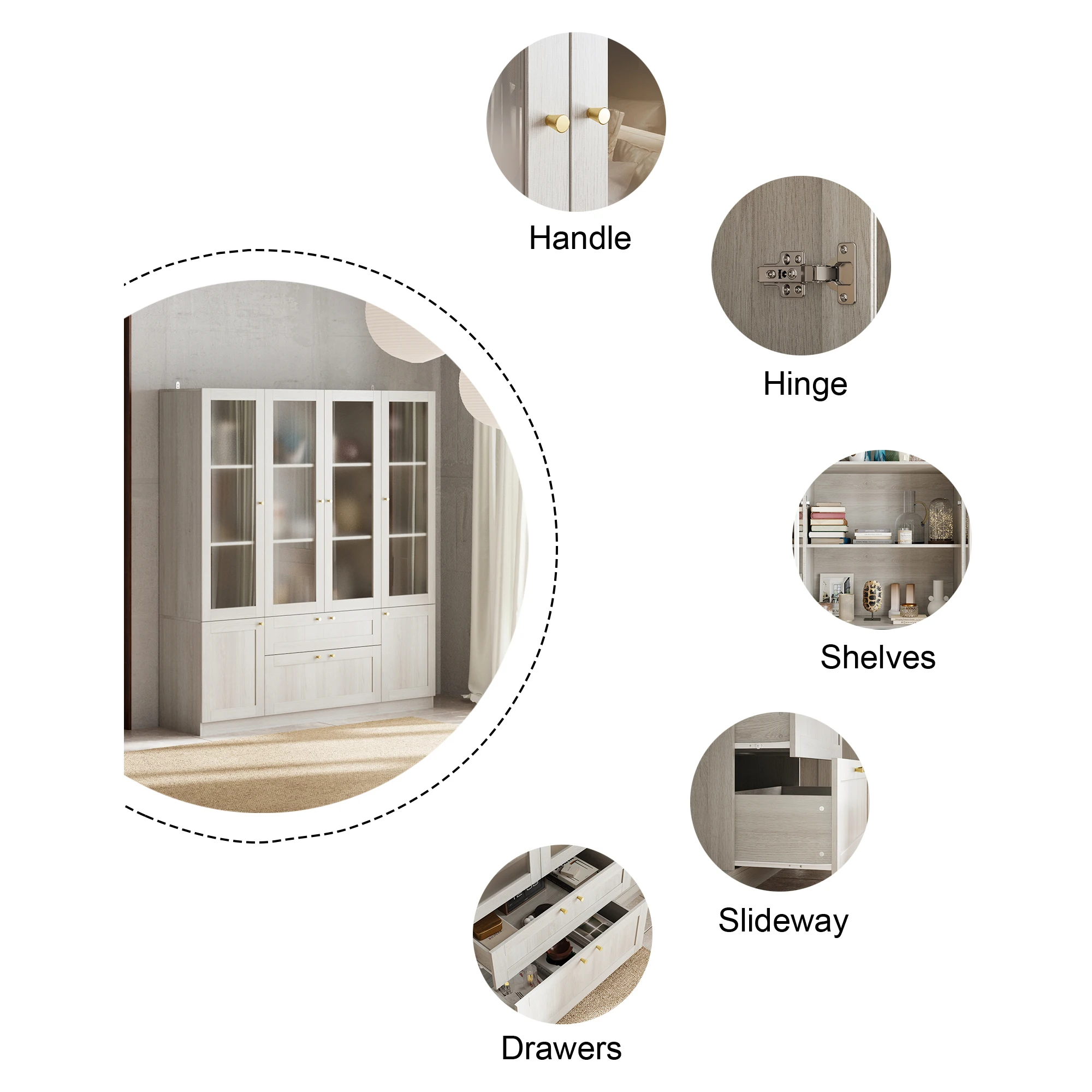 Glass Display Cabinet with 2 Drawers & 6 Doors, Bookcase with Golden Handles & Open Shelves for Living Room, White