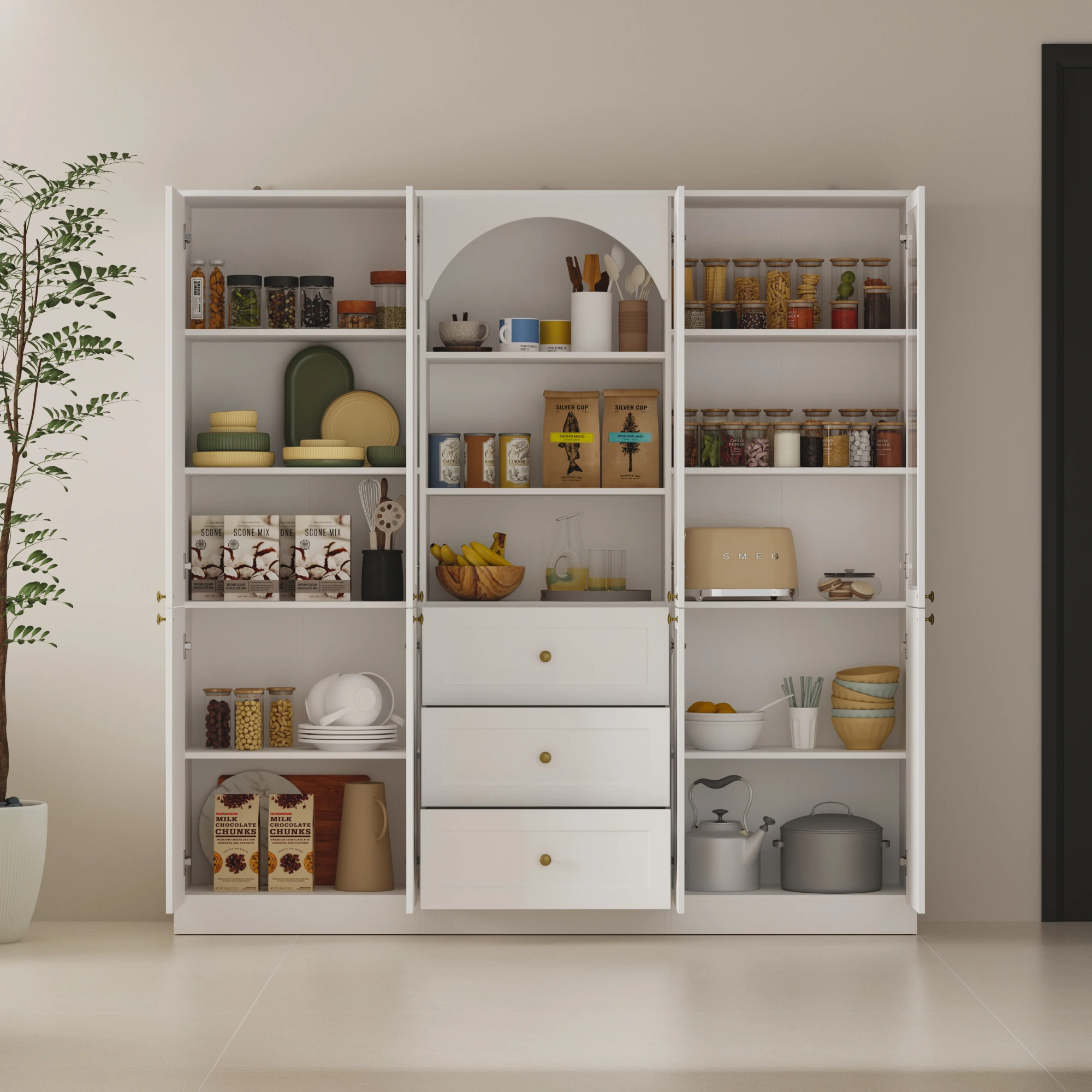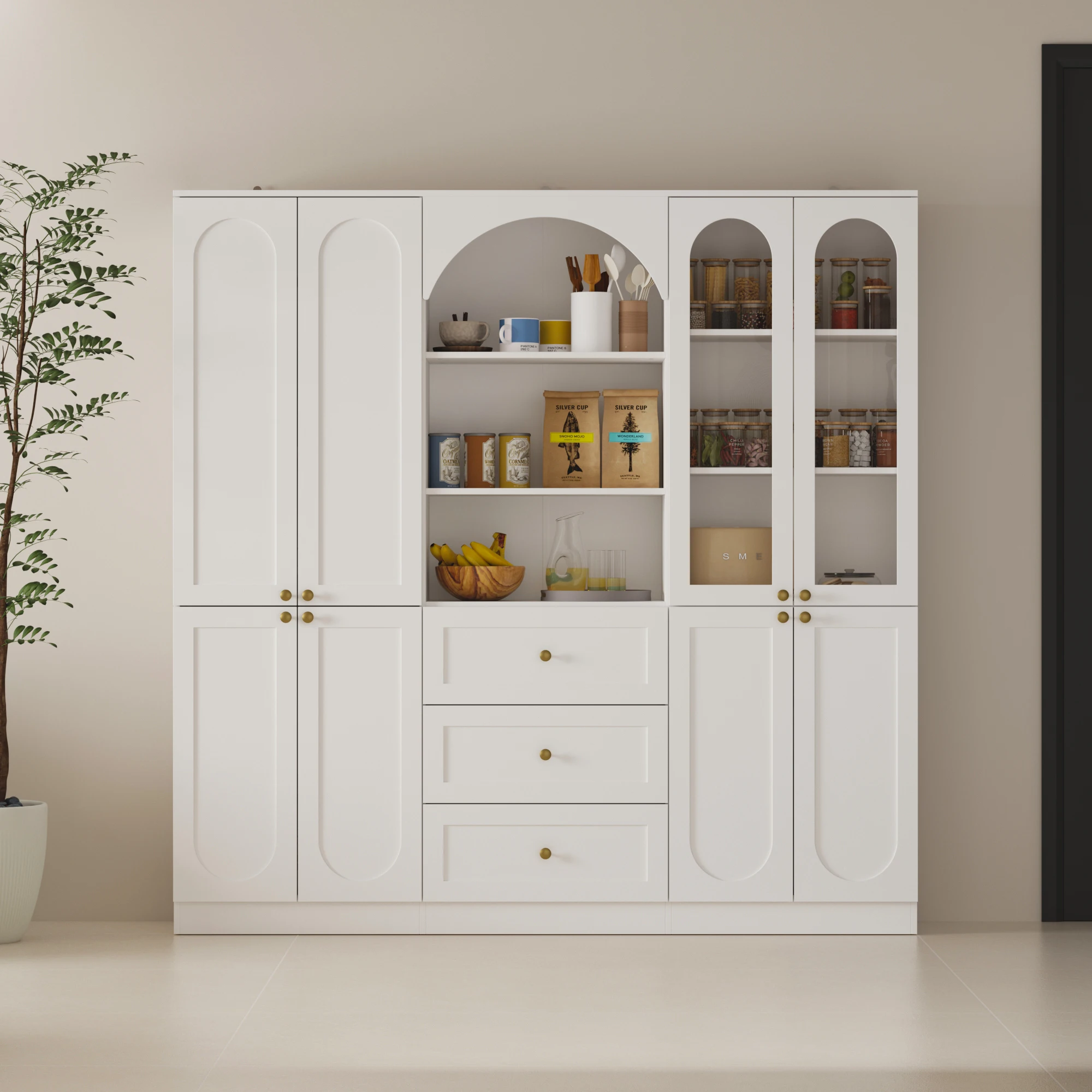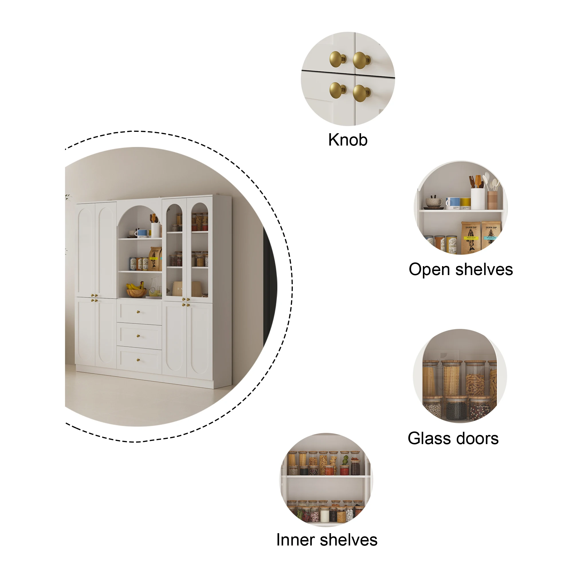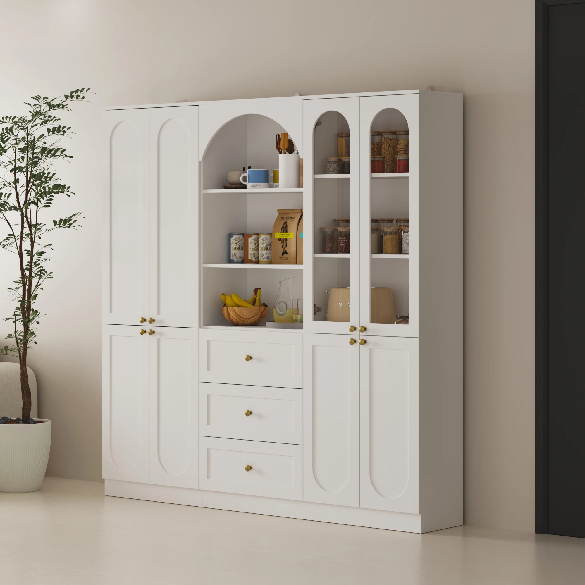 This modern cabinet combines style and functionality to enhance your home storage. Featuring an elegant arched top and golden knobs, it adds a sophisticated touch to any space. Made from durable P2 grade MDF, it provides a smooth surface that's easy to clean and resistant to moisture, ensuring long-lasting use. The cabinet offers efficient storage with multiple fixed shelves and drawers. The upper section includes arched open shelving and glass doors for displaying items, while the lower section features drawers and fixed shelves for organized storage. Safety is a priority with anti-tip devices included, featuring L-shaped corner brackets for extra support. Versatile and easy to blend with any decor style, this cabinet is perfect for kitchens, dining rooms, or living areas.
