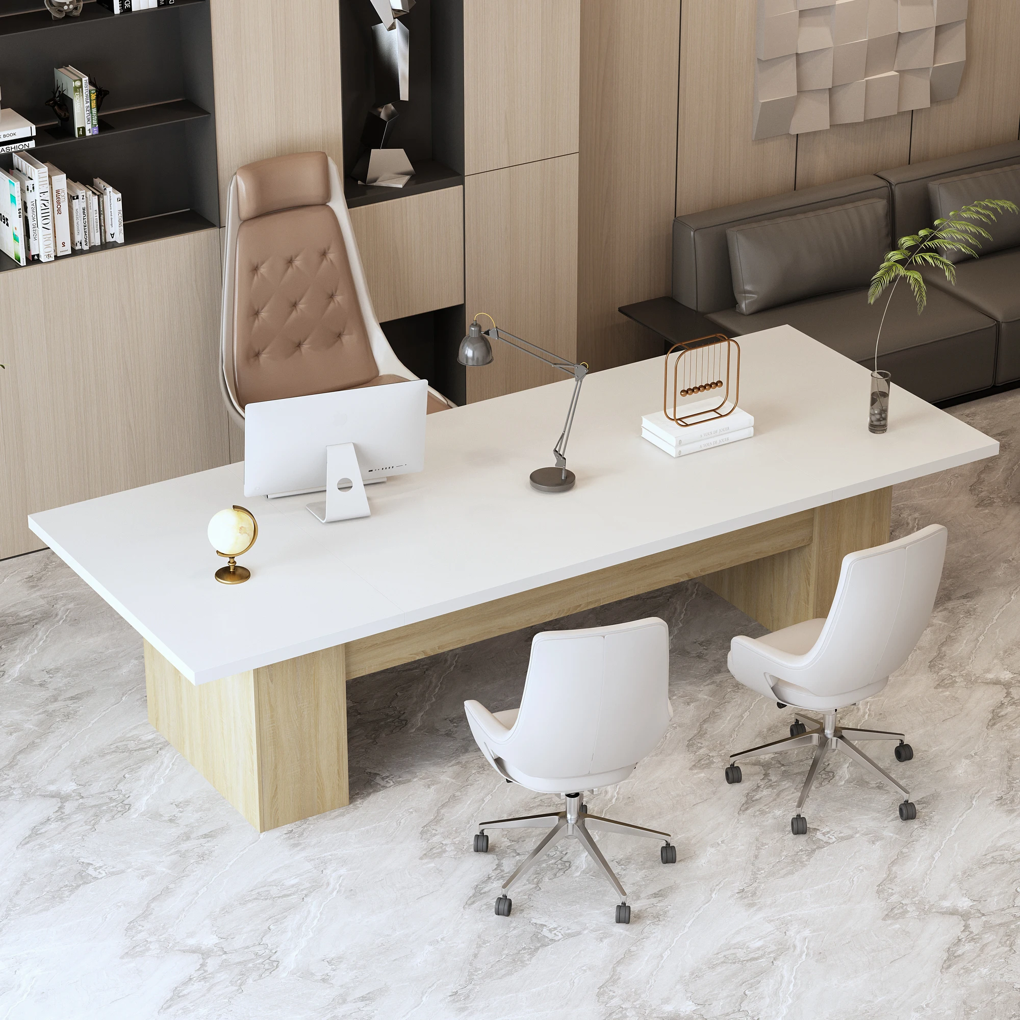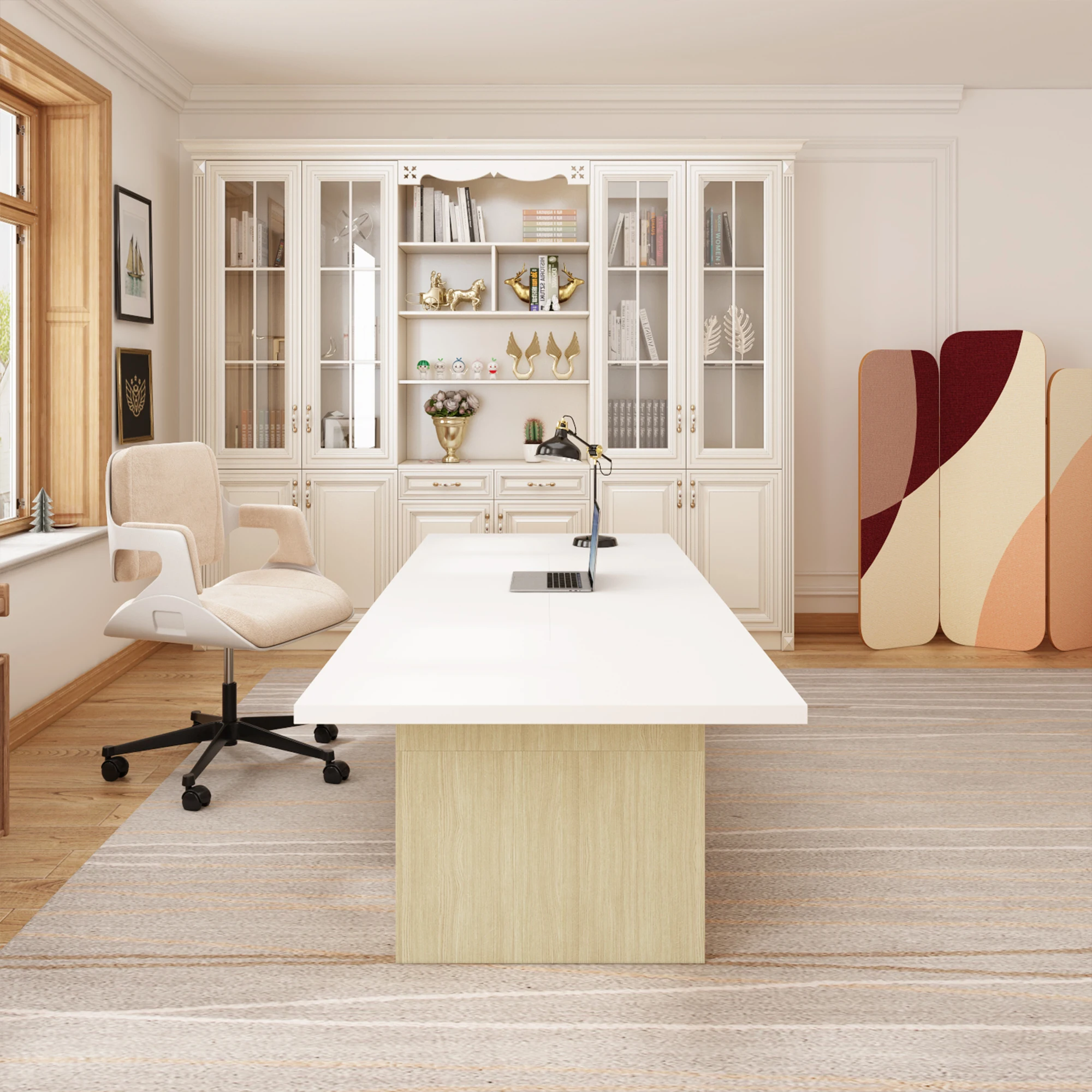 This modern conference table, constructed with P2-grade MDF and solid wood legs, merges safety and sturdiness. The roomy tabletop offers ample space for office necessities during meetings or serving dishes as a dining table. Its sleek white surface and light wood hues bring a chic, contemporary feel to offices, studies, or dining areas. Whether for productive office meetings or cozy family meals, this table meets your needs, making it a smart choice for both work and home life.