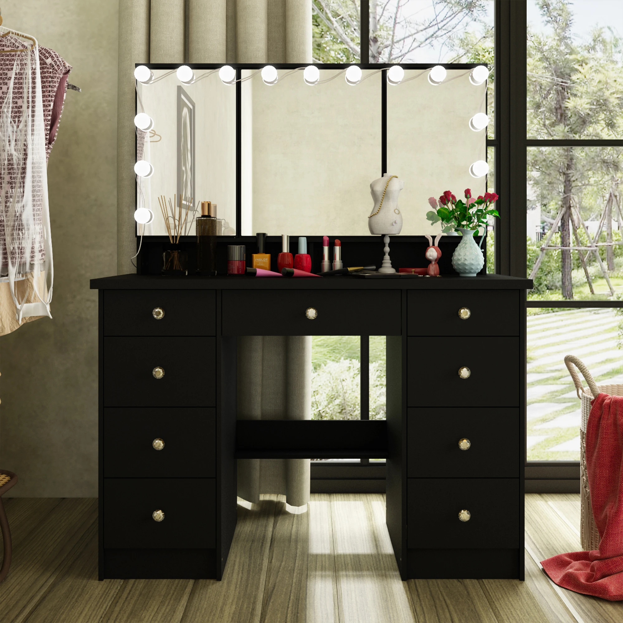 Makeup Vanity Set with Lights, Mirrors & 9 Drawers, Bedroom Dresser with Shelves & Hidden Storage for Women, Black
