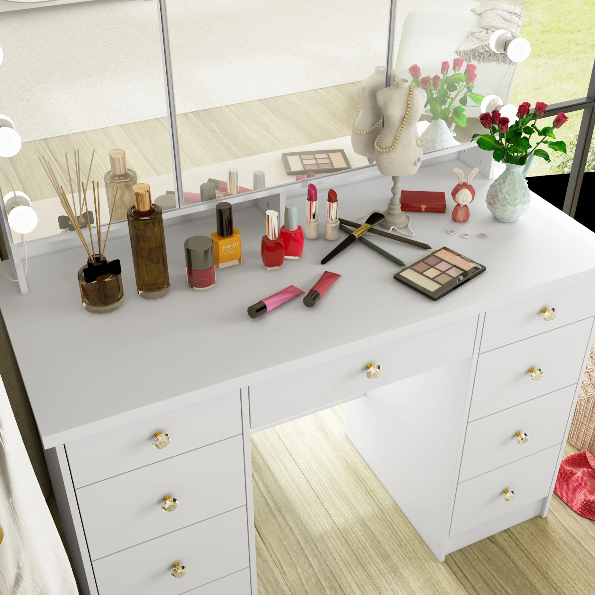 【Spacious Storage】Featuring 9 drawers (silent under-mount slides), multiple open shelves, and a wide tabletop, it holds all cosmetics, brushes, and even decor pieces. No more messy counters—everything stays tidy.
