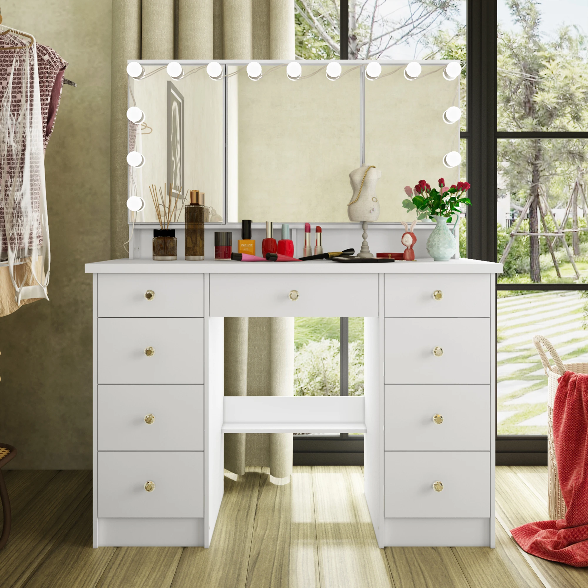 This makeup vanity takes your beauty routine to the next level. It comes with 15 bulbs offering 3 color modes (cool, natural, warm) plus a USB port, so you'll have ideal lighting for any occasion—whether getting ready for work or a night out. Mirror doors open to handy shelves, keeping your skincare and cosmetics organized yet easy to access. With 9 drawers on silent under-mount slides, multiple open shelves, and a wide tabletop, there's ample space for all your beauty essentials, tools, and even decorative items. Crafted from durable P2 grade MDF, it's built to withstand daily use. Plus, the golden crystal handles bring a chic, luxurious vibe to your space, making this vanity dresser both practical and stylish for your bedroom.