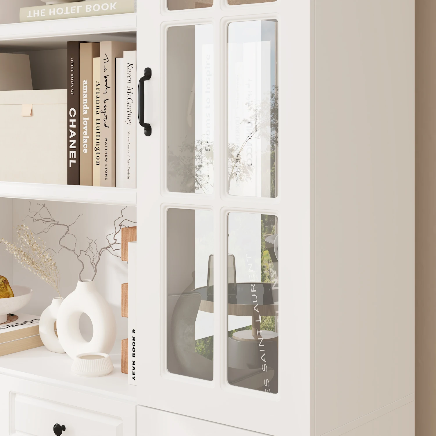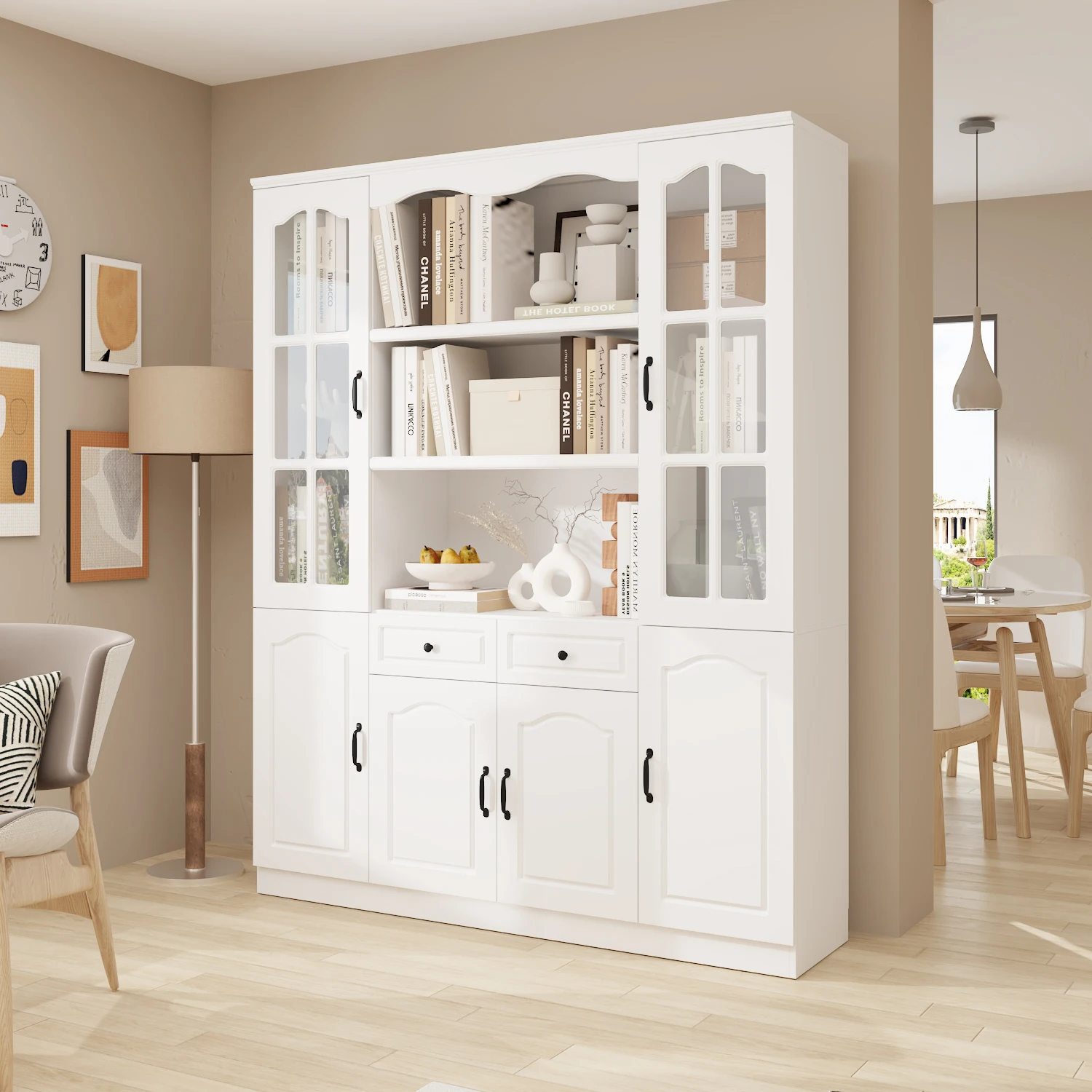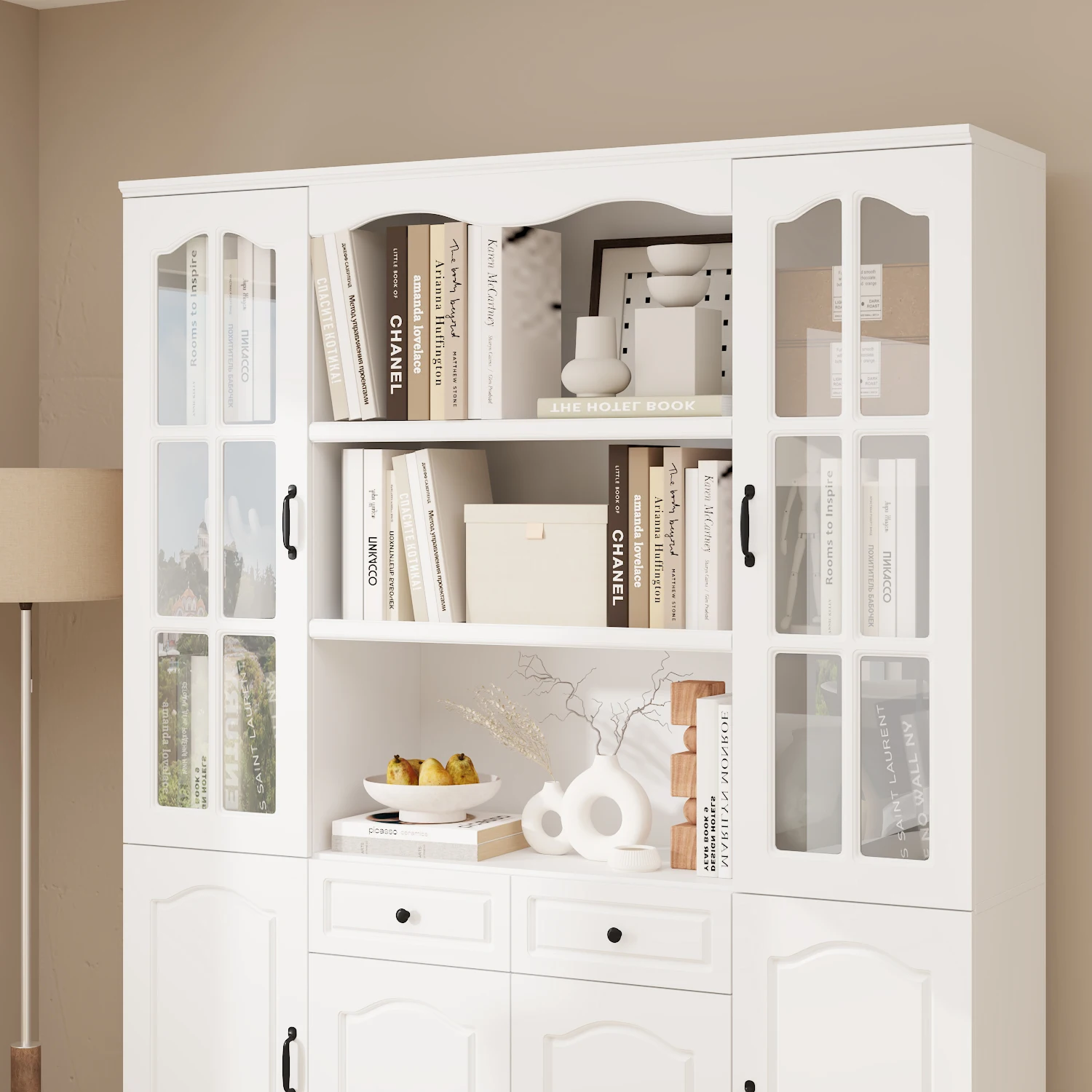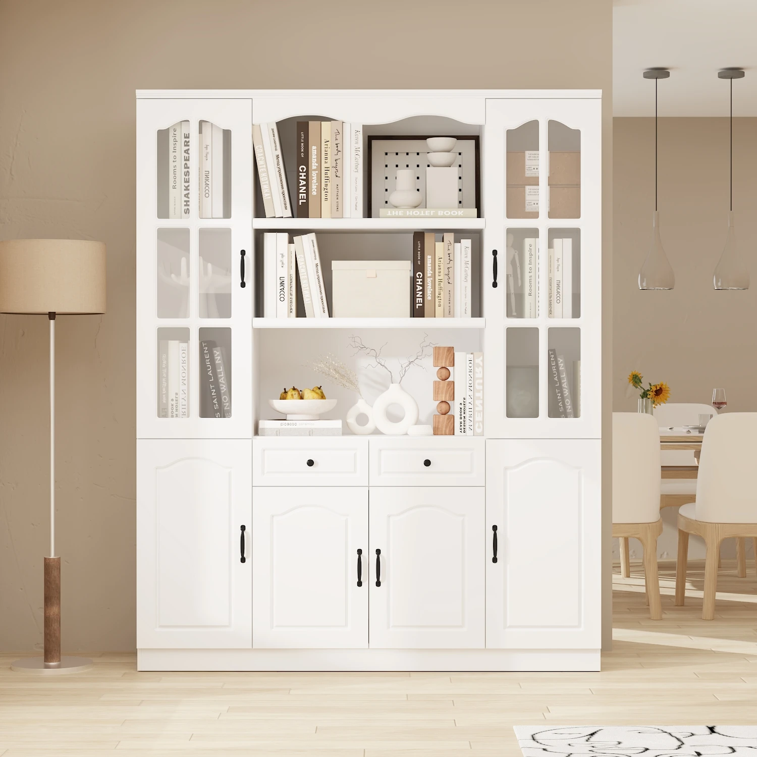 This modern large bookshelf combines style and functionality, featuring a modern appearance, ample storage space, arched glass door design, versatility, and sturdy structure. It provides everything you need to enhance storage in your living room or study. By choosing this bookshelf, it not only meets your storage needs but also enhances the overall appearance and feel of your space.