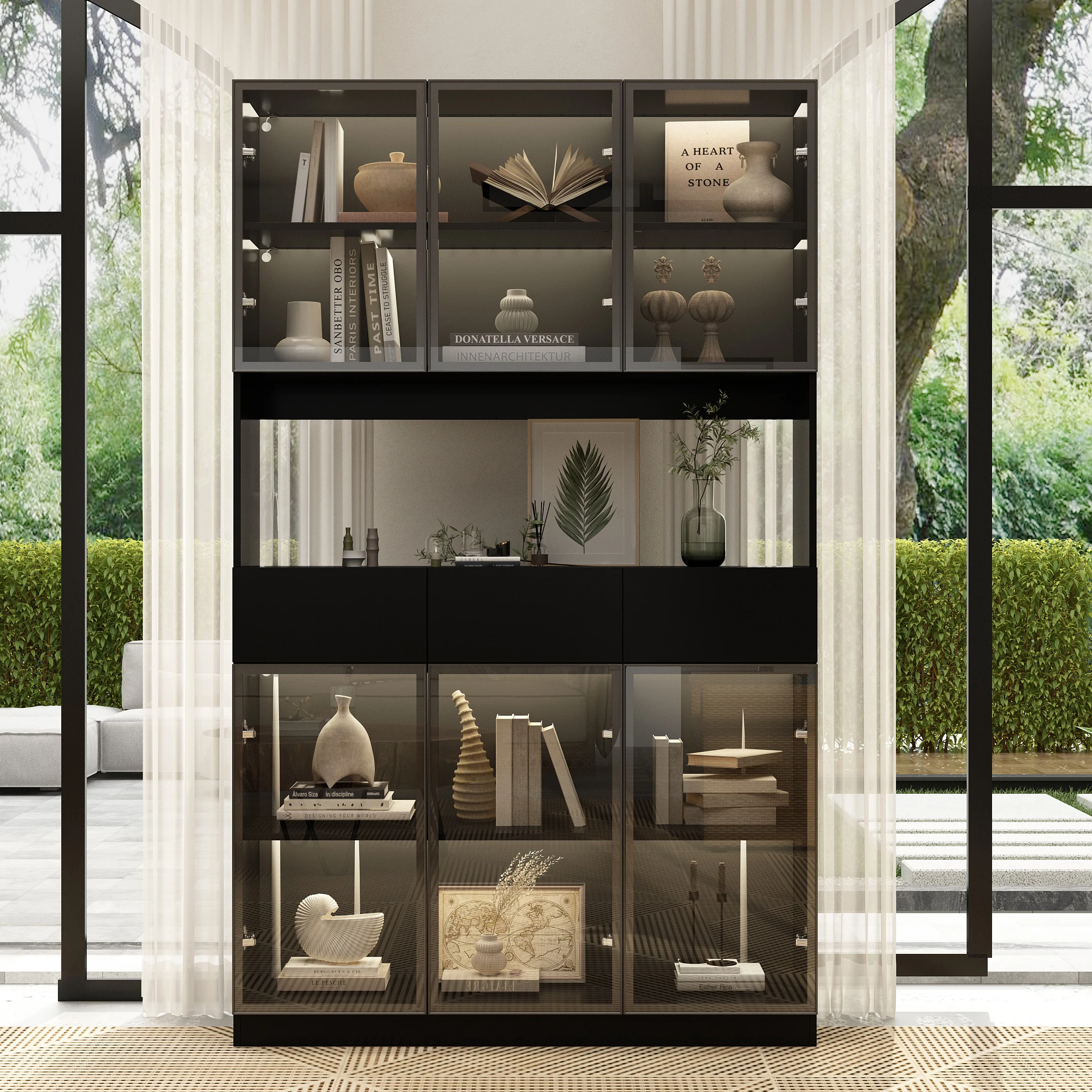 Modern Bookcase Storage Cabinet with 3 Drawers, Shelves & Countertop, Glass Display Cabinet for Living Room, Black