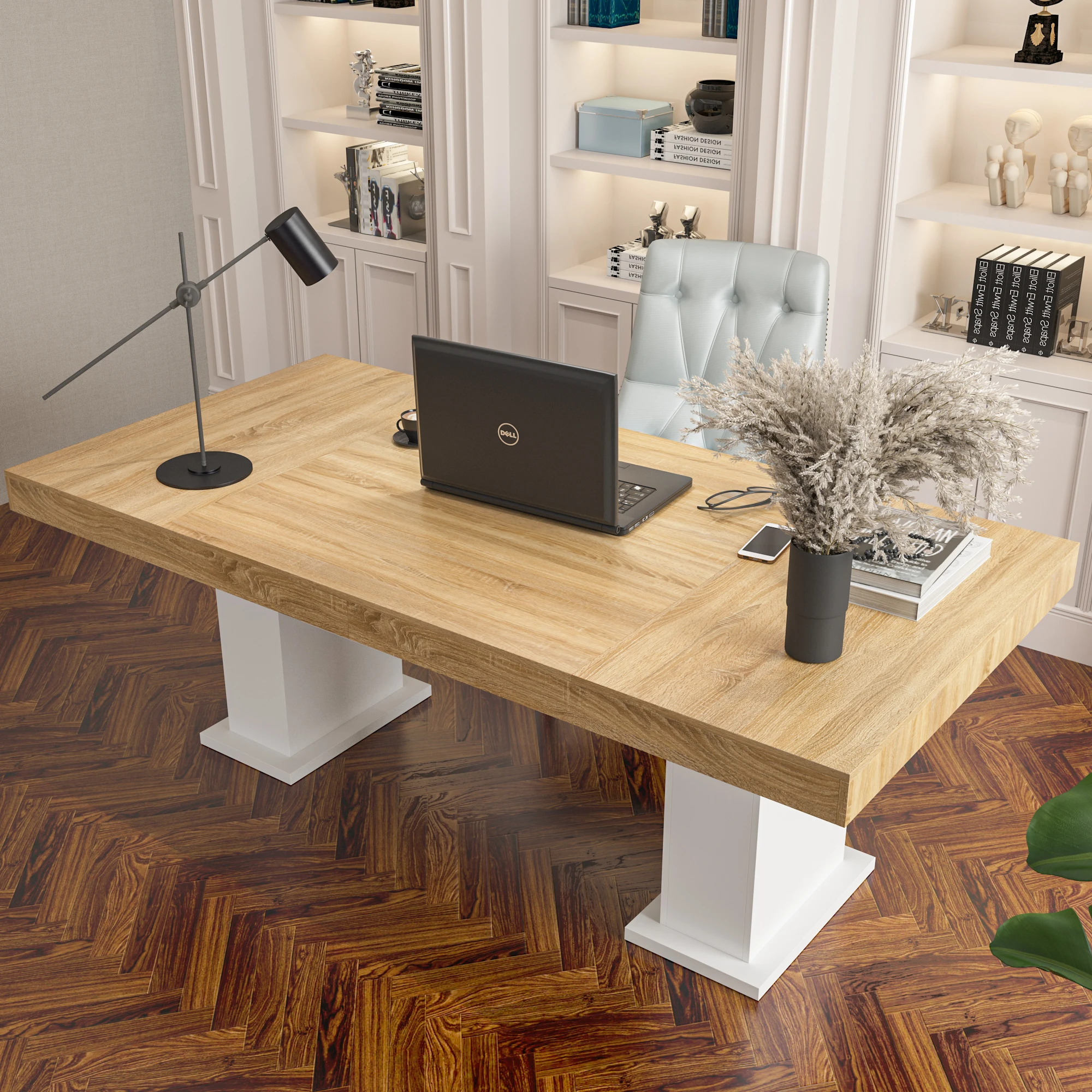 Modern Computer Table For 6 Person, Rectangular Writting Desk Study Table, Wooden Grain Tabletop, White Base