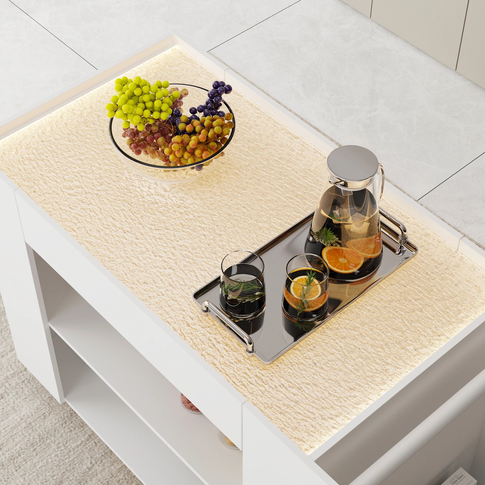This modern kitchen dining cart is equipped with glass countertops, LED lighting, two drawers, open shelves, and towel racks, perfectly blending style and functionality. Its stylish design and multiple storage options make it an ideal choice for anyone looking to improve their kitchen.