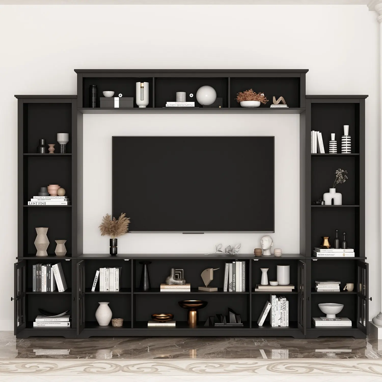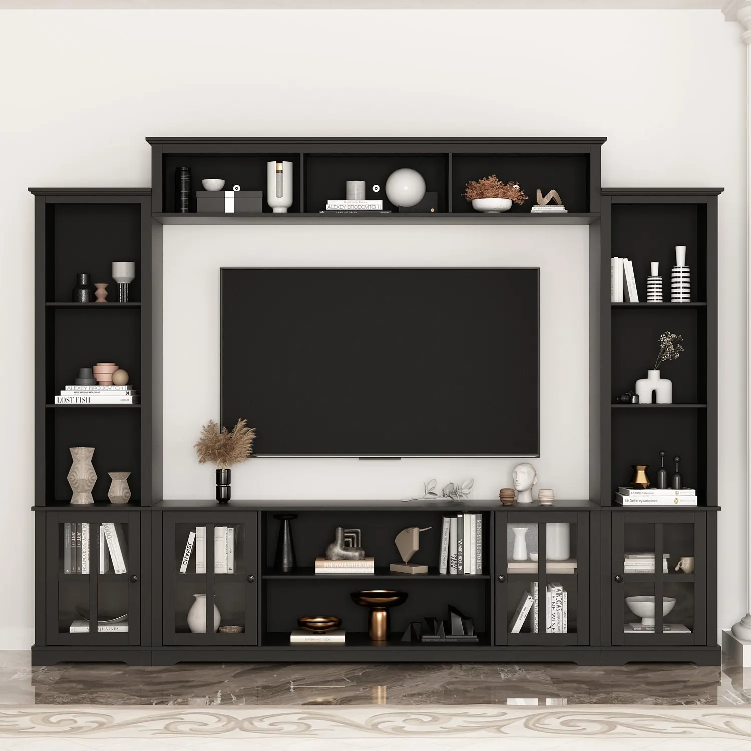 Modern TV Stand for up to 66" TVs, 4-Piece Wall Unit with Bookshelves, Glass Doors & Open Shelves, for Living Room