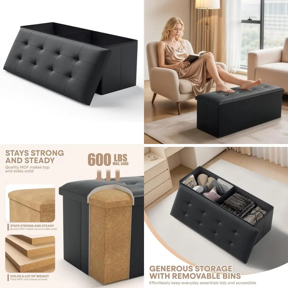 This product offers a choice of three sizes: 43 inches by 15 inches by 15 inches, 30 inches by 15 inches by 15 inches, and 15 inches by 15 inches by 15 inches, making it suitable for any room's aesthetic. It caters to various needs, whether you're seeking additional storage or a more compact design. The ottoman seamlessly fits into any home decor, serving as an ideal storage solution for living rooms, bedrooms, or entryways. Constructed with premium materials, this ottoman ensures durability and is designed to withstand daily use. Its excellent craftsmanship prevents common issues such as breakage or wear, providing lasting reliability and comfort for your home. Beyond being a storage ottoman, it features a soft cushion for maximum comfort, allowing it to be used as a footrest, bench, or storage chest in various settings. It combines comfort with storage, enhancing your space and offering versatility for storing shoes, toys, and more. Precisely sized, the ottoman is available in three dimensions to fit perfectly into any room, whether as a footrest in a bedroom or a stylish storage solution in a living room. It eliminates size concerns and ensures compatibility with your existing furniture. The ottoman not only provides ample storage for items like blankets, books, toys, and shoes but also features a foldable design to maximize space in your home. It's an ideal piece of furniture for room decor that helps keep your space organized and clutter-free, optimizing storage in any room.