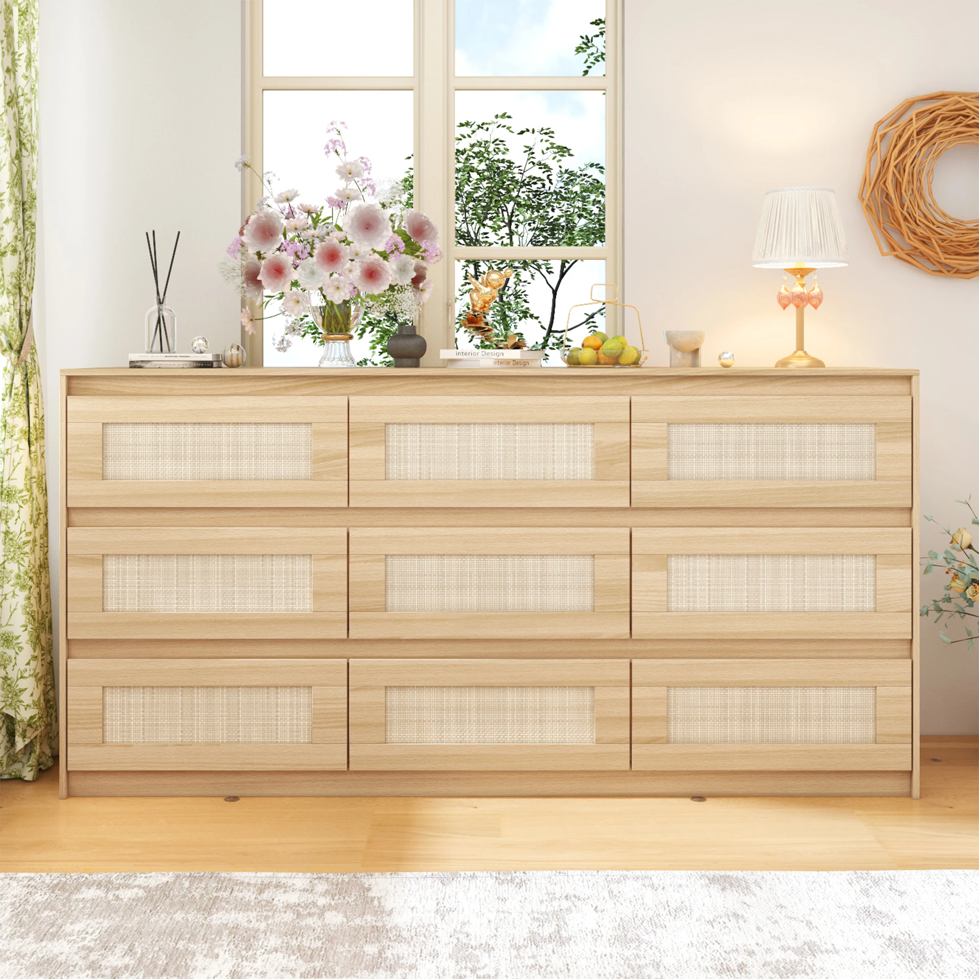 Rattan Sideboard Dresser with 9 Drawers, Wood Handless Chest of Drawers with Spacious Top for Living Room, Bedroom