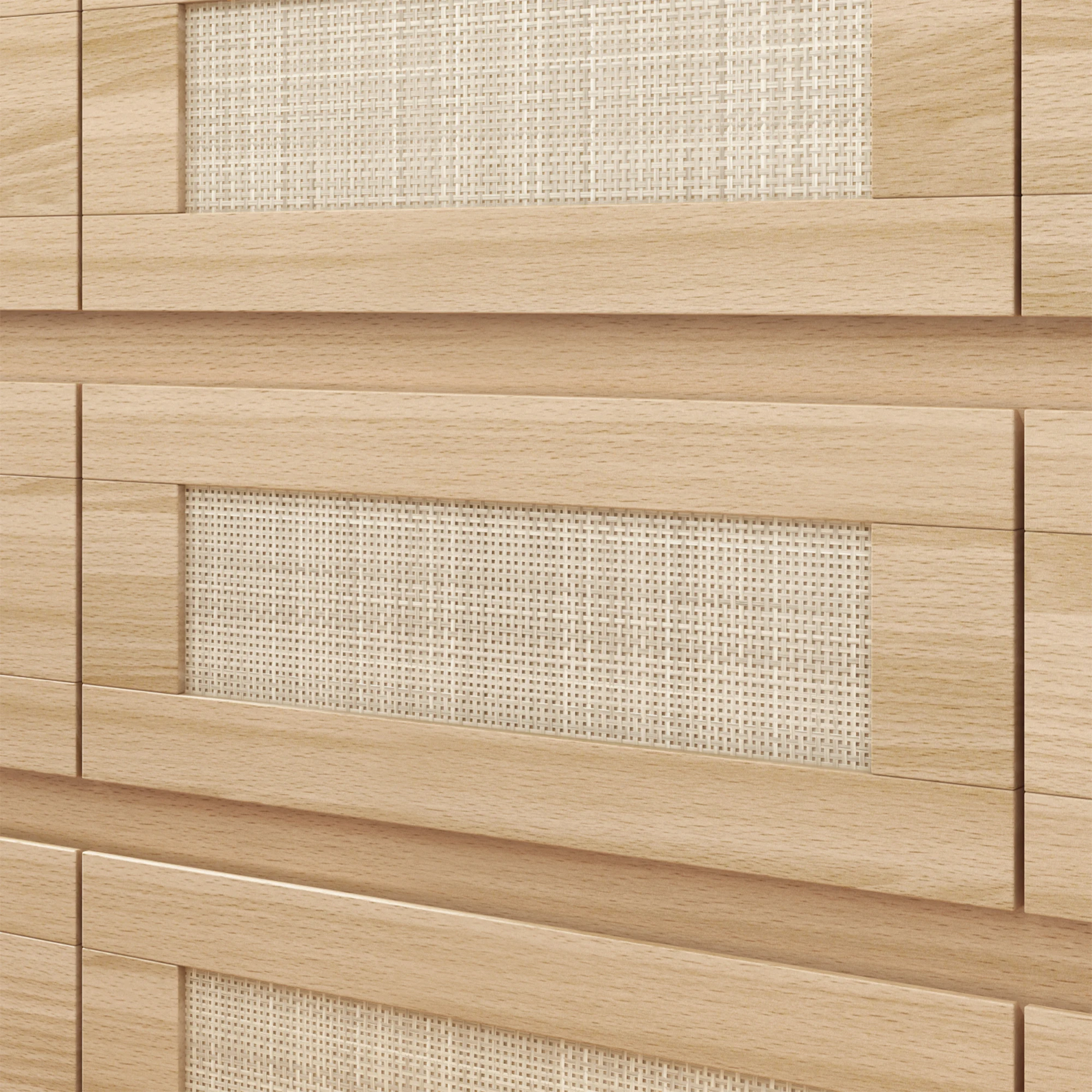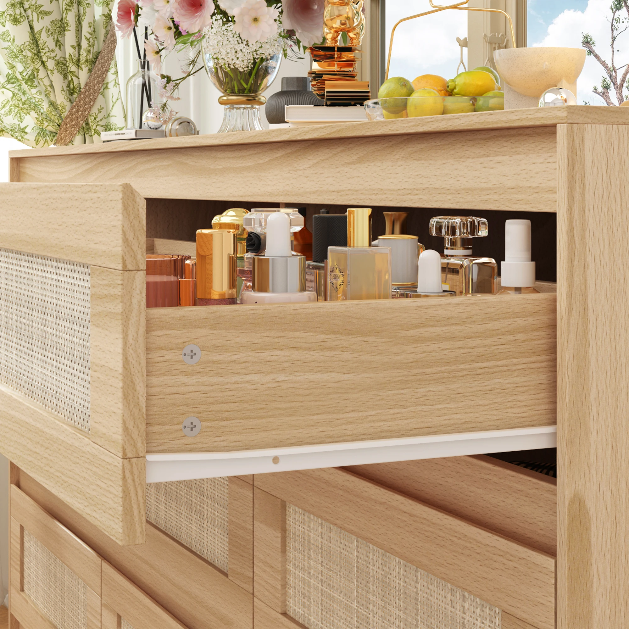 【Elegant Design】This nine-drawer dresser features a sleek oak finish with decorative rattan inserts that add a touch of natural elegance. Its clean lines and warm tones make it a perfect centerpiece for bedrooms, living rooms, or entryways, blending seamlessly with both modern and traditional decor.
