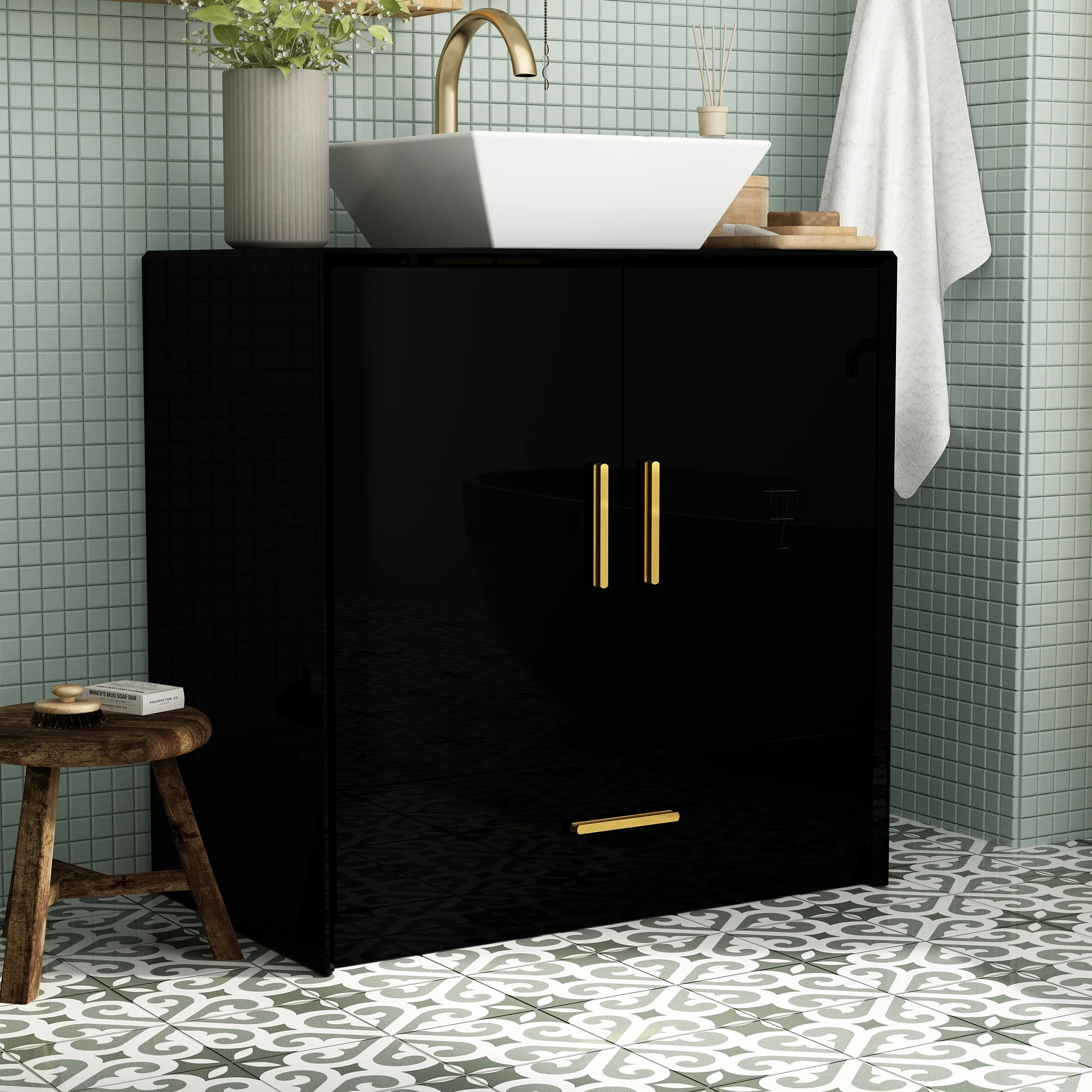 Standing Bathroom Cabinet with Drawer, 2 Doors & Ceramic Basin, High Gloss Vanity with Gold Handles & Adjustable Shelf