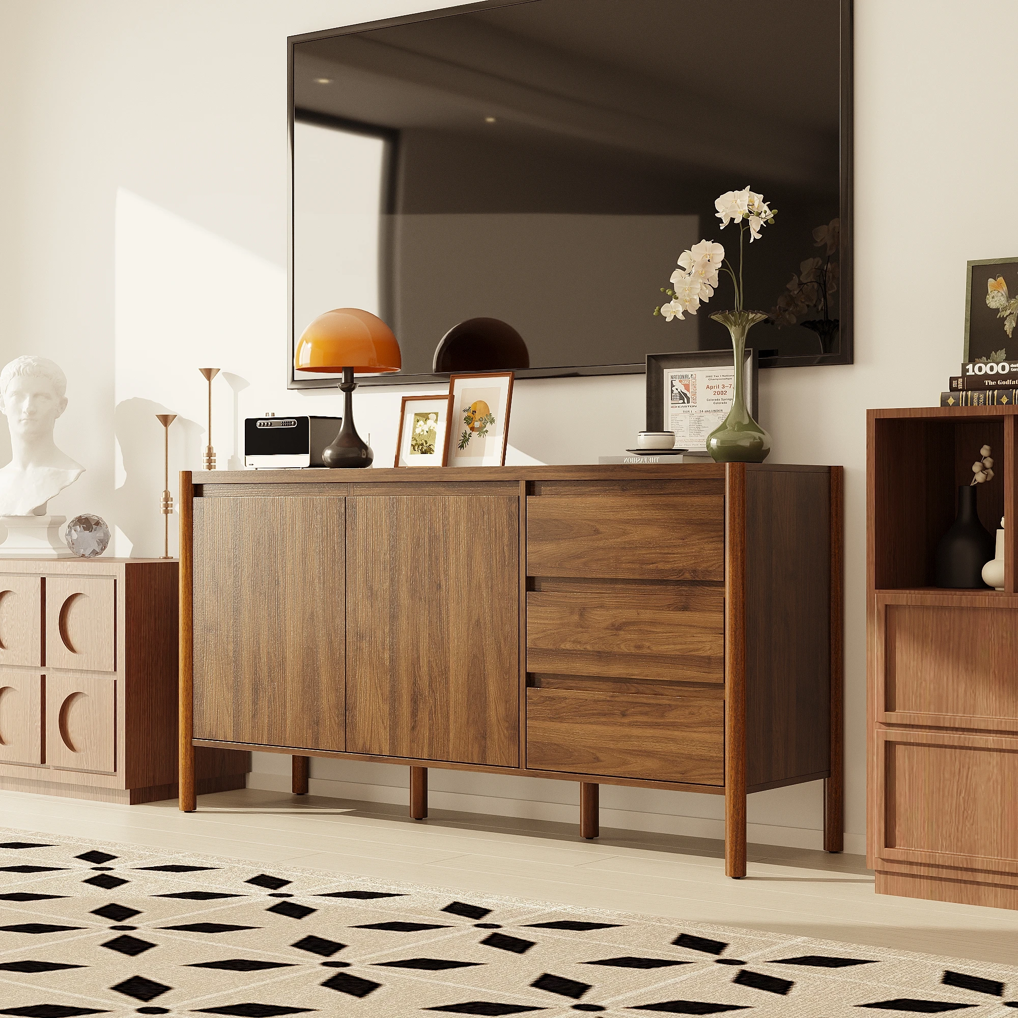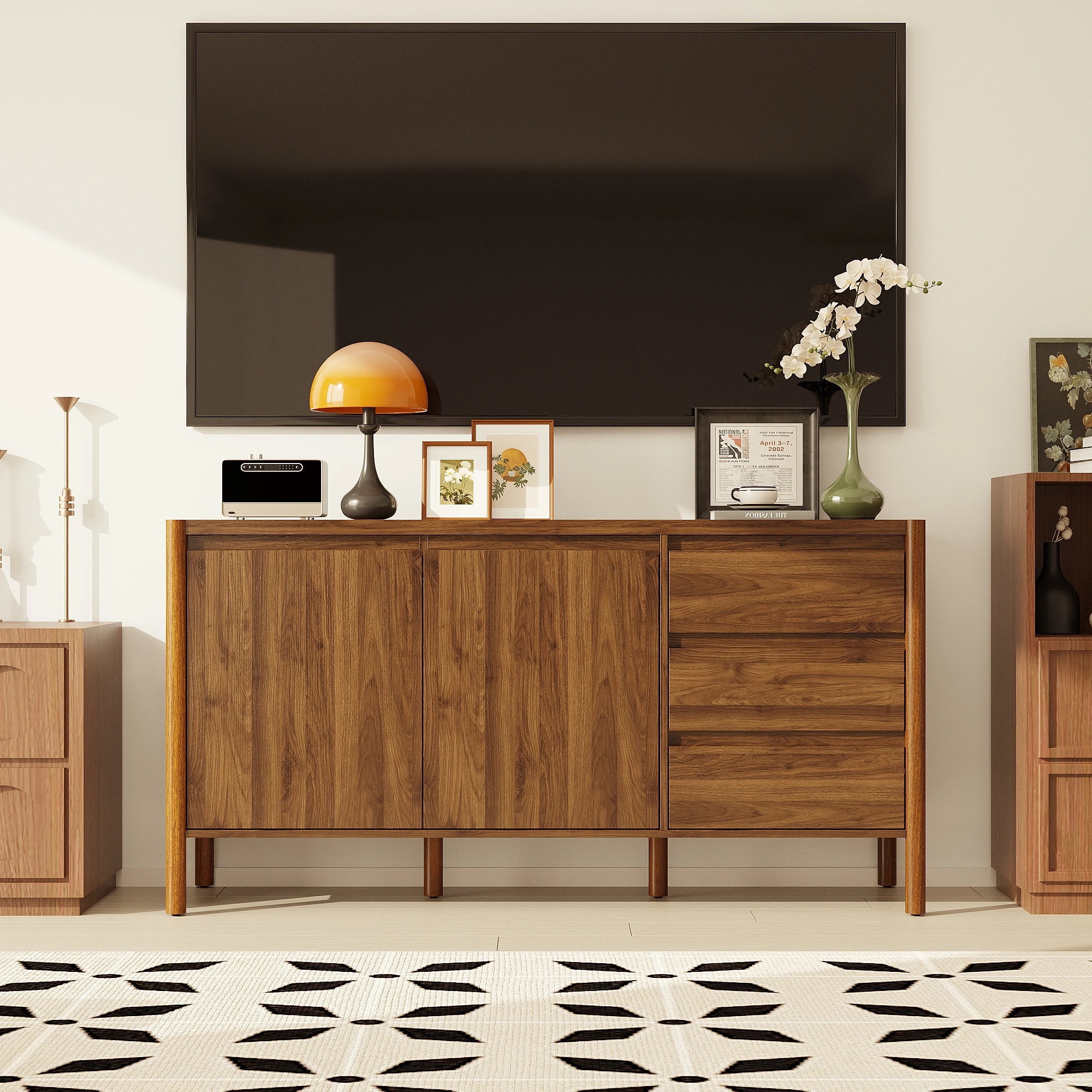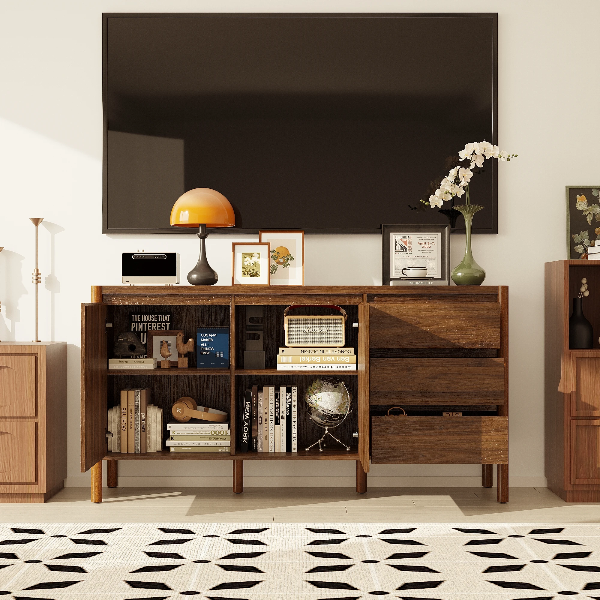 TV Cabinet with 3 Drawers & 2 Doors, Handless TV Stand Dresser with Rounded Legs & Spacious Top for Living Room, Brown