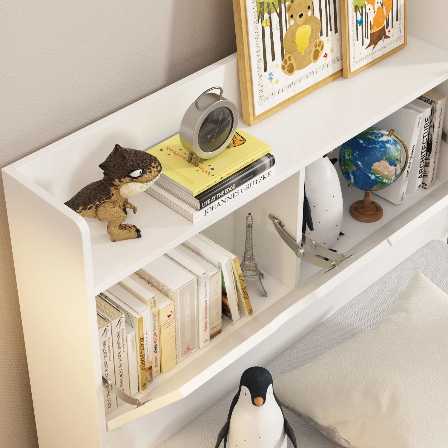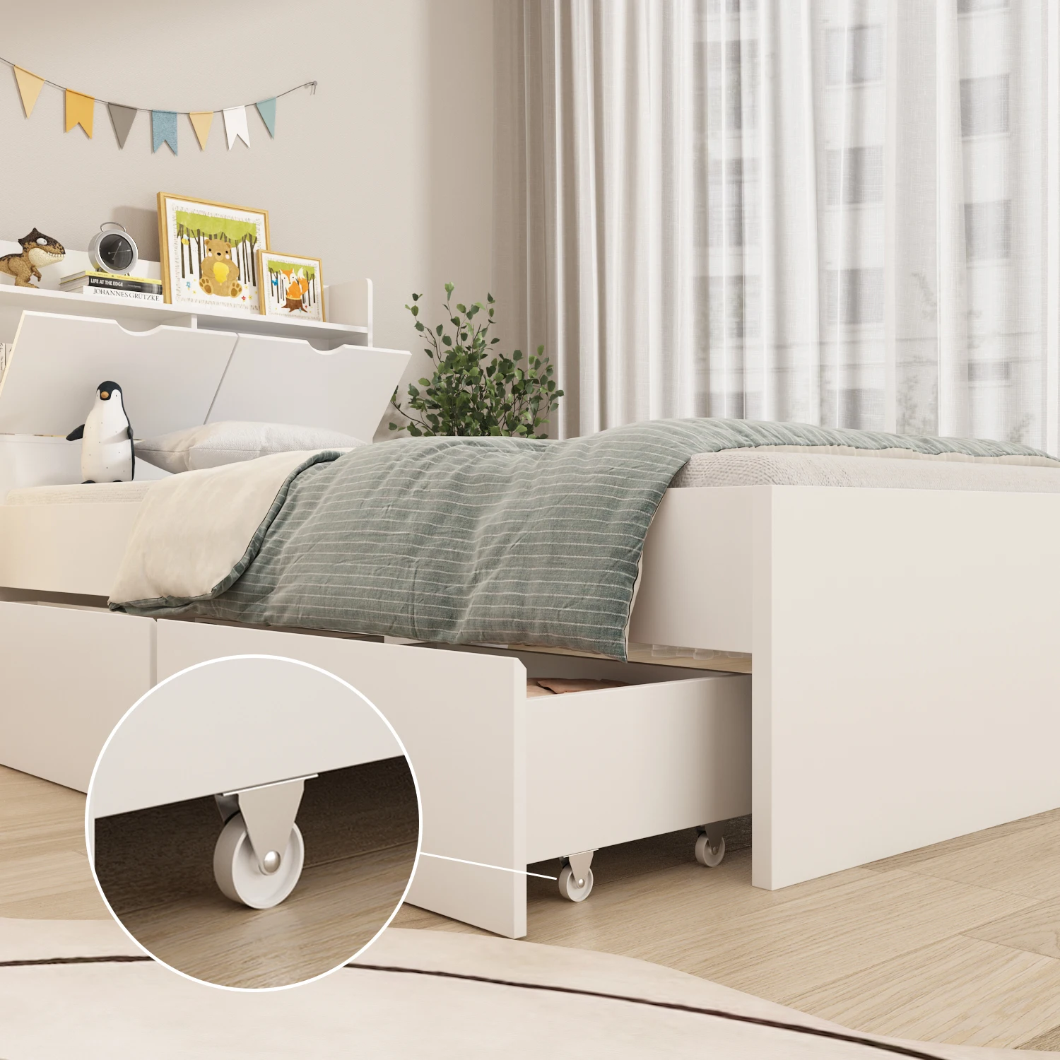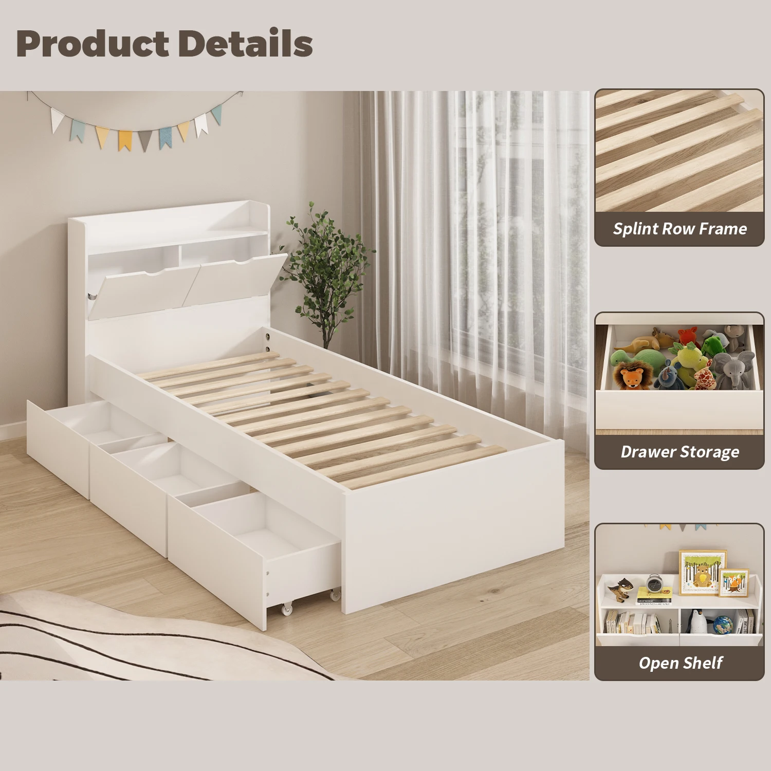 Twin Bed Frame with Storage Headboard & 3 Drawers, Wood Platform Bed with Open Shelves & Trundle for Bedroom, White
