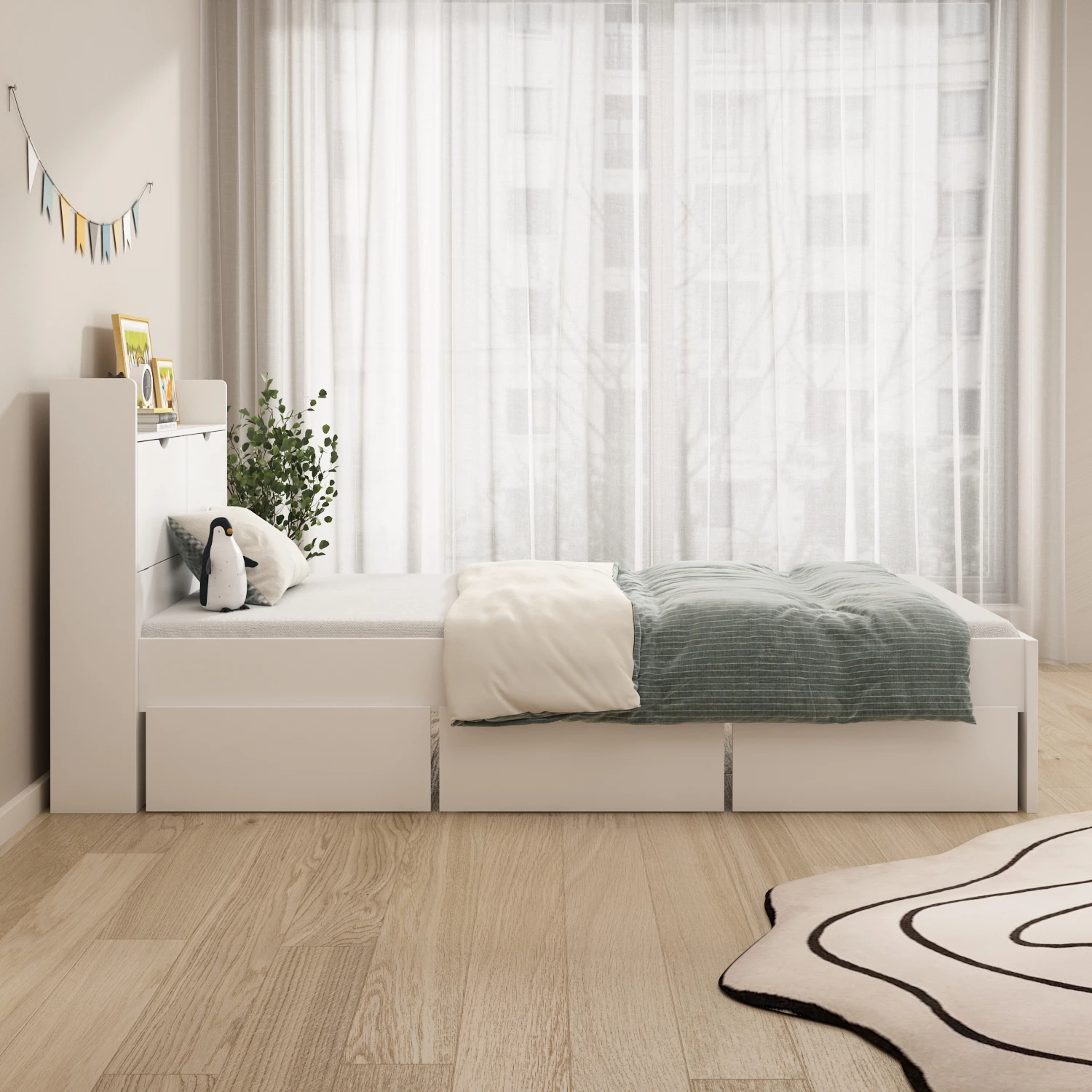 【Storage Solutions】This single bed comes with two spacious drawer storage compartments and an open shelf at the headboard, offering versatile storage solutions for clothing, books, or toys, keeping your room tidy and organized without sacrificing comfort.